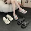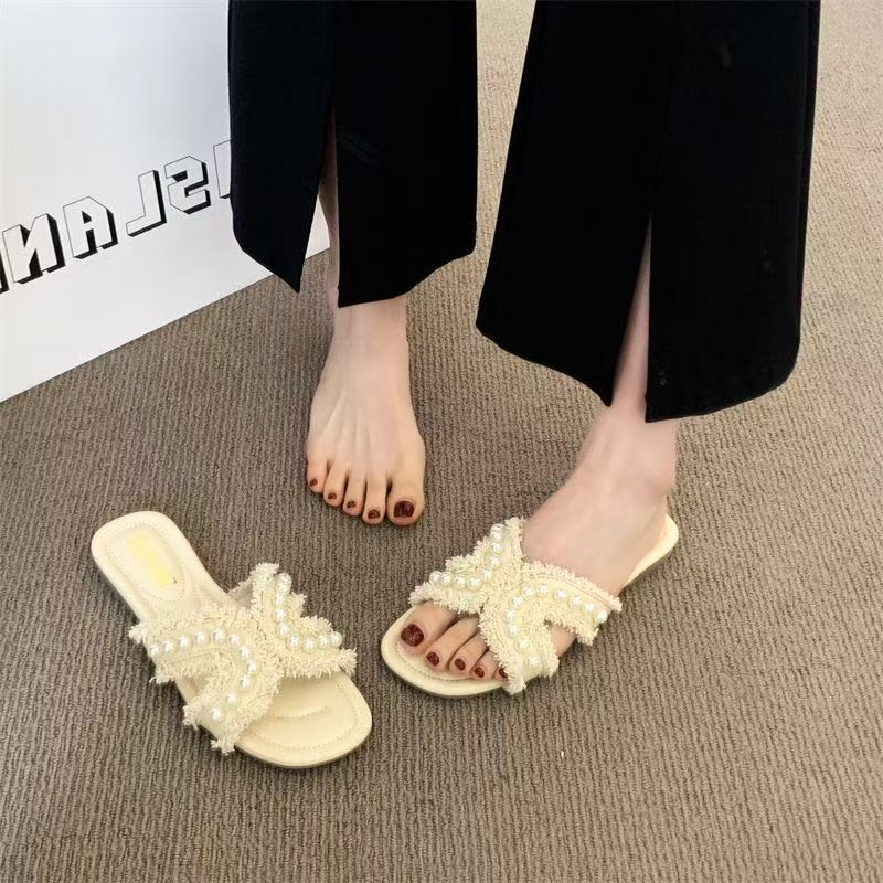 Zapatillas planas de moda francesa para mujer, cómodas, de suela blanda, tipo bailarina, versátiles, con perlas, sandalias de playa 2025 verano nuevo estilo