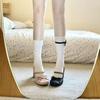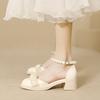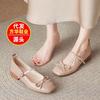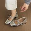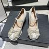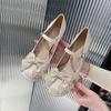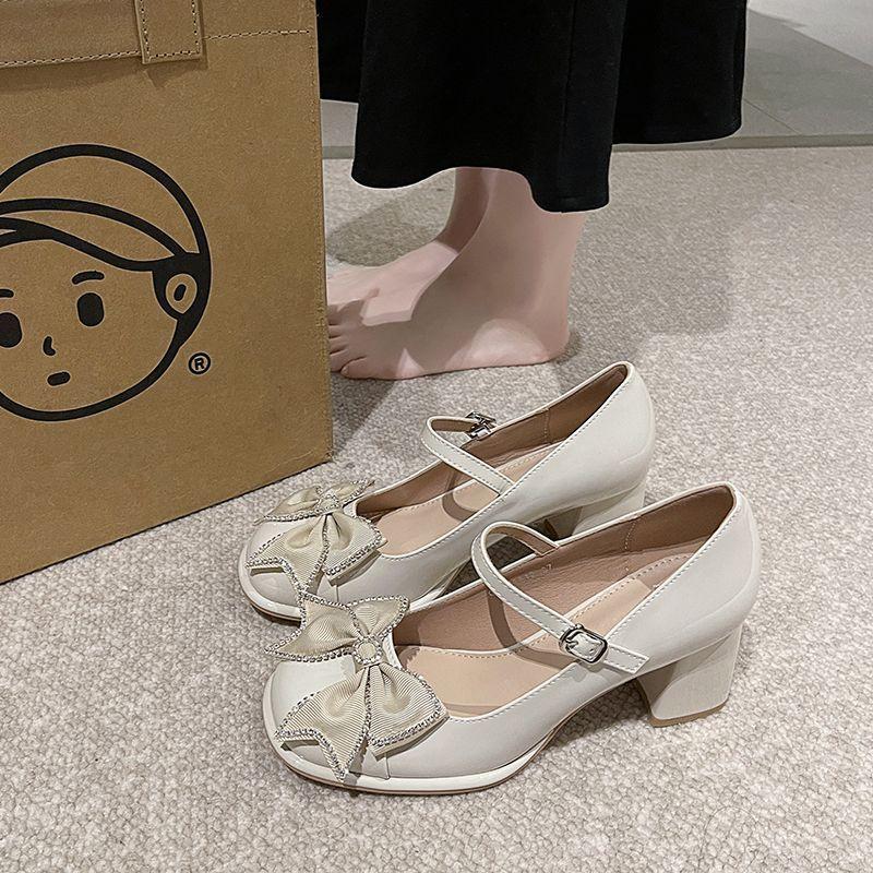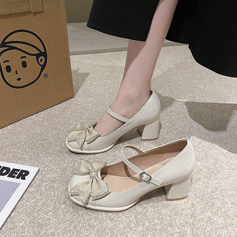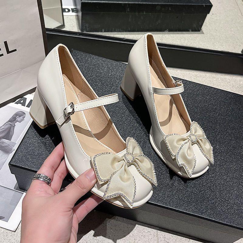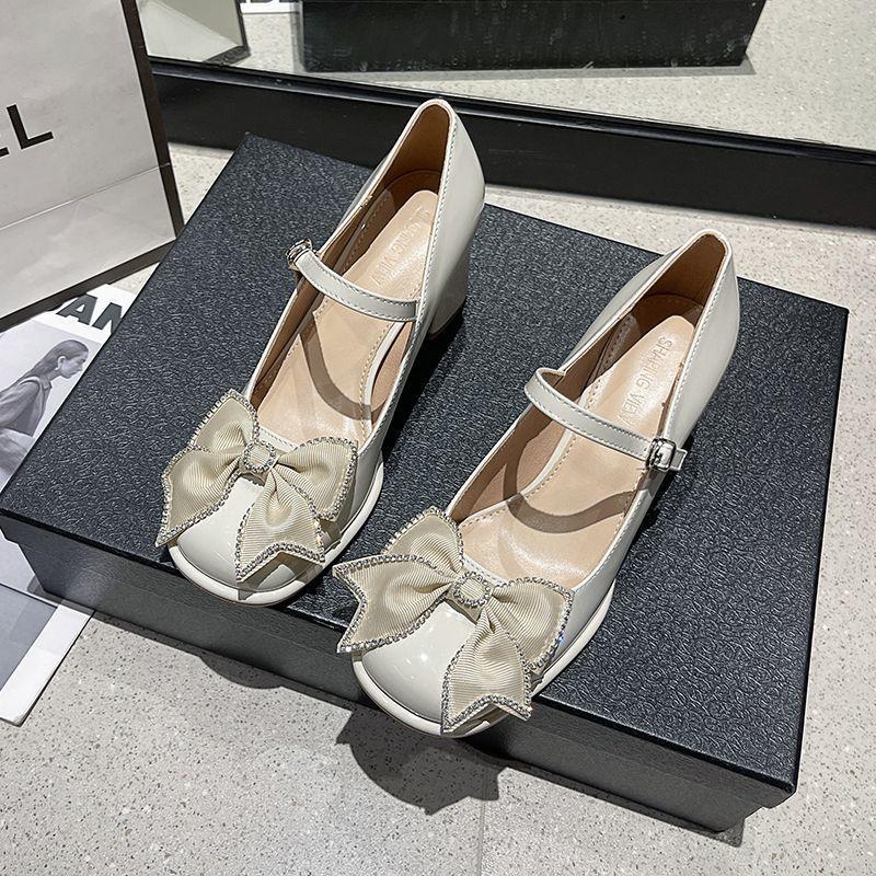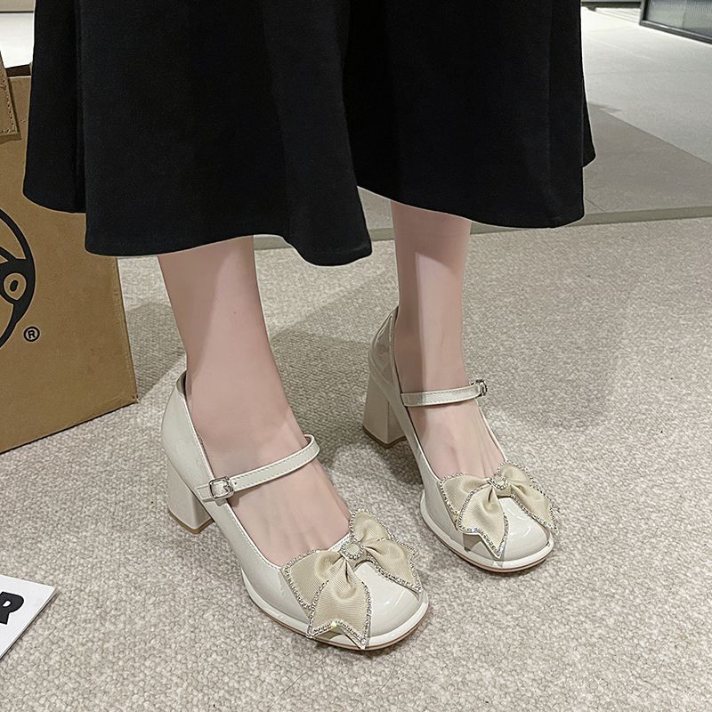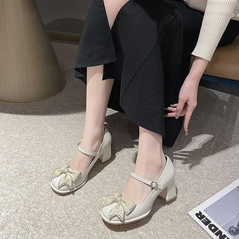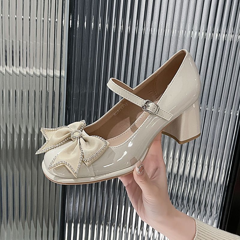 Tacones Altos de Estilo Suave para Mujer Primavera y Verano 2025 Zapatos Mary Jane con Lazo y Pedrería Tacón Grueso Correa Flats con Falda