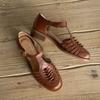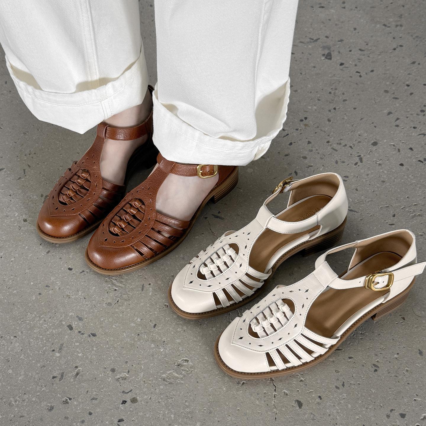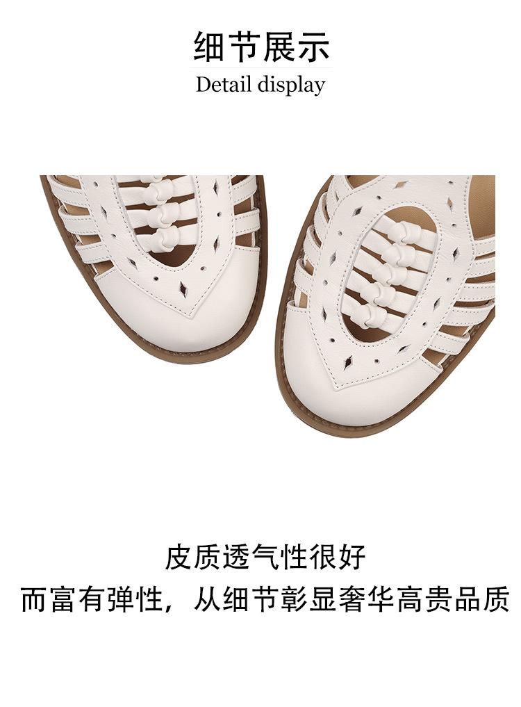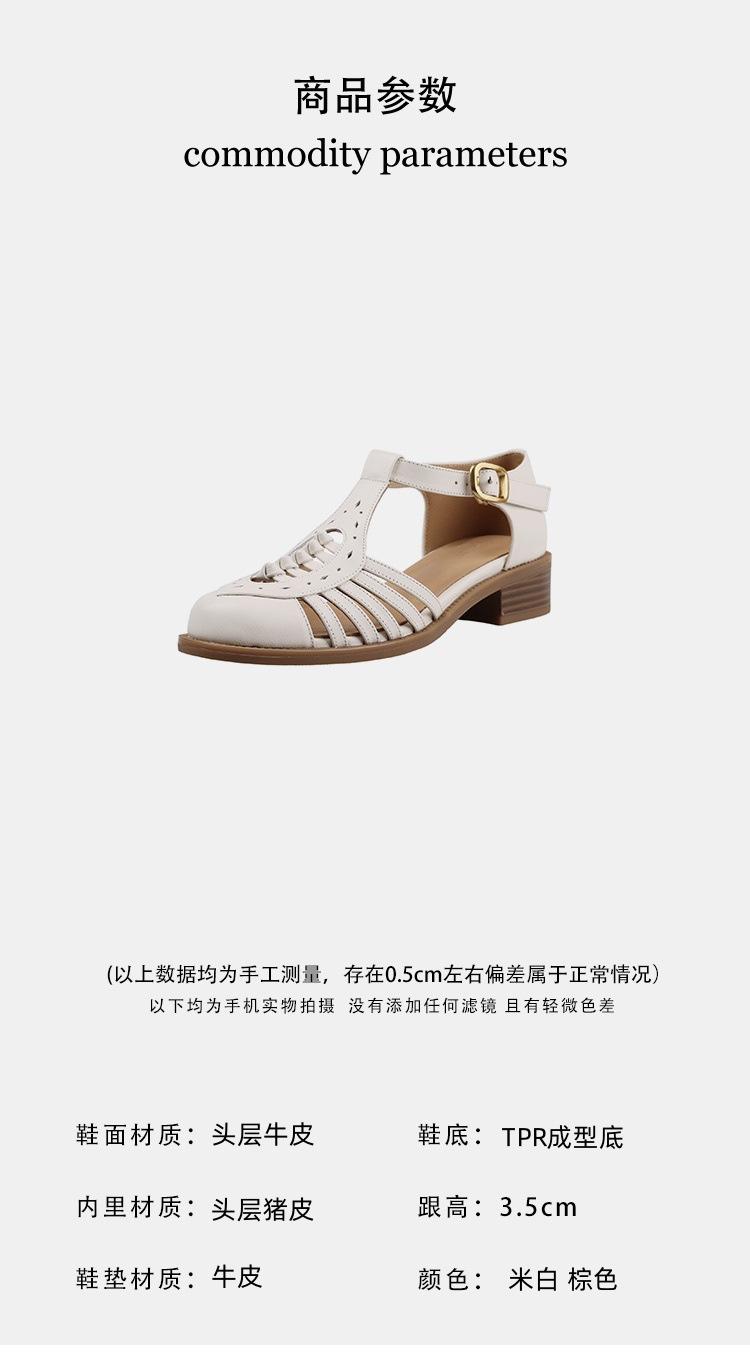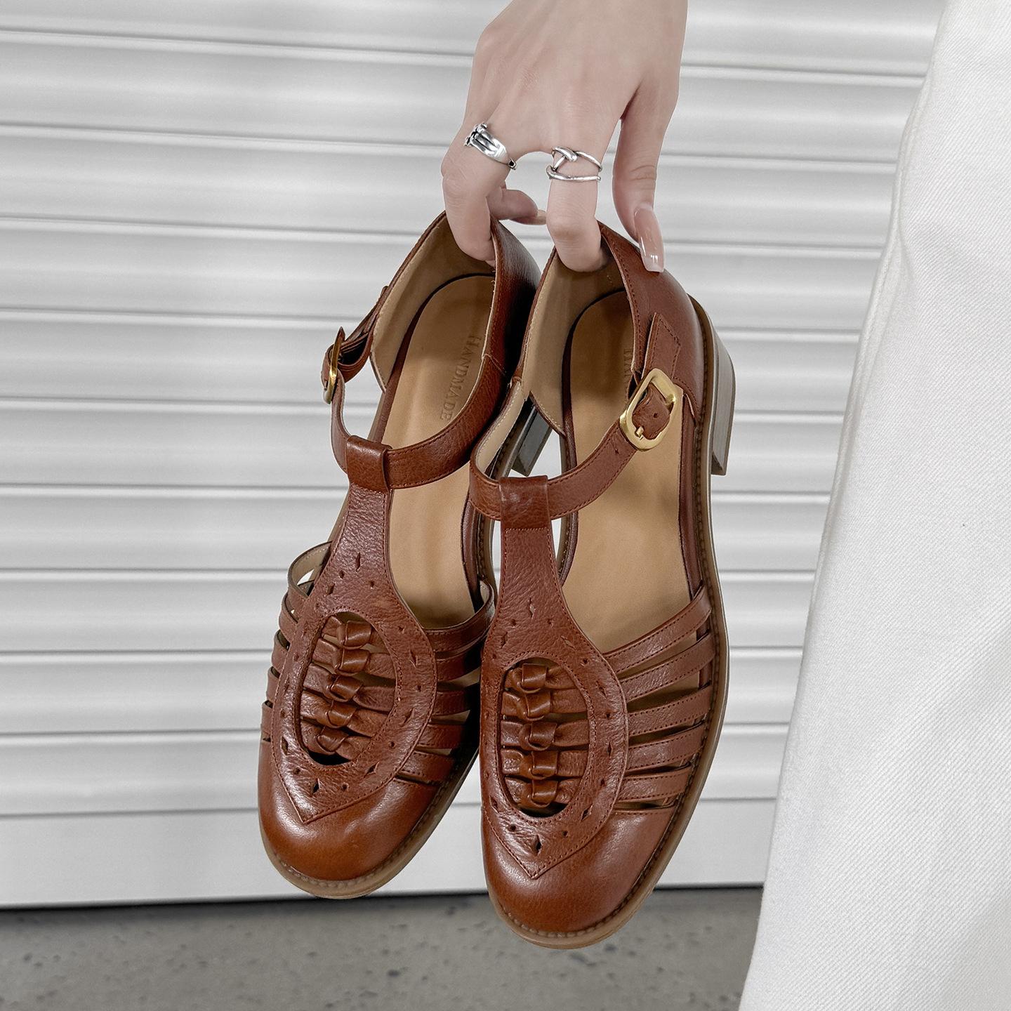 Sandalias de Puntera de Cuero Vacuno de Primera Capa 2025 para Mujer, Zapatos de Mamá de Verano Nuevos de Tacón Medio con Recortes de Suela Gruesa, Versátiles
