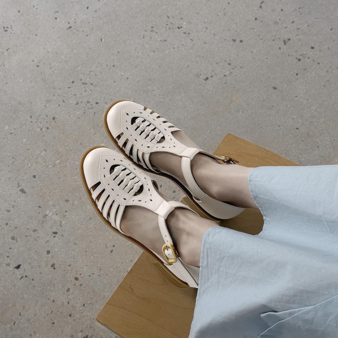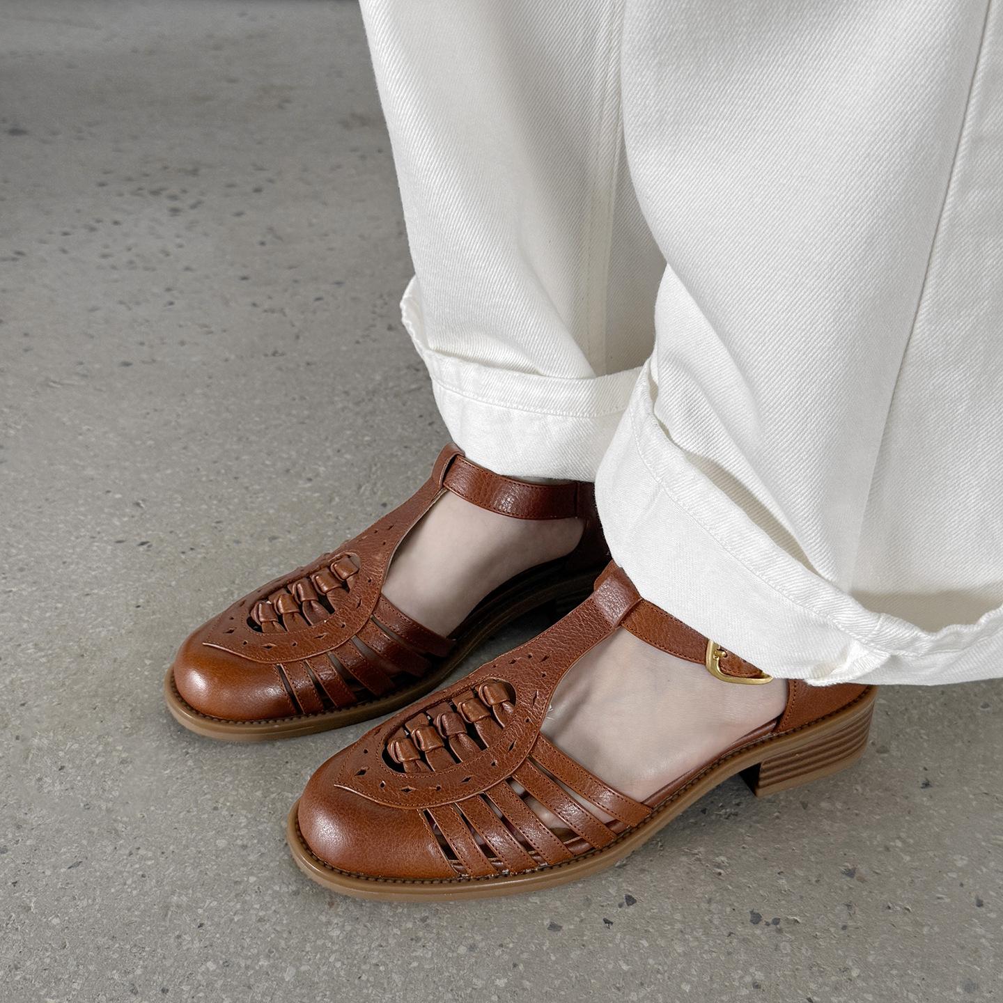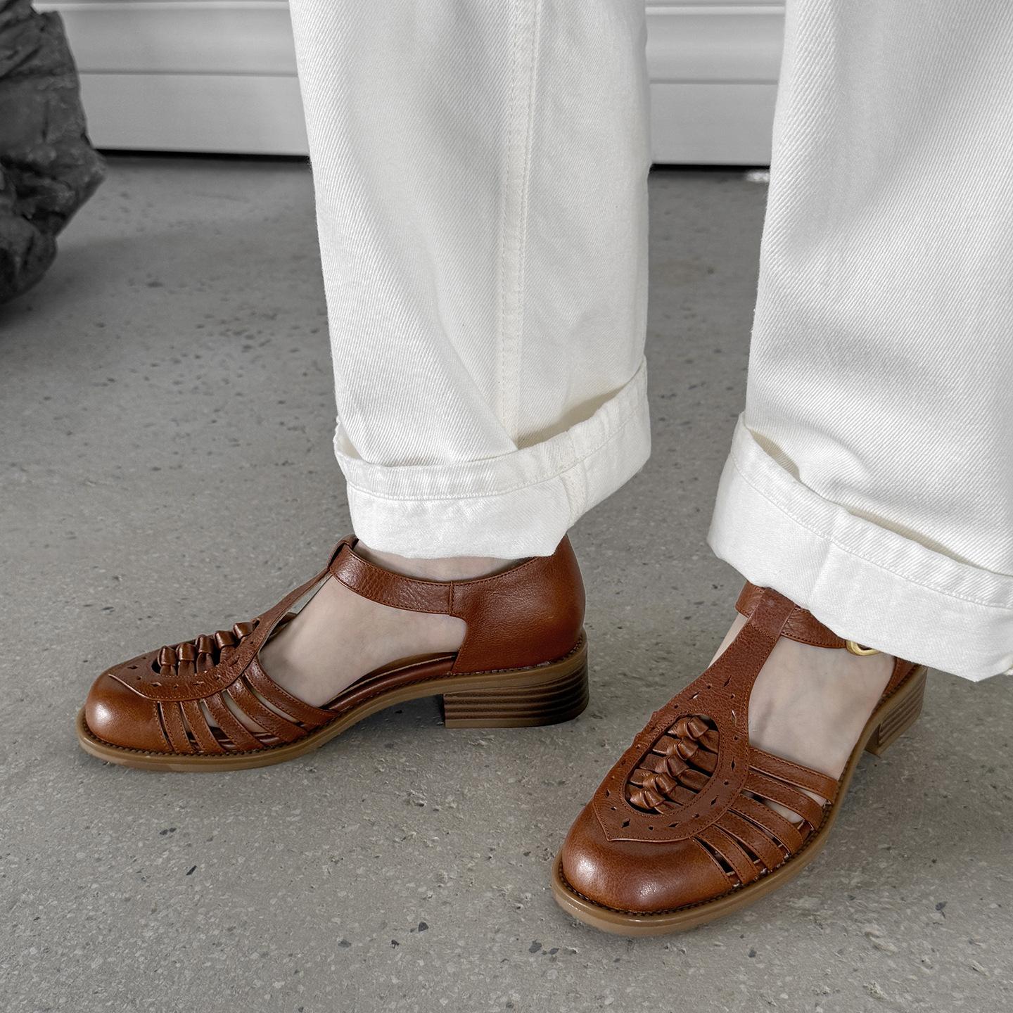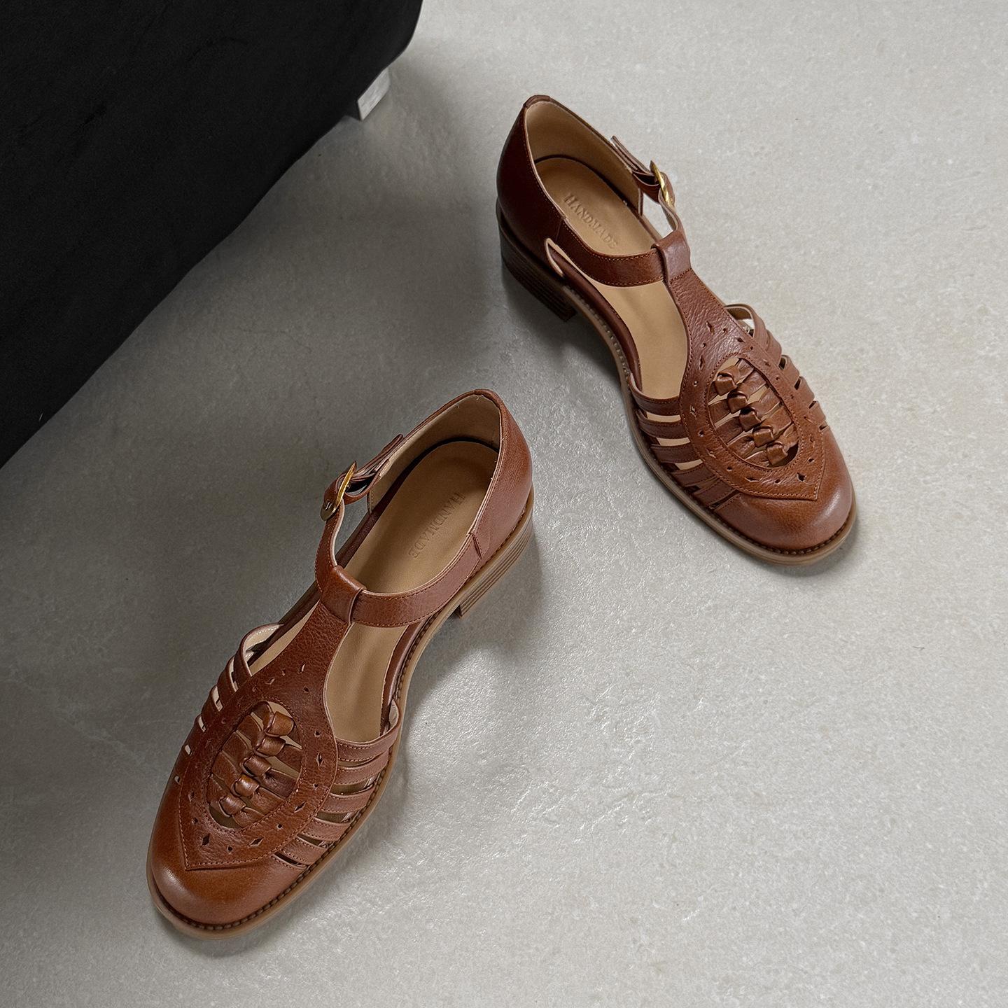 Sandalias de Puntera de Cuero Vacuno de Primera Capa 2025 para Mujer, Zapatos de Mamá de Verano Nuevos de Tacón Medio con Recortes de Suela Gruesa, Versátiles