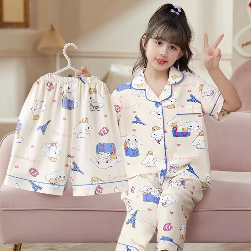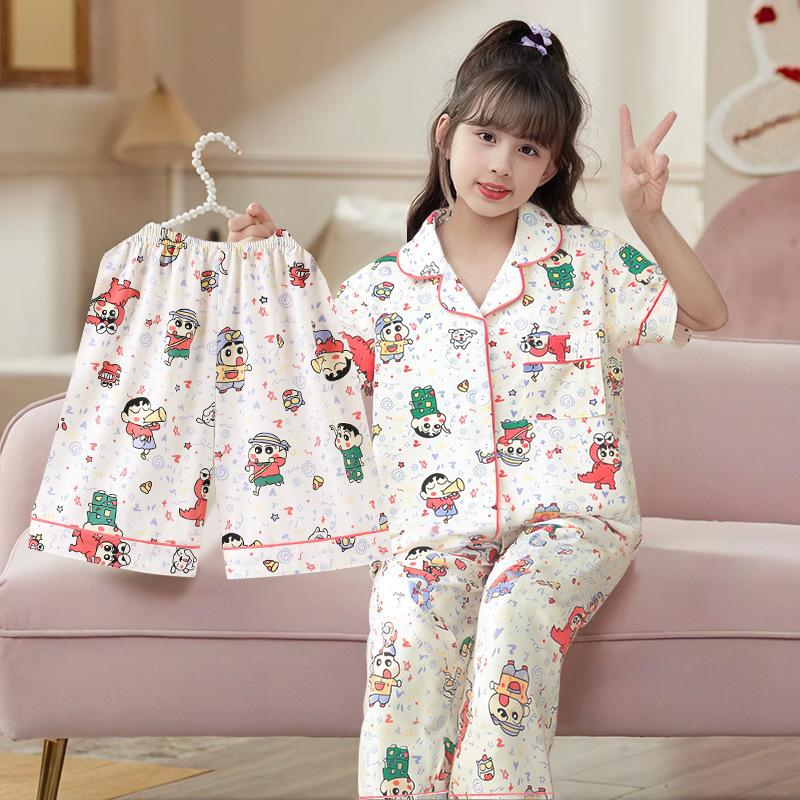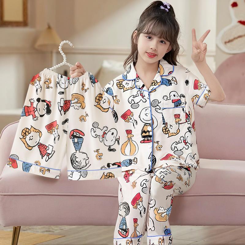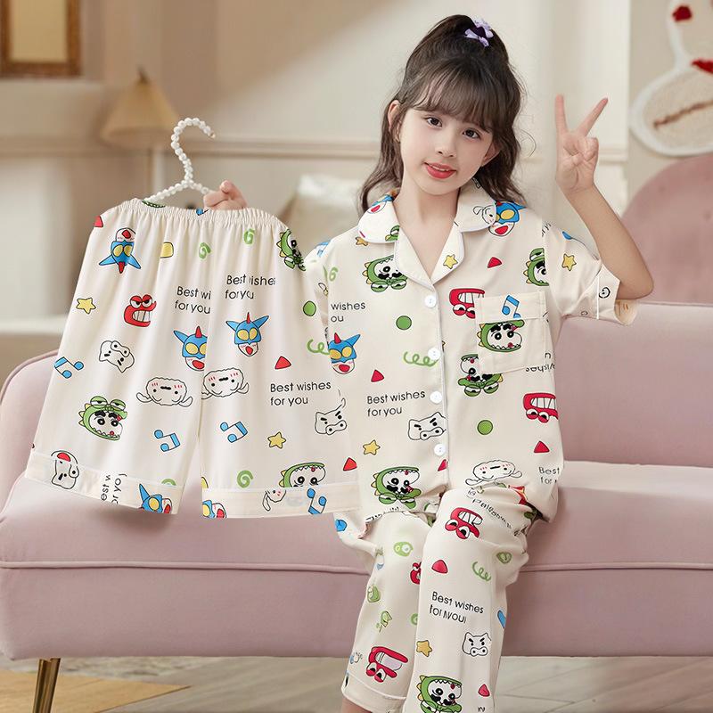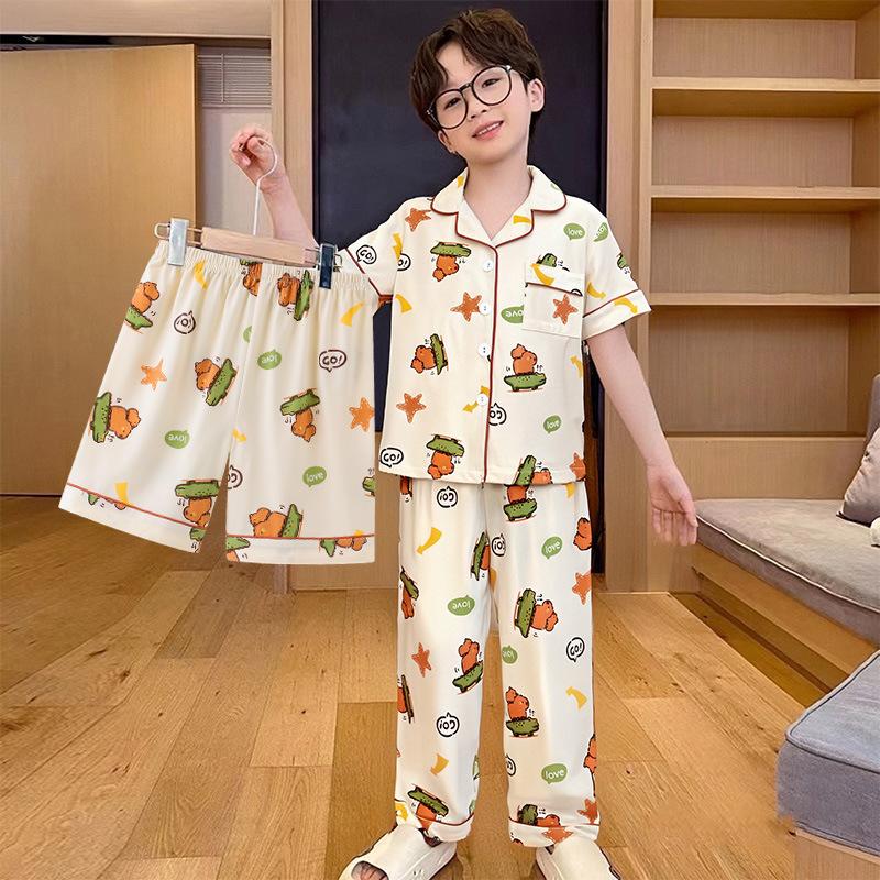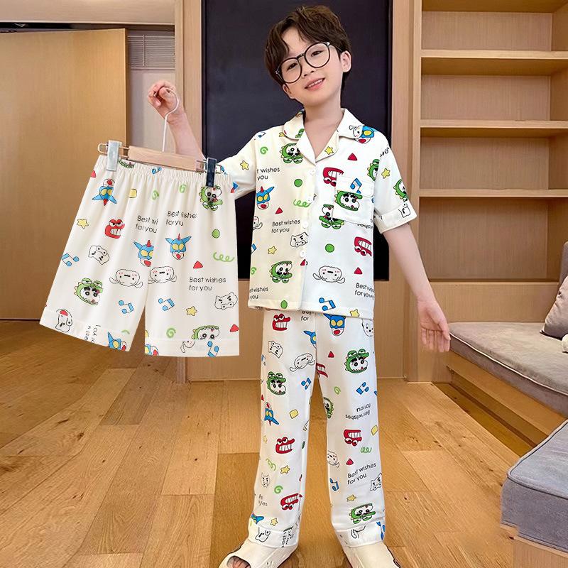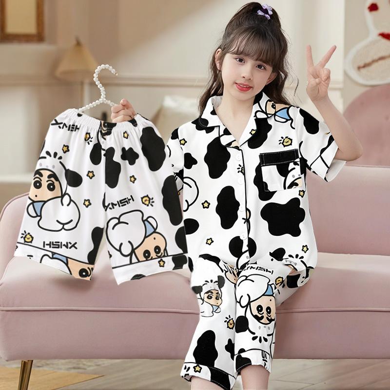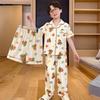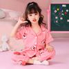 Pantalones cortos de verano para niños de manga corta Seda de leche Imitación algodón Solapa Dibujos animados Niños y niñas Cárdigan Pijama traje Ropa para el hogar