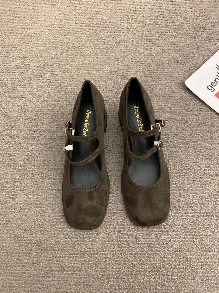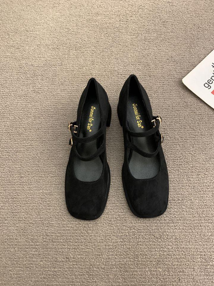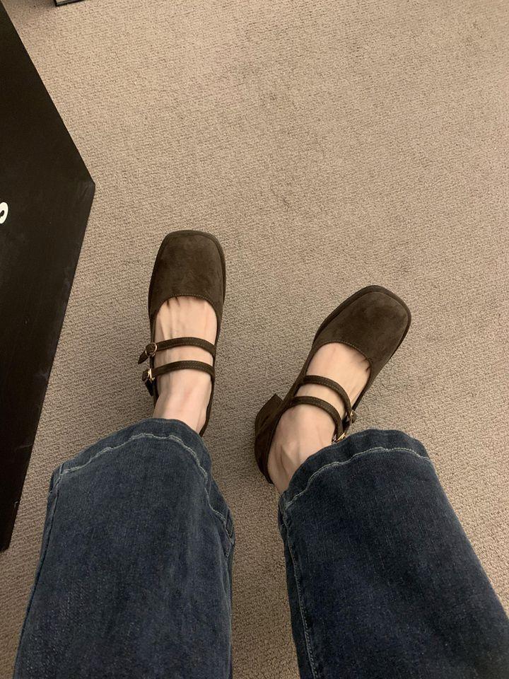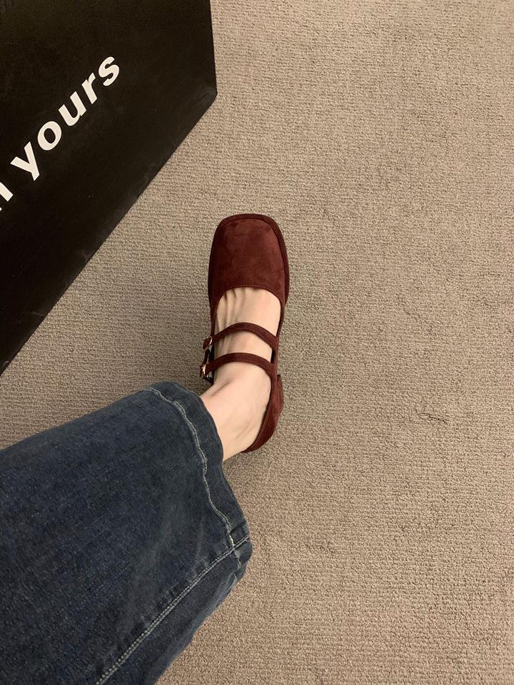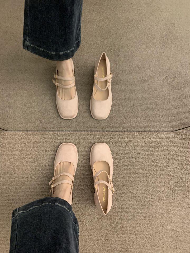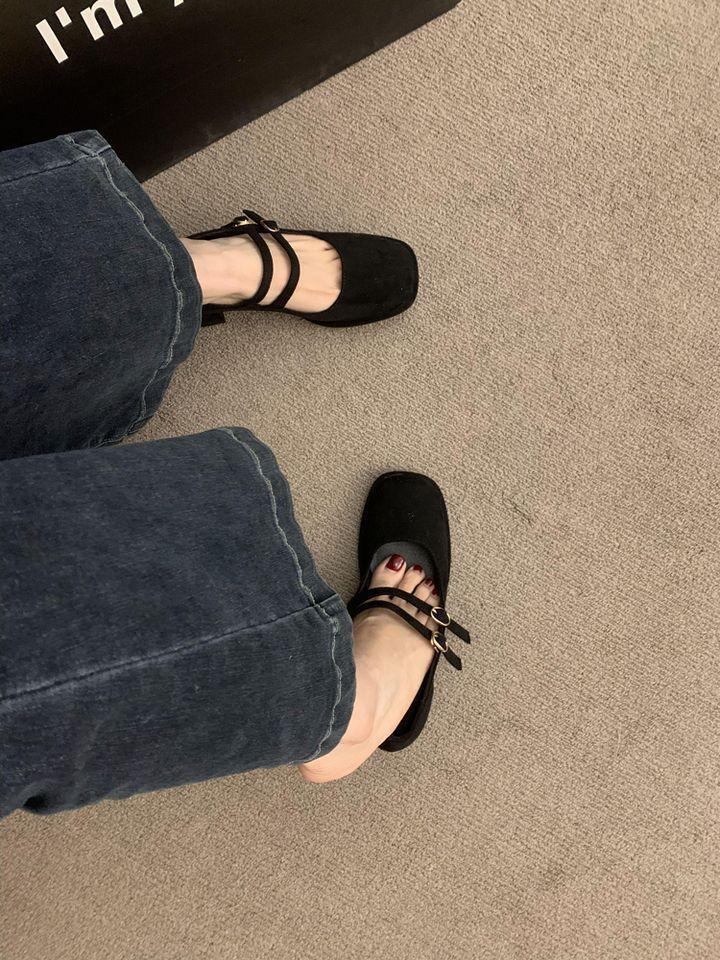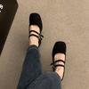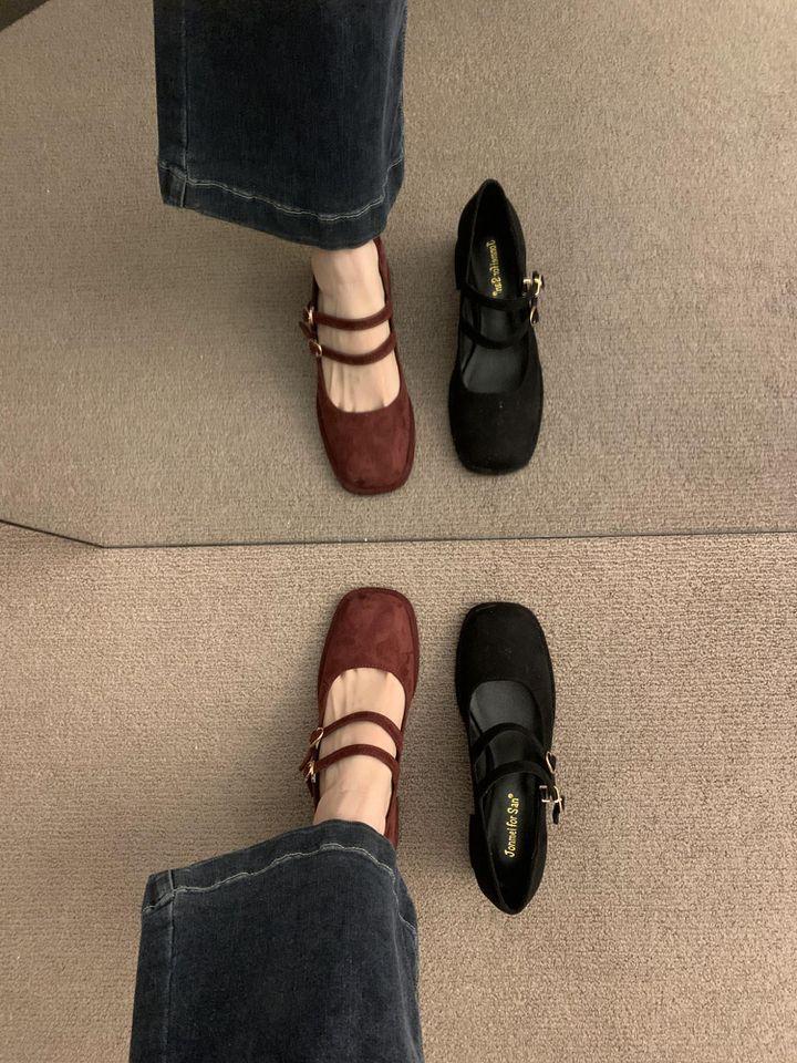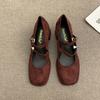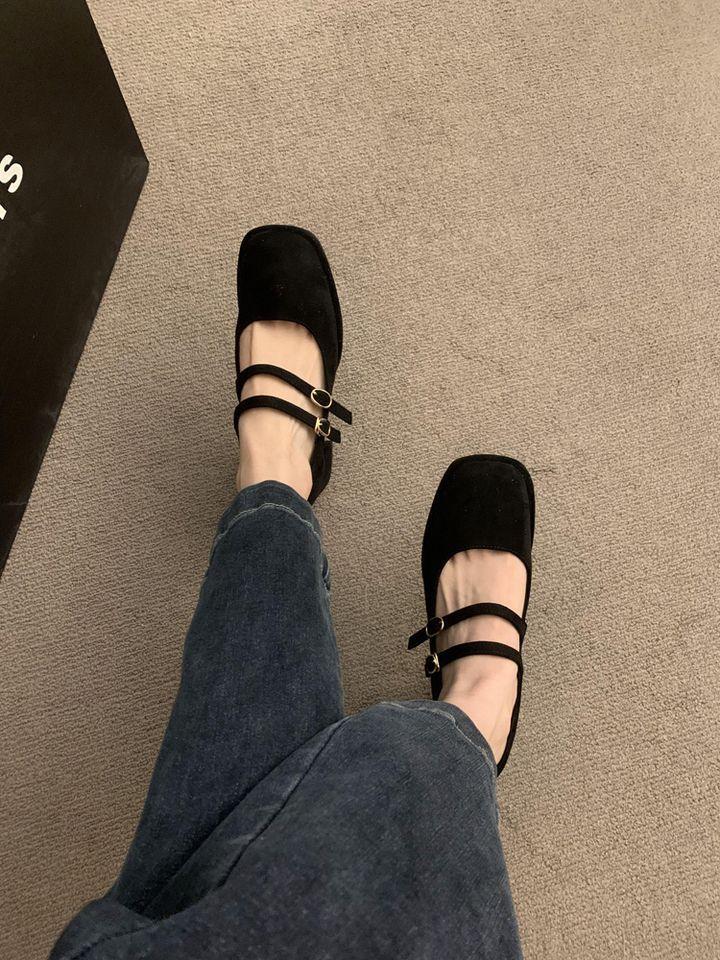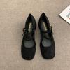 Zapatos Mary Jane Franceses Zapatos de Mujer 2025 Primavera y Otoño Nuevo Estilo Boca Baja Punta Cuadrada Retro Negro Gamuza Flats Zapatos Escotados