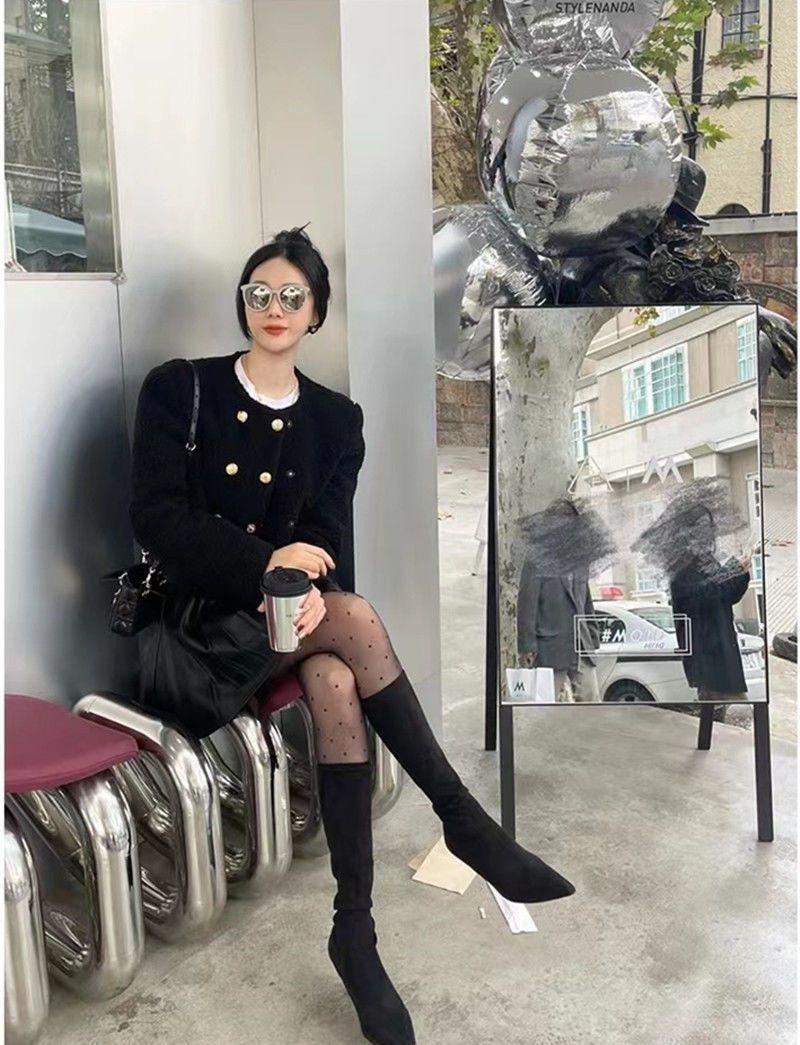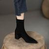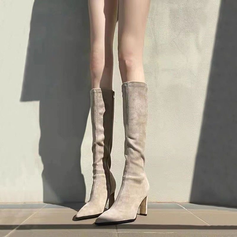 Otoño 2024 Nuevas Botas Skinny Elásticas Pero Hasta la Rodilla Tacón Grueso Botas Altas Gamuza Británica Punta Afilada Botas de Tacón Alto para Mujer