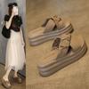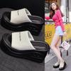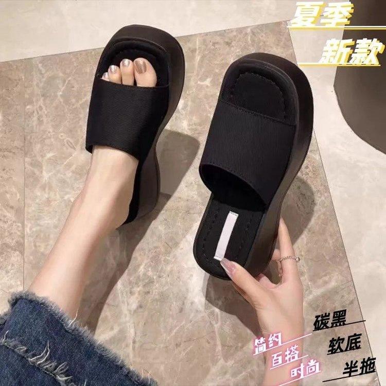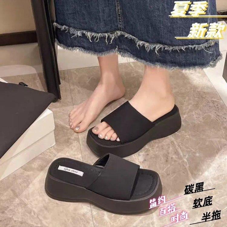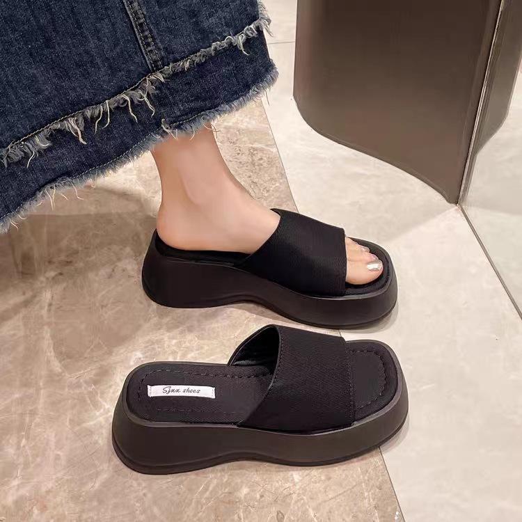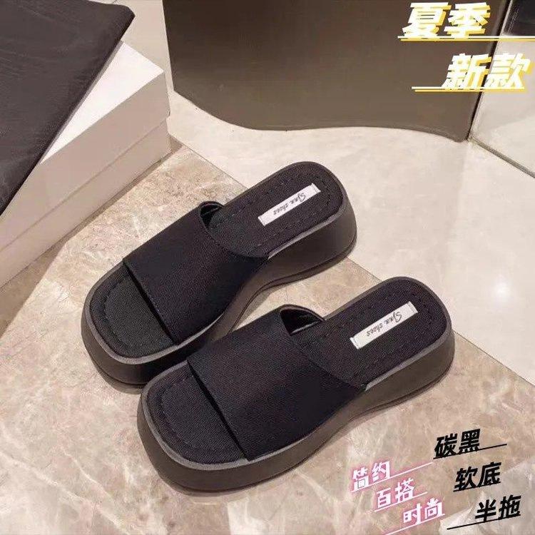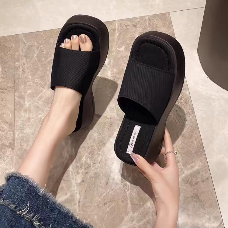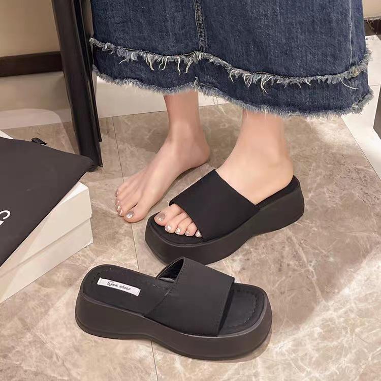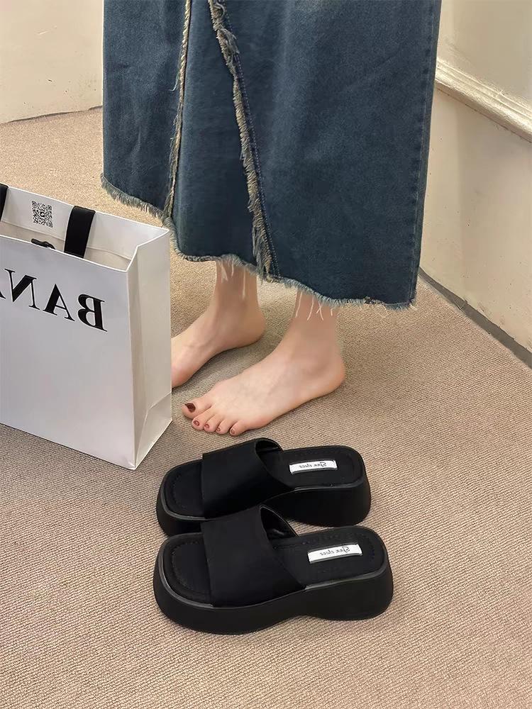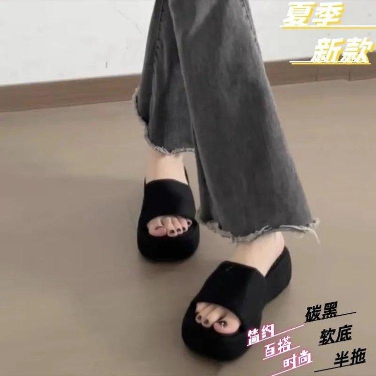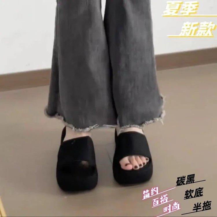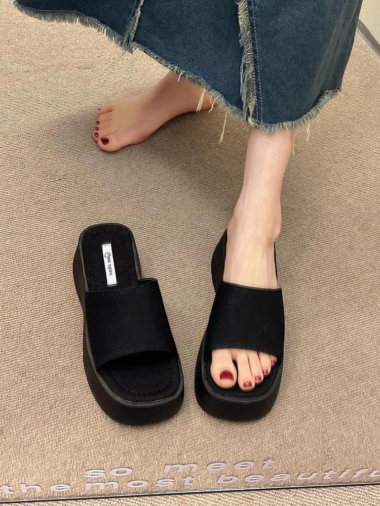 Zapatillas Elegantes de Suela Gruesa con Altura 2025 Verano para Exterior Nuevas Negras Francesas Hermosas Antideslizantes de Una Línea Sandalias de Playa
