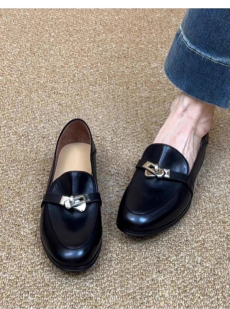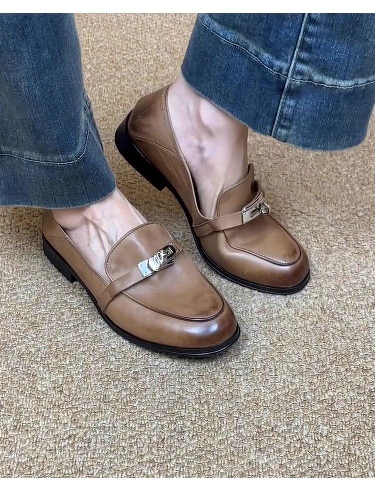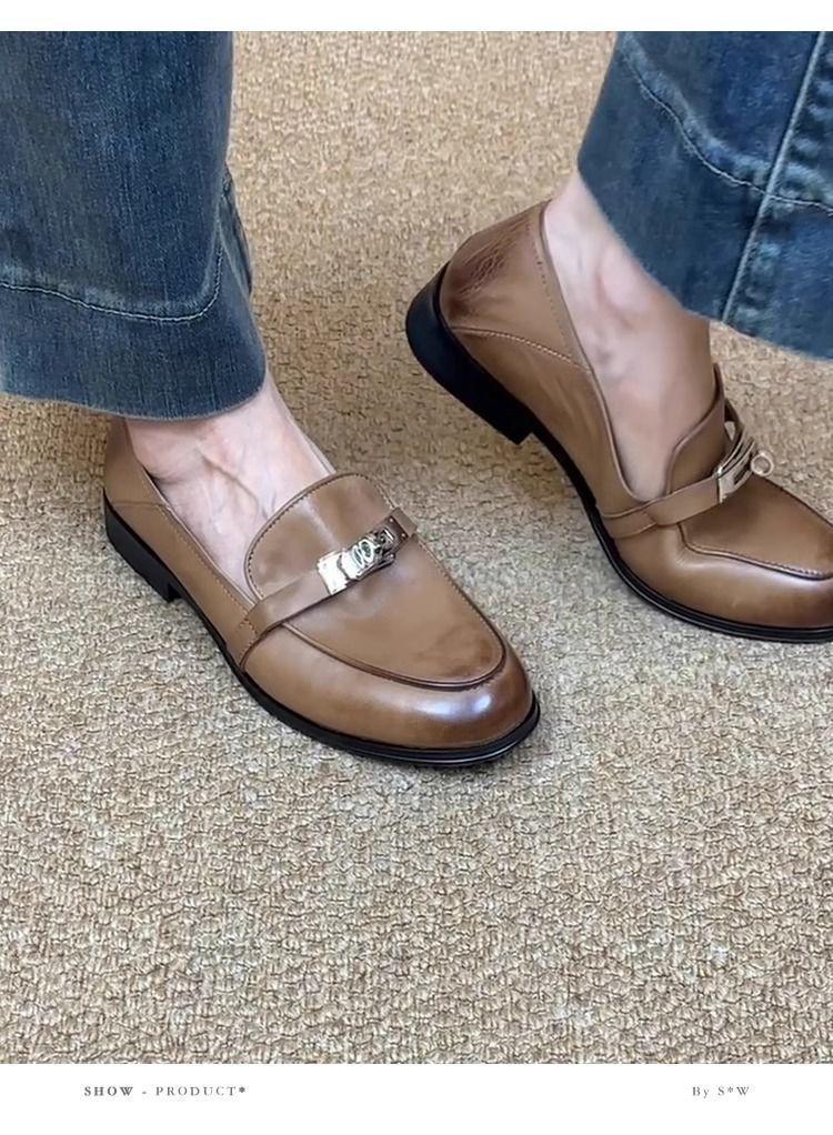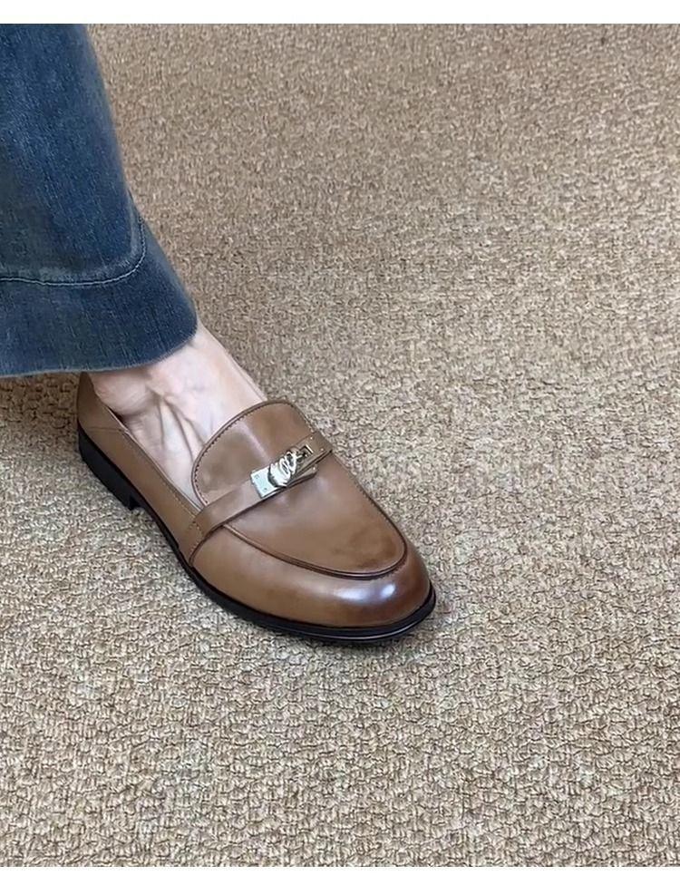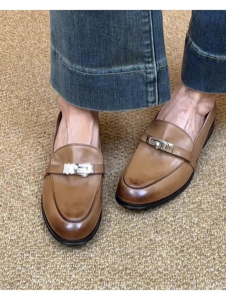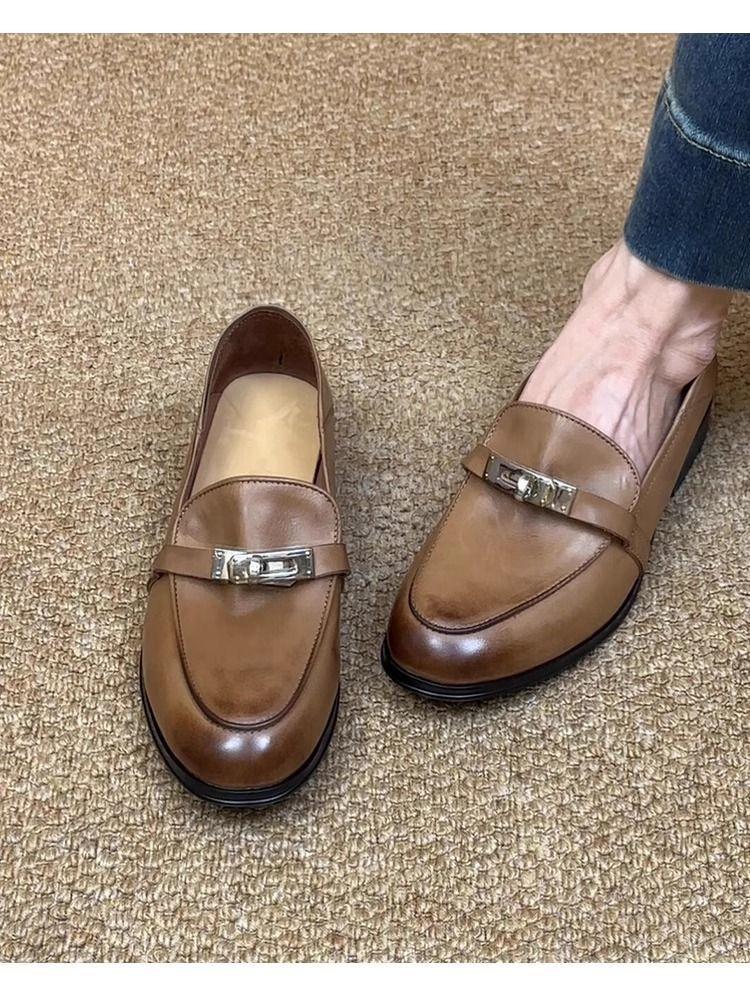 Mocasines Vintage de Metal con Hebilla para Mujer 2025 Otoño e Invierno Nuevos Punta Redonda Color Slip-on Planos Zapatos de Cuero