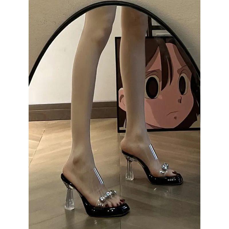 Sandalias Mary Jane 2025 Verano Nuevo Celebridad de Internet Diamantes de Imitación Cristal Transparente Impermeable Sexy Zapatillas de Exterior Moda de Tendencia