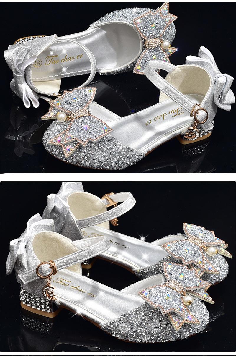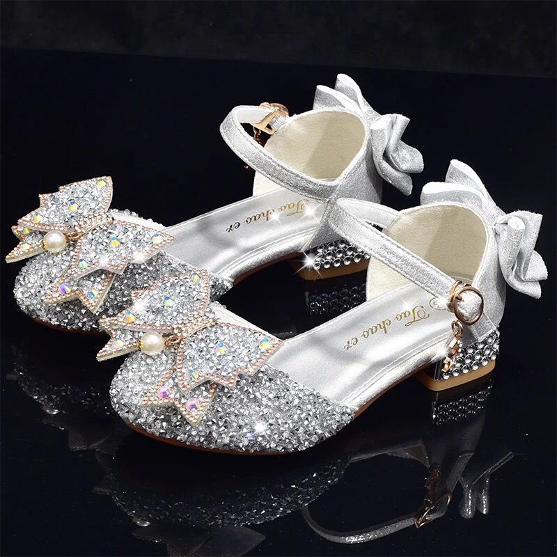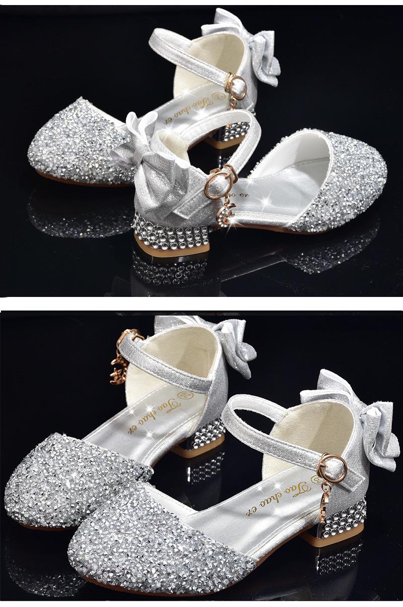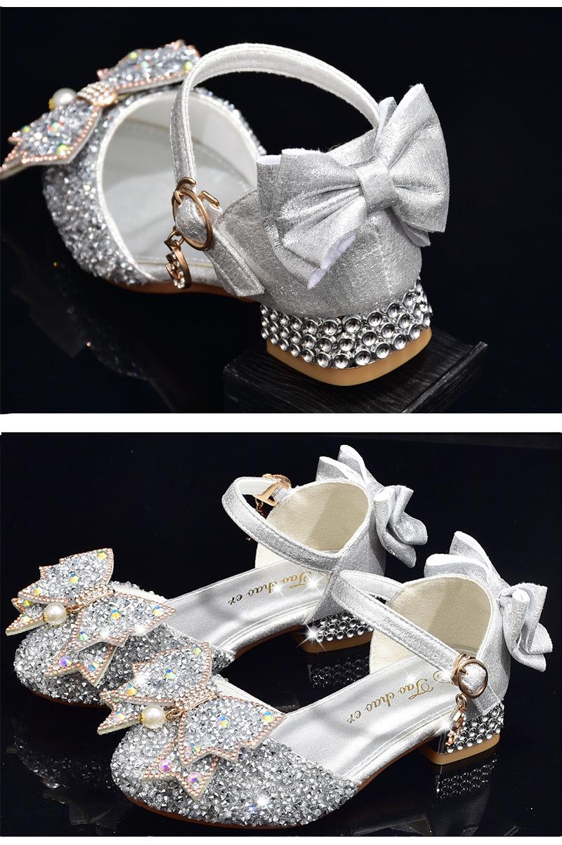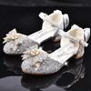 Zapatos plateados nuevos de cuero para niños, vestido de pasarela de princesa para presentación, zapatos de cristal, niñas, suela blanda, tacones altos pequeños
