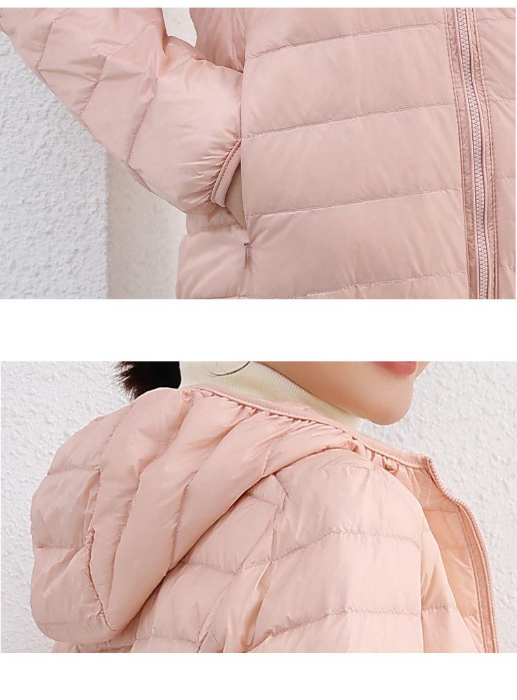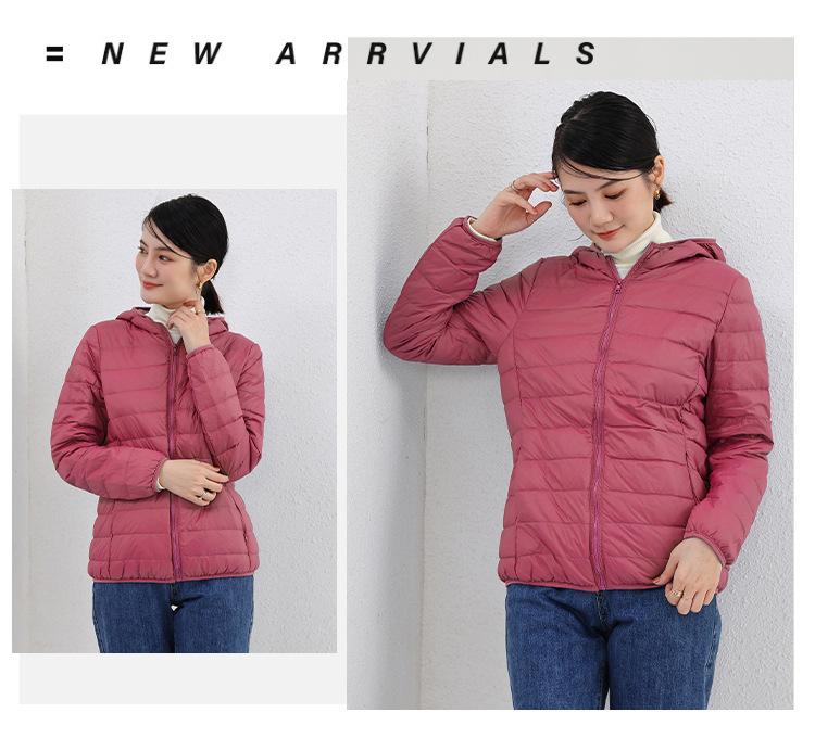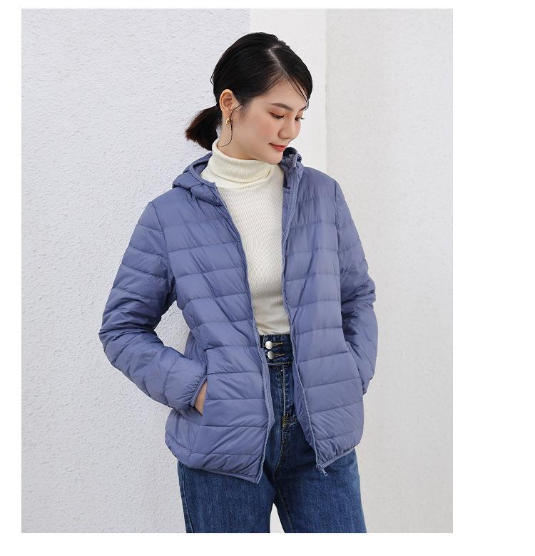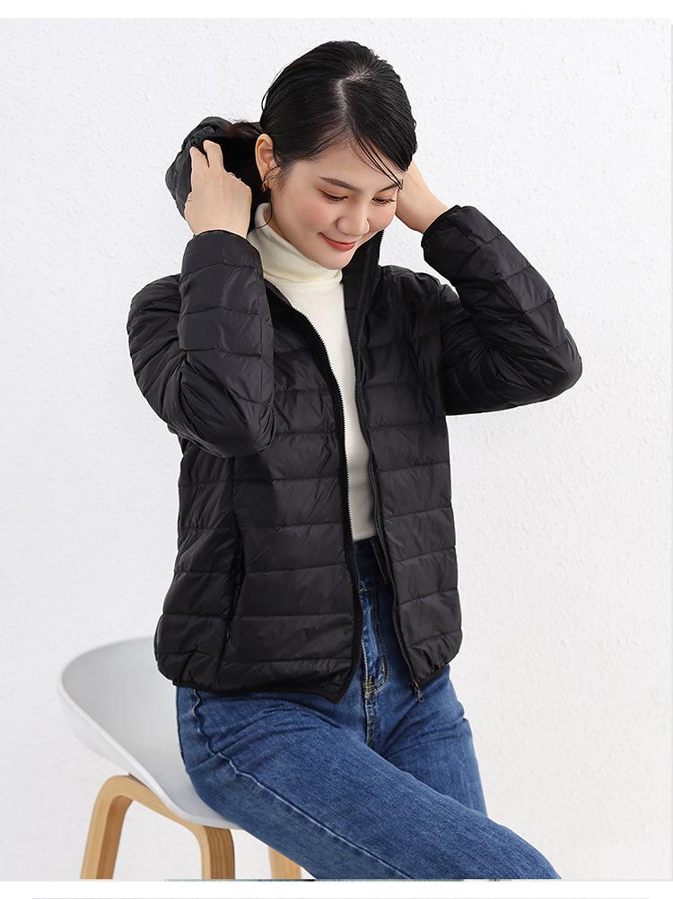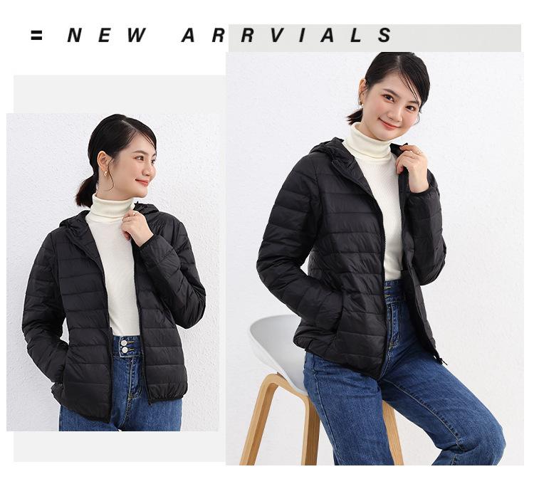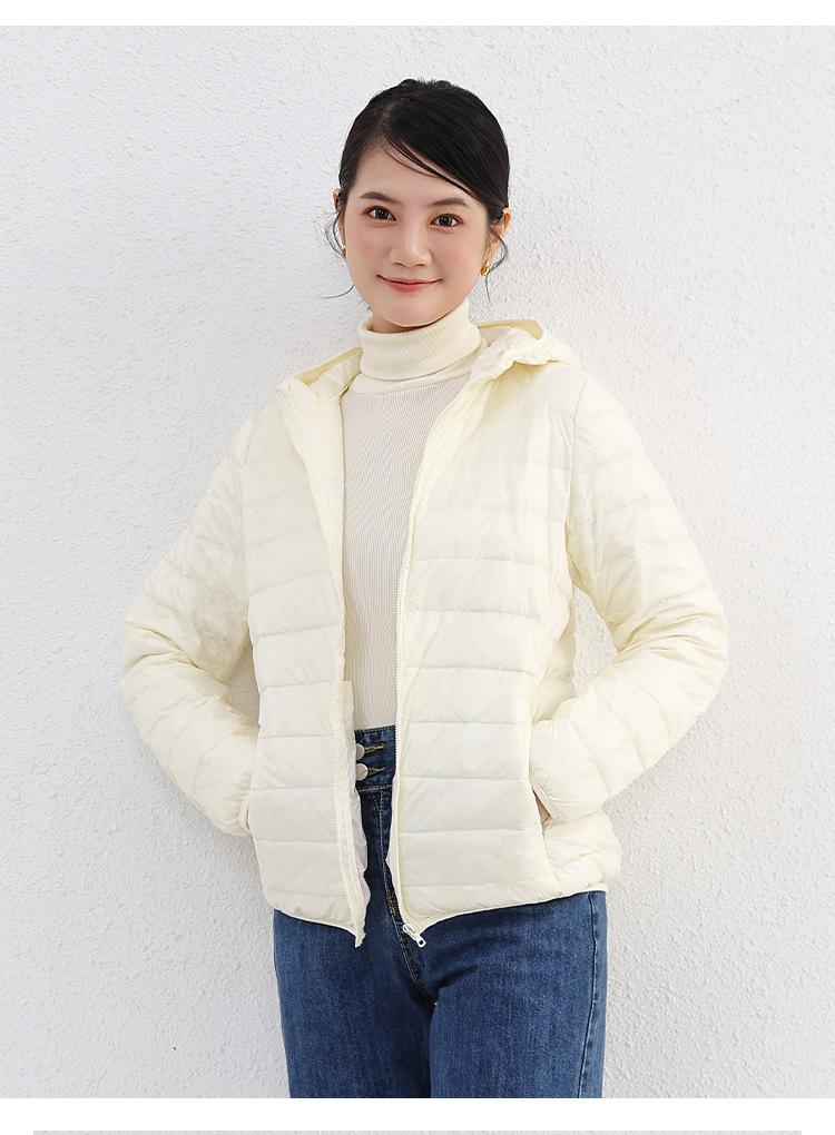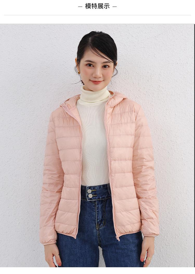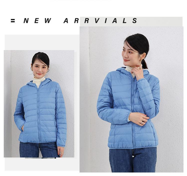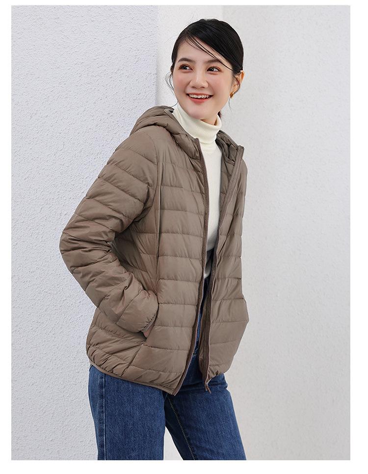 Foto real 2023 otoño e invierno nuevo abrigo de plumas delgado con capucha de color sólido combinable