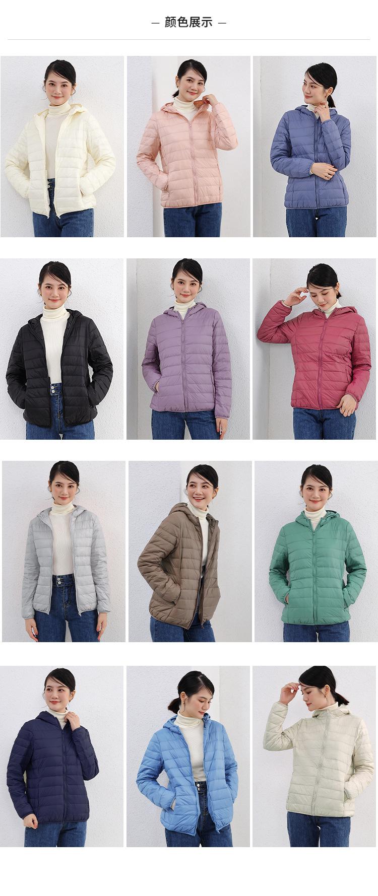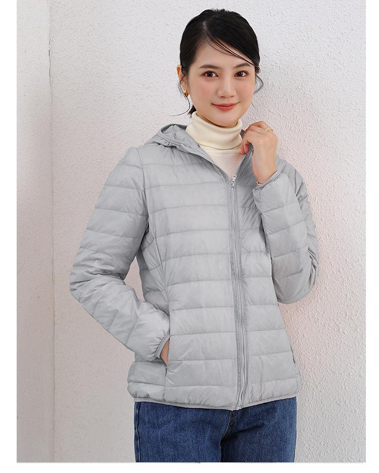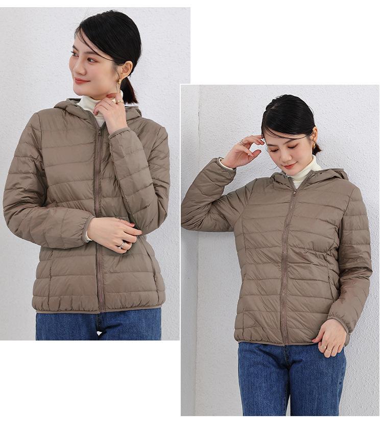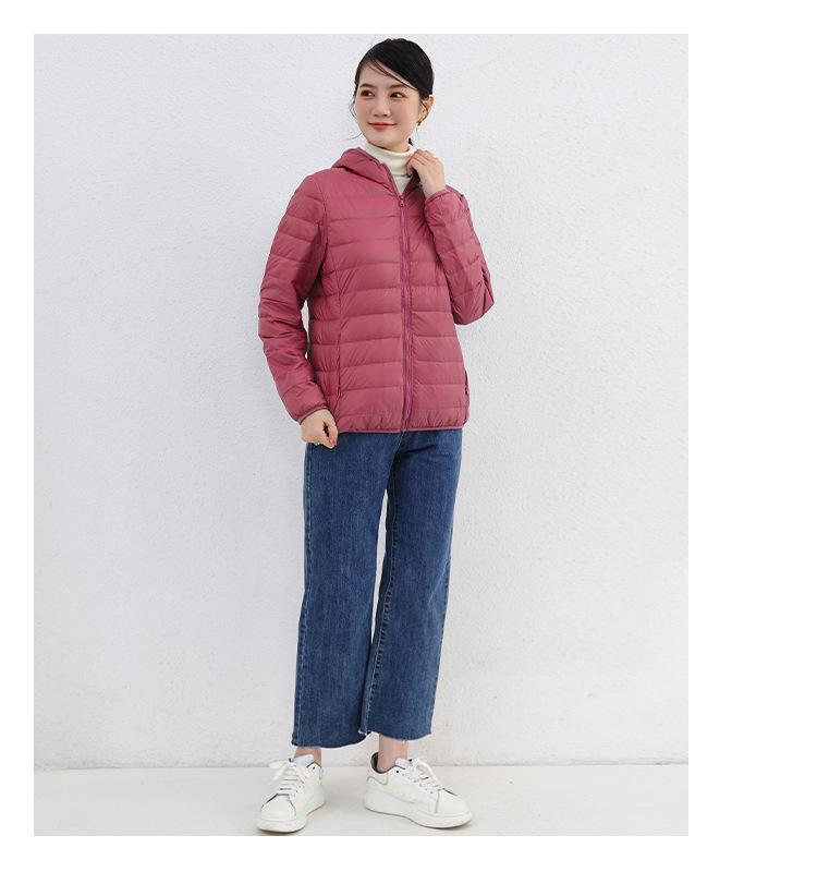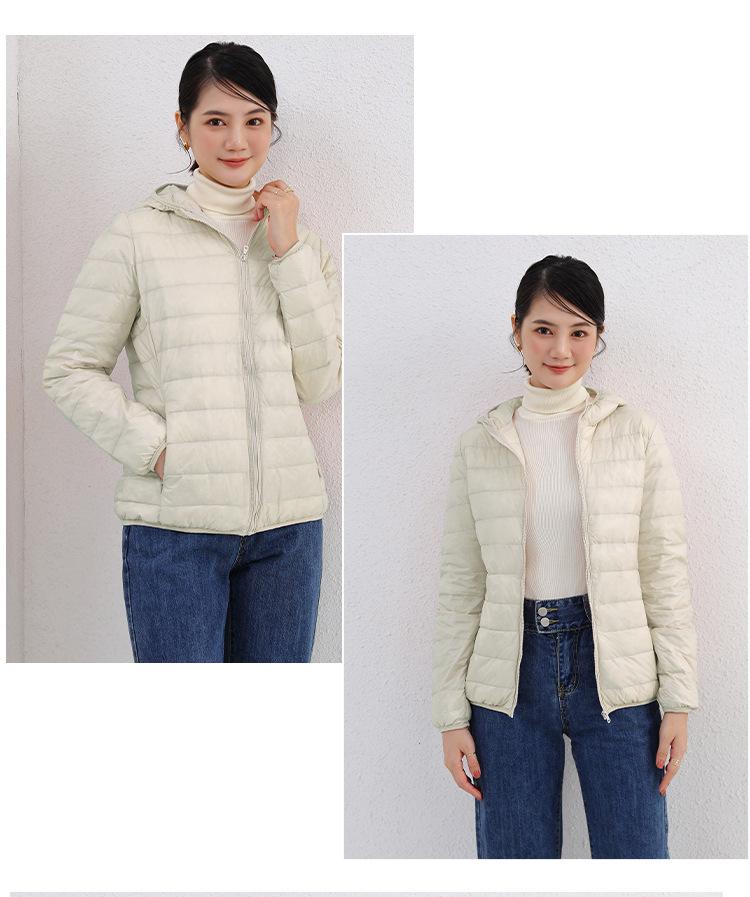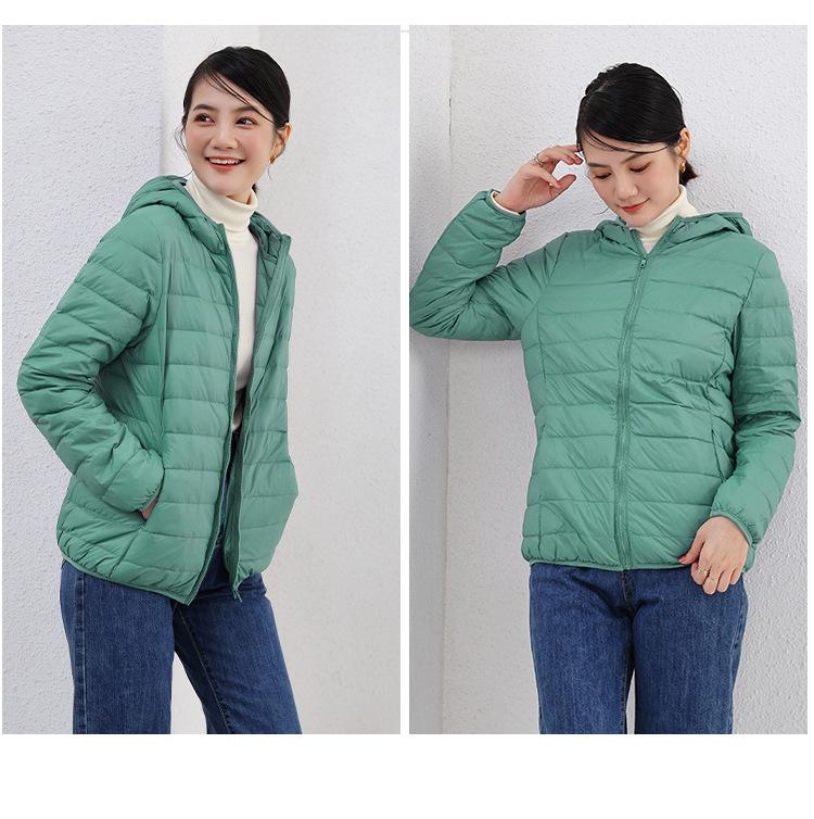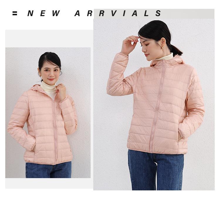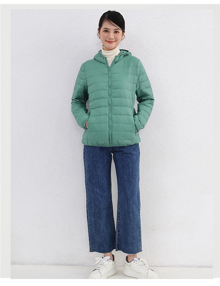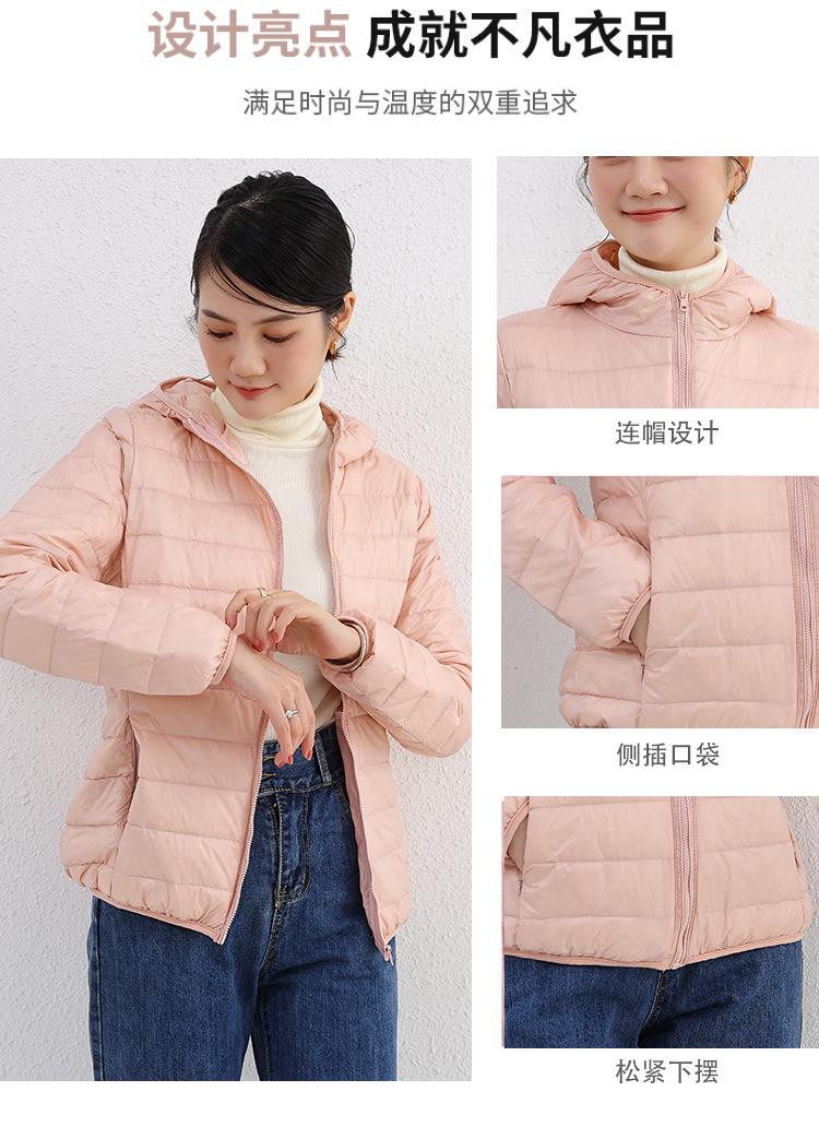 Foto real 2023 otoño e invierno nuevo abrigo de plumas delgado con capucha de color sólido combinable
