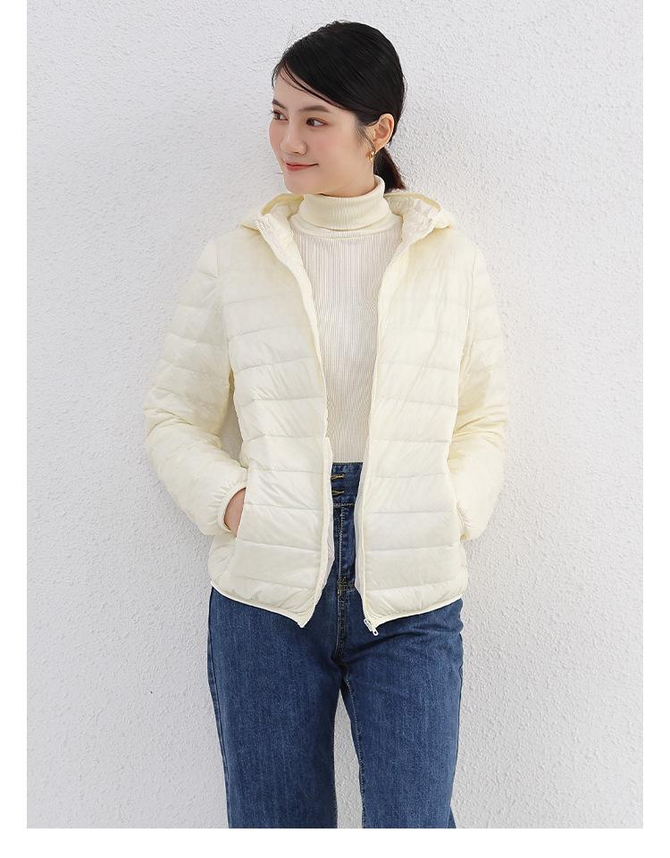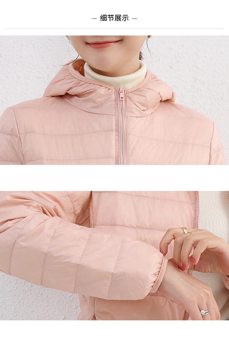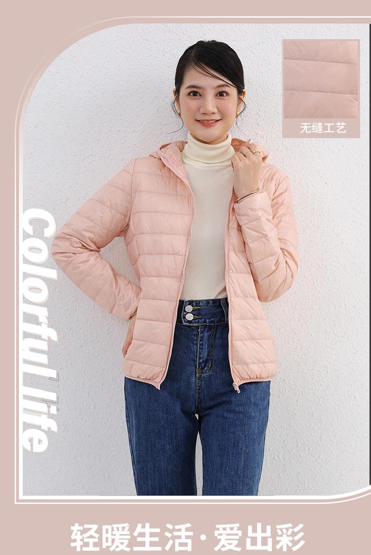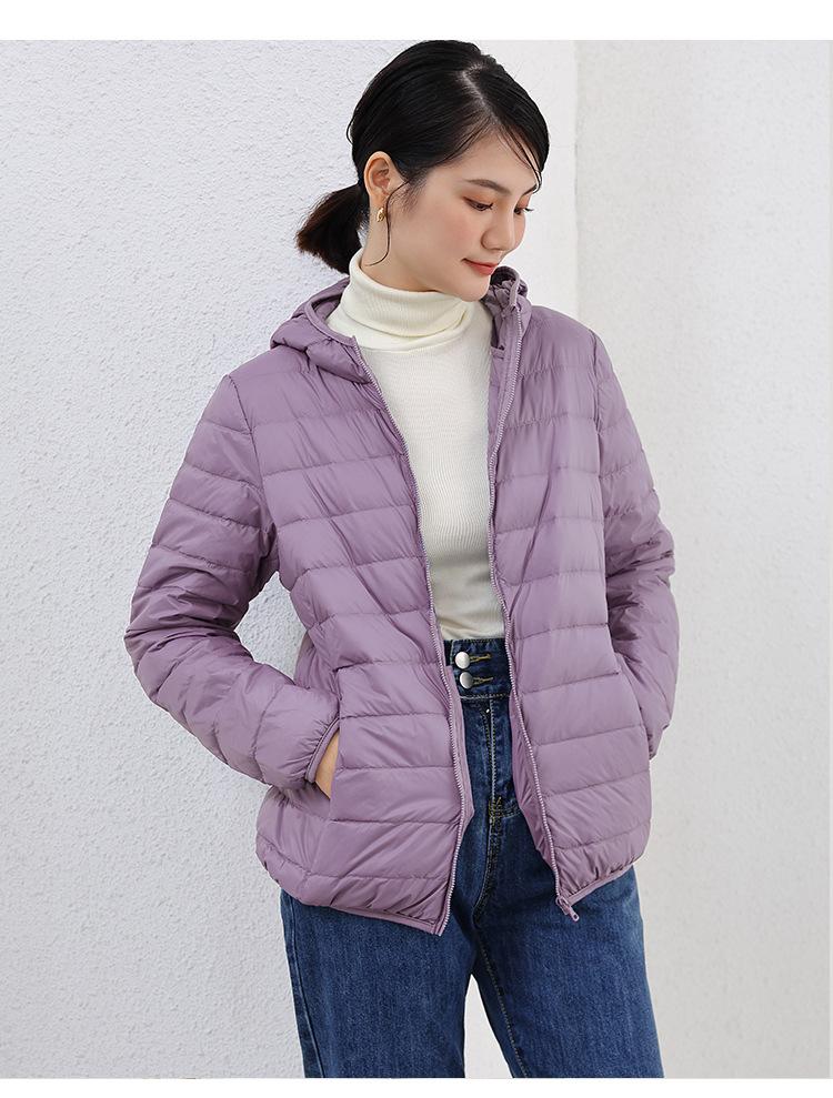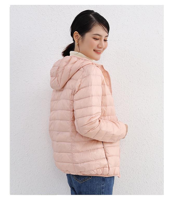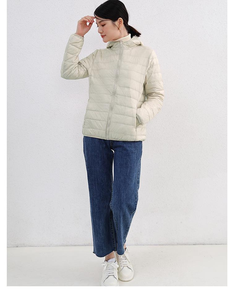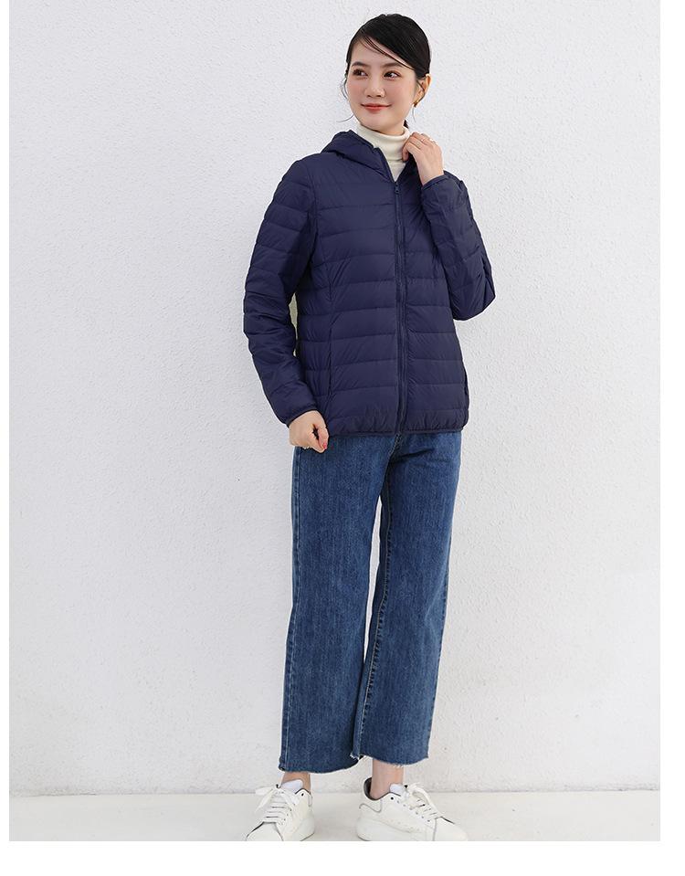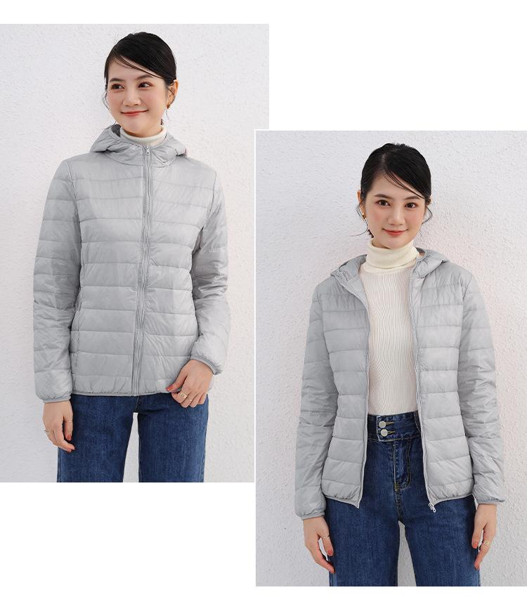 Foto real 2023 otoño e invierno nuevo abrigo de plumas delgado con capucha de color sólido combinable