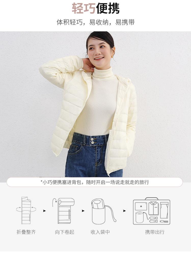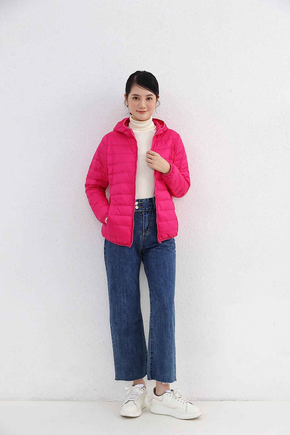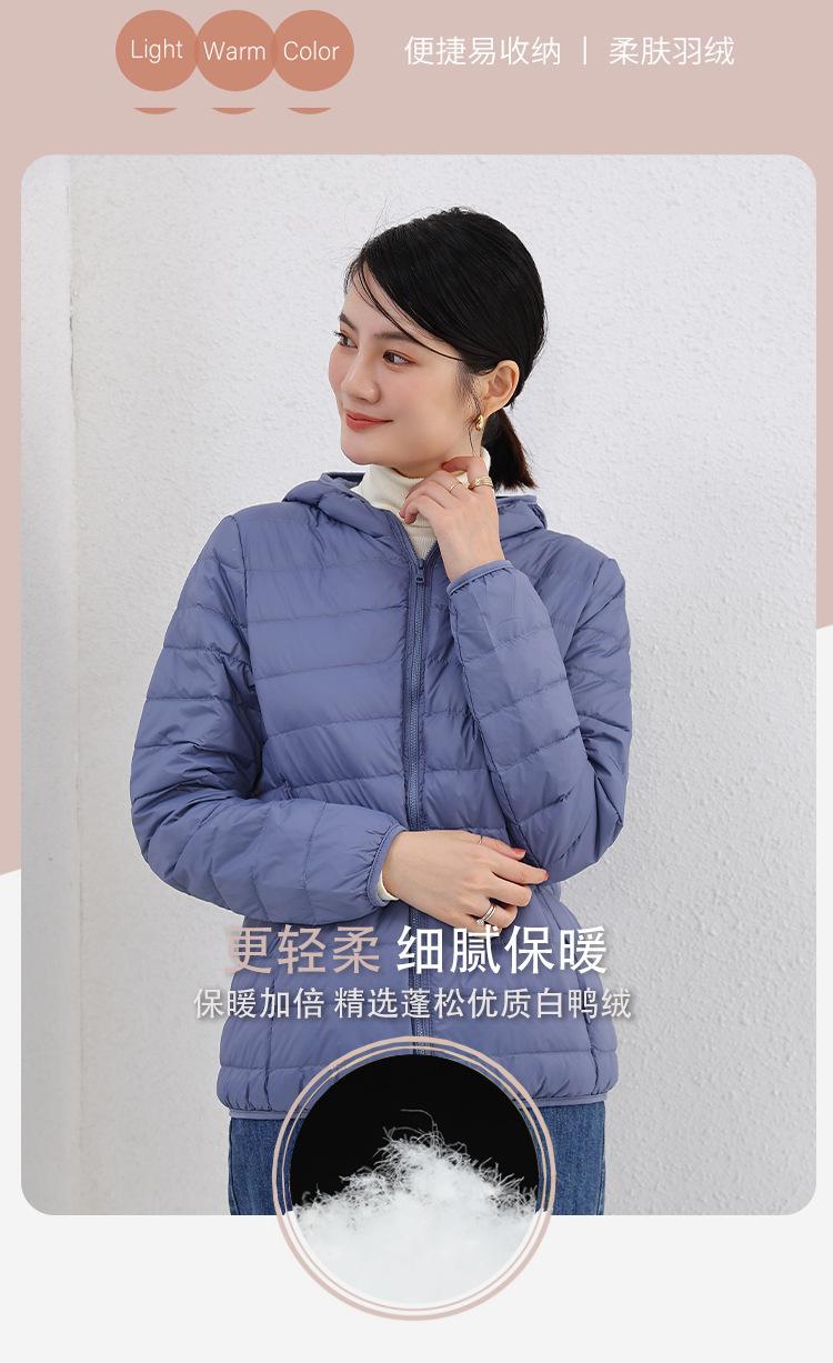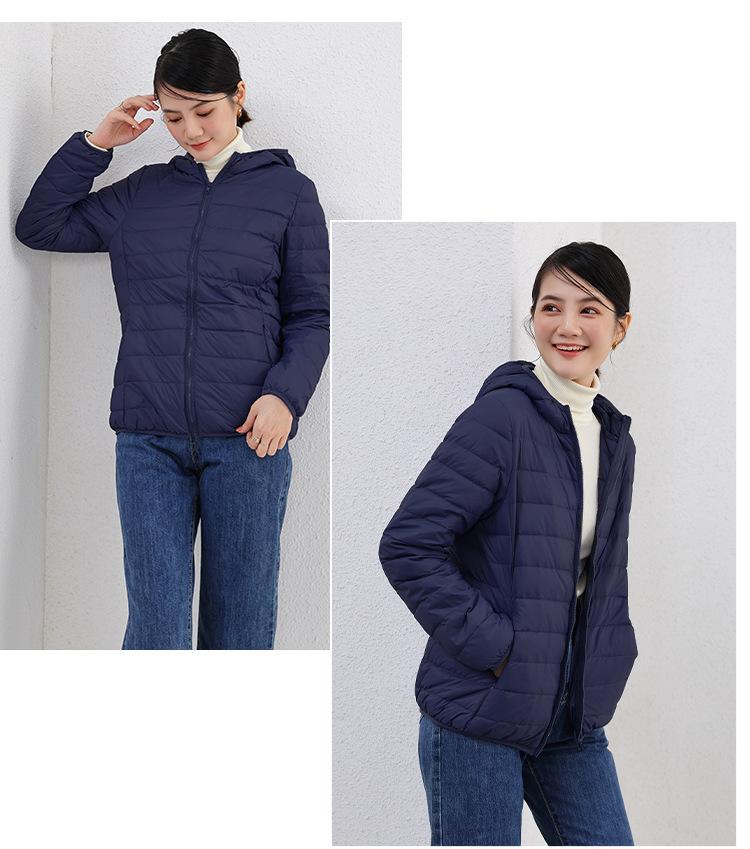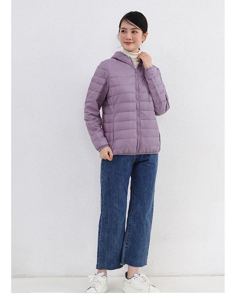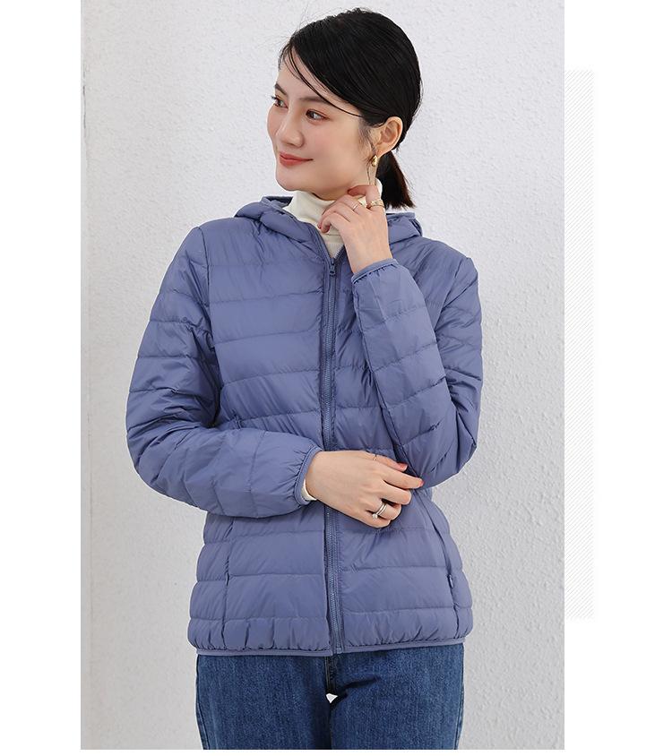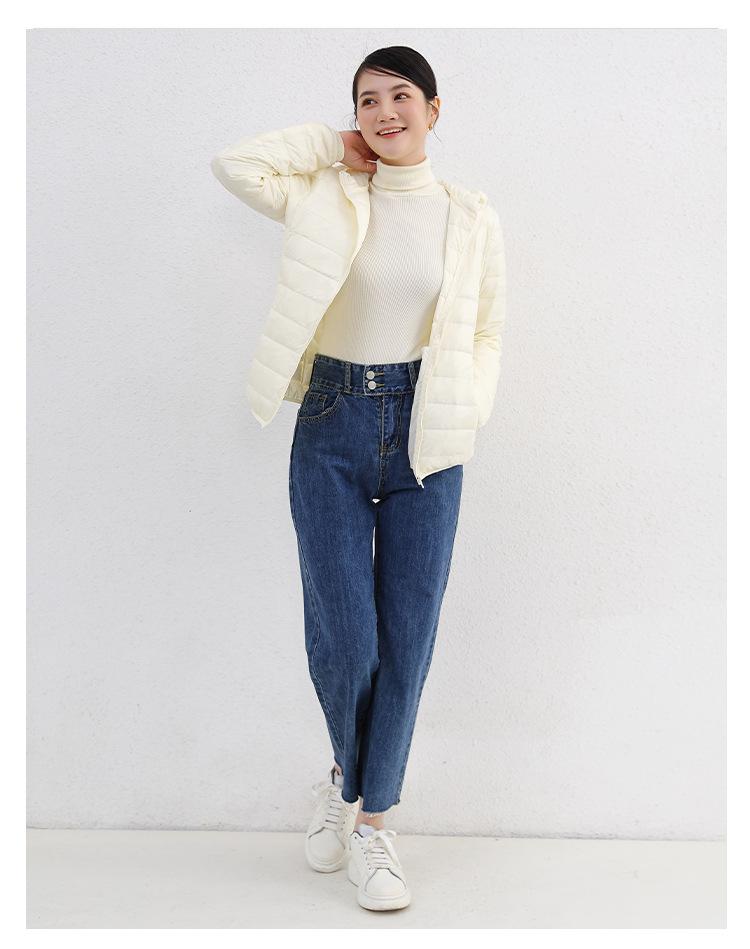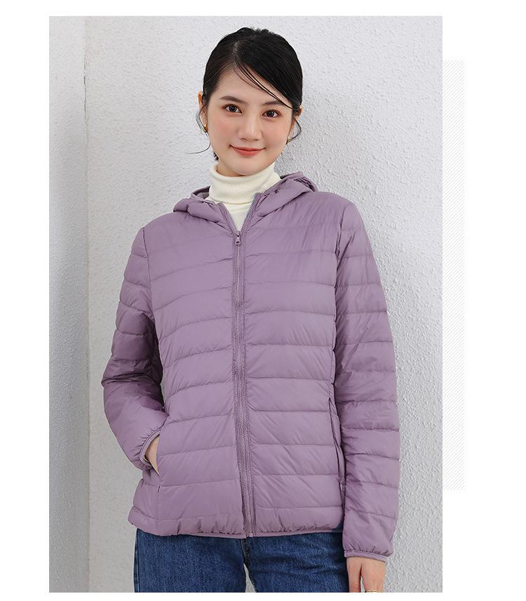 Foto real 2023 otoño e invierno nuevo abrigo de plumas delgado con capucha de color sólido combinable