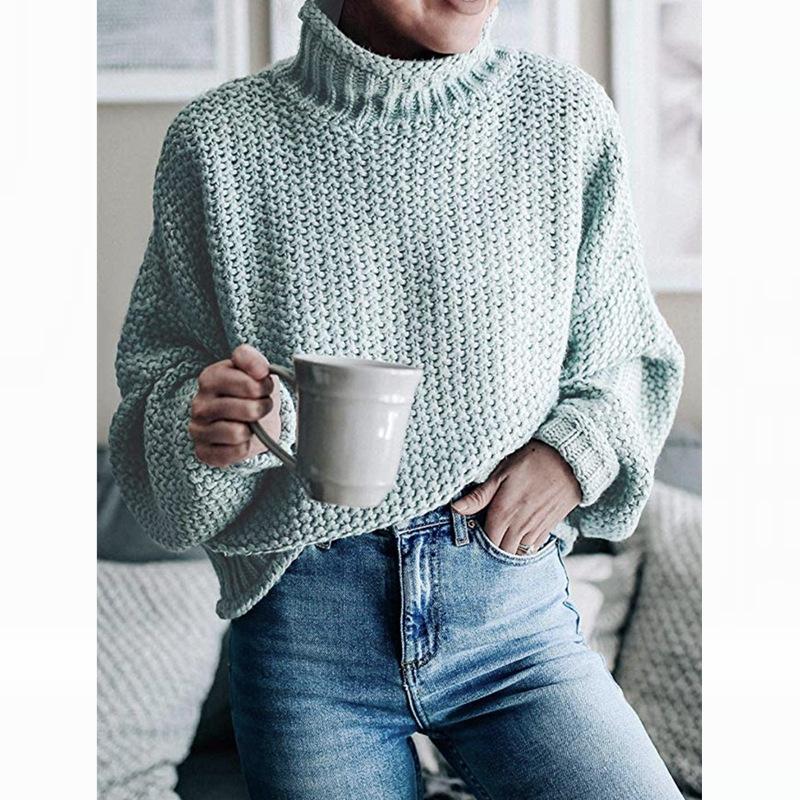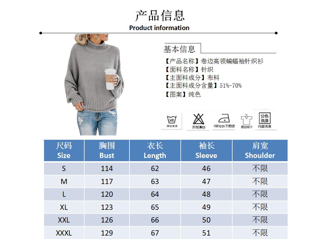 Suéter de Punto Grueso para Mujer Estilo Nuevo de Comercio Exterior Europeo y Americano Otoño/Invierno 2019 Amazon Más Vendido Cuello Alto con Borde Enrollado Manga Murciélago Top de Punto