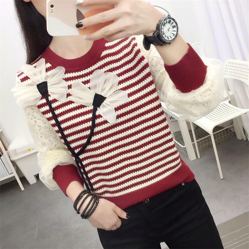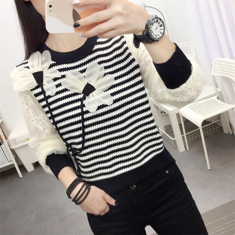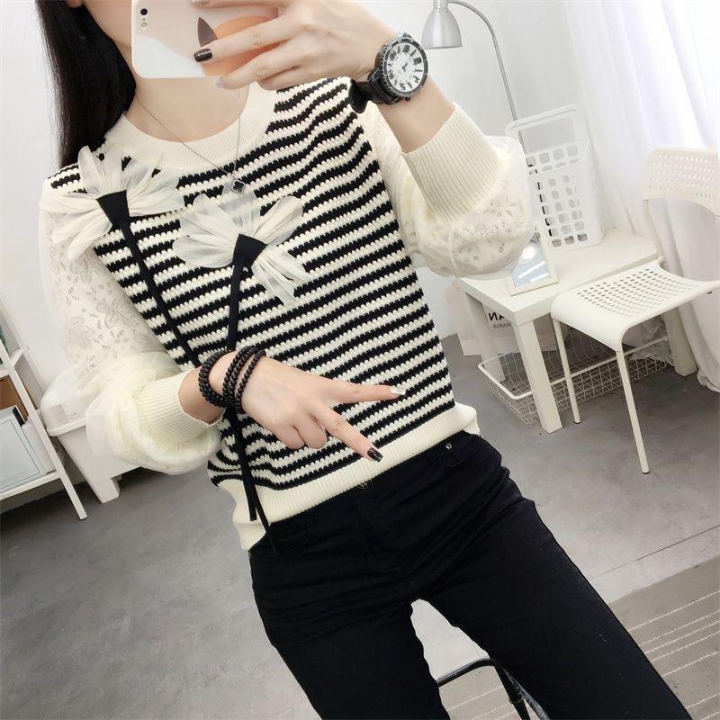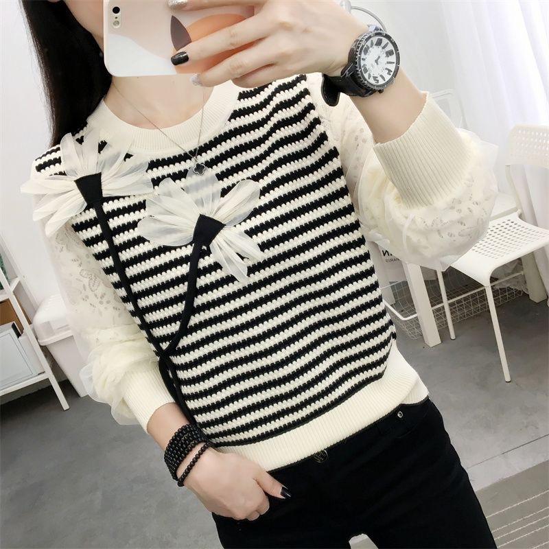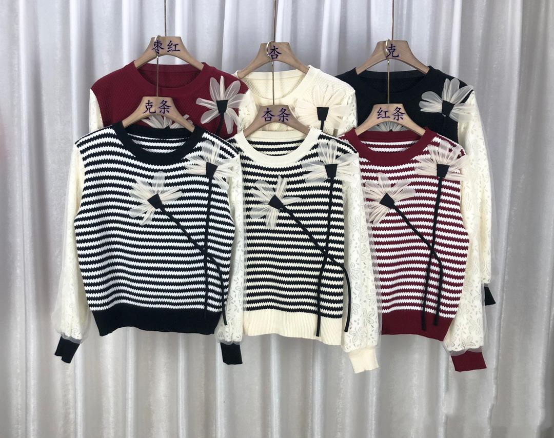 Otoño 2023 nuevo suéter de cuello redondo diseño de alta gama chic flor manga larga suéter a rayas top básico