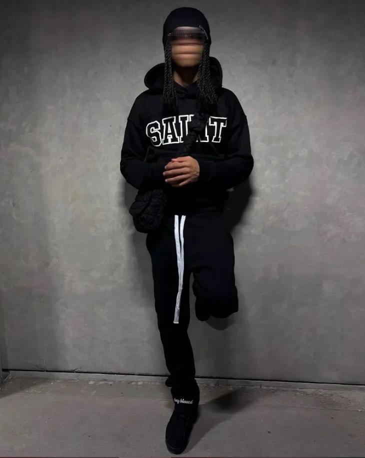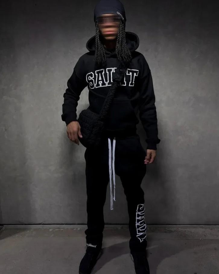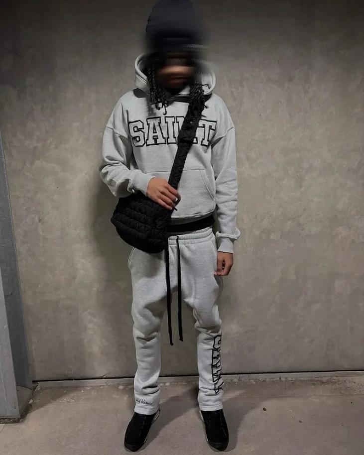 Black sweatshirt, Black trousers, Gray sweatshirt, Gray trousers