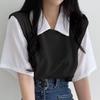 2024 Verano Polo Solapa Falso Dos Piezas Estilo Universitario Color Contraste Camiseta Manga Corta Mujer Holgada Casual Combinable Top Ins