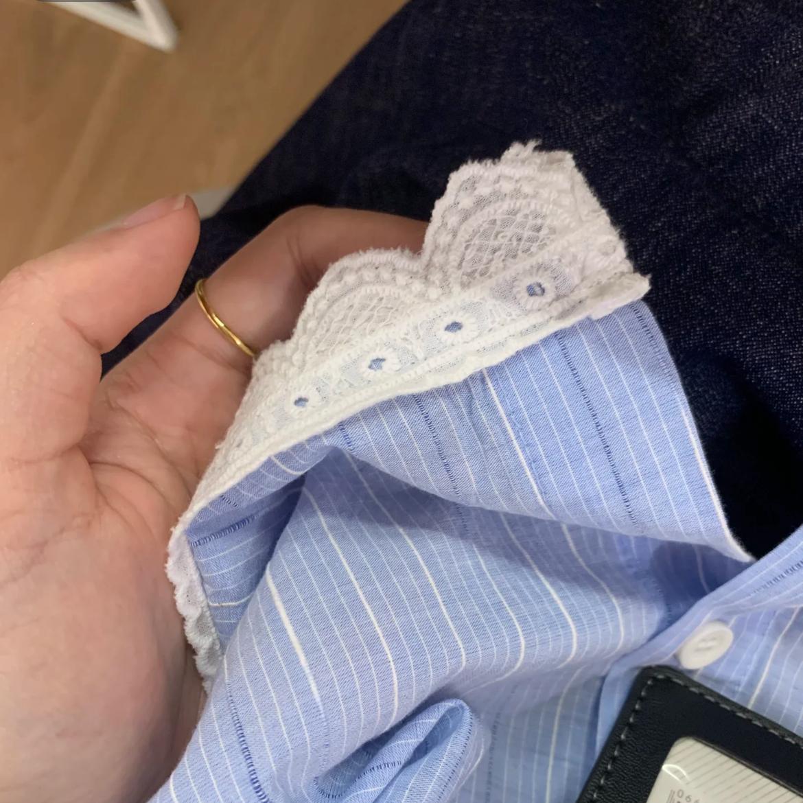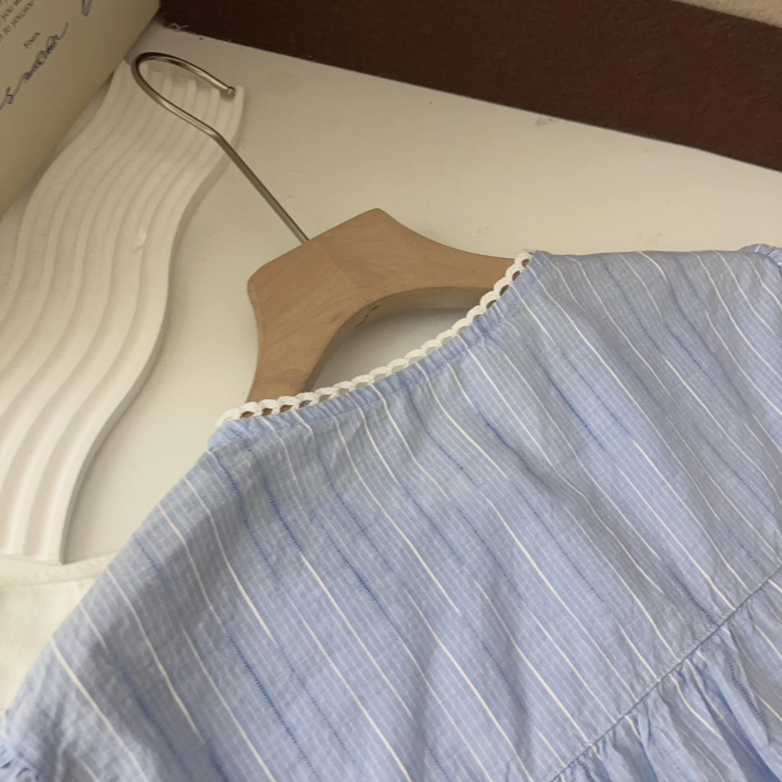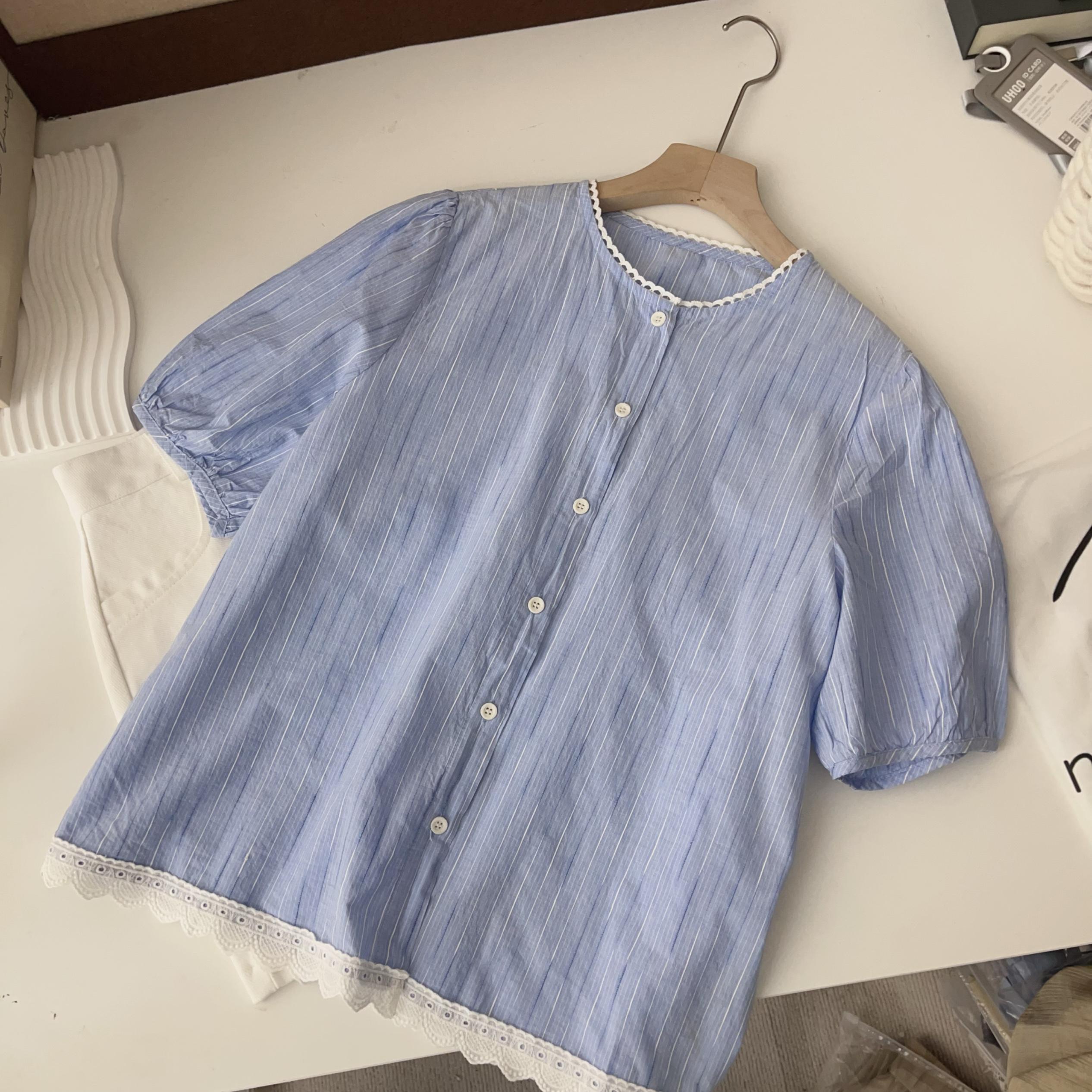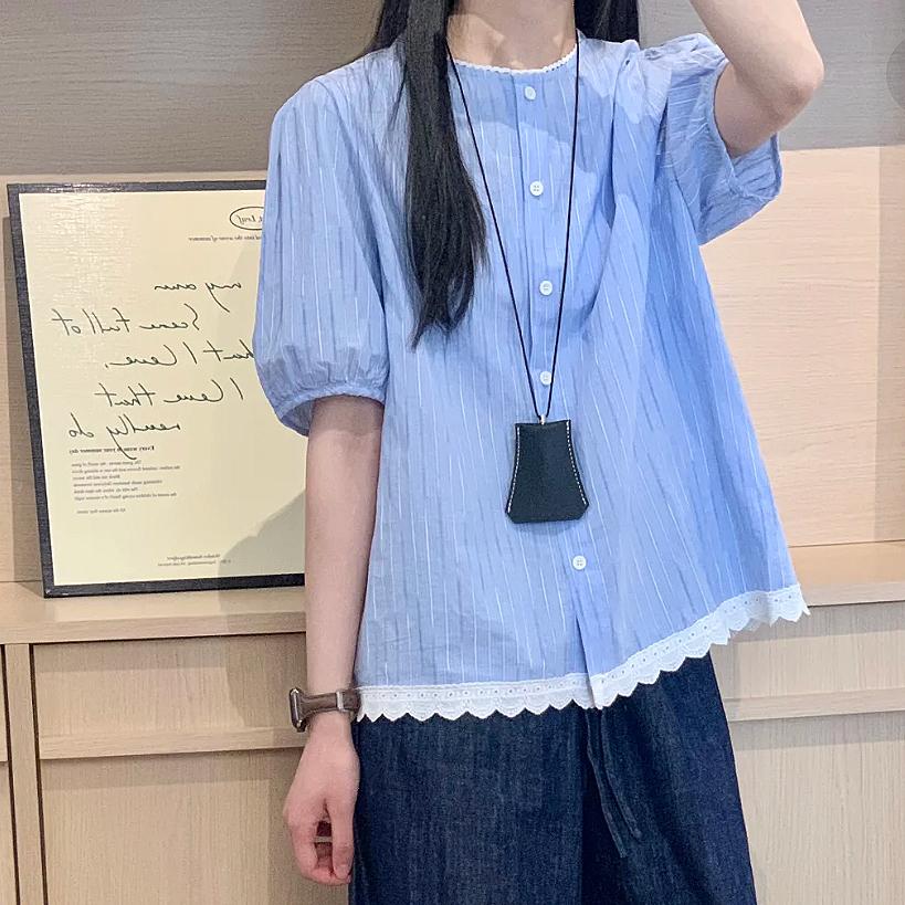 2025 Nuevo Verano Estilo Coreano Suelto y Moderno Encaje Manga Tres Cuartos Camisa Rayada Versátil Top Cuello Redondo Camisa Básica