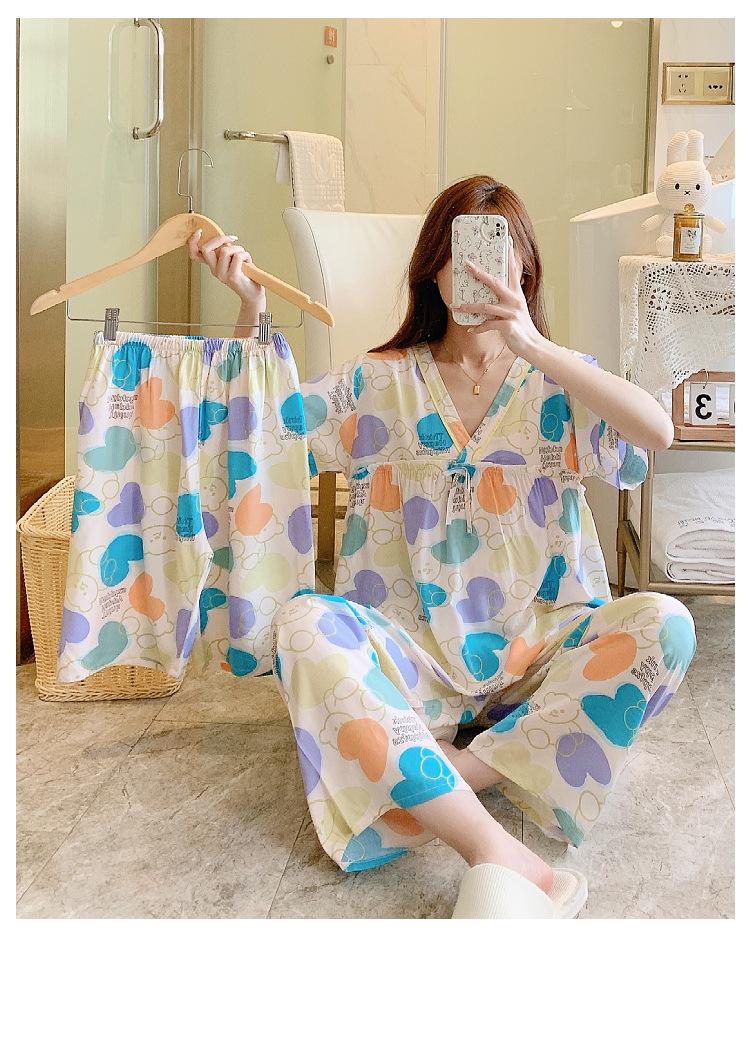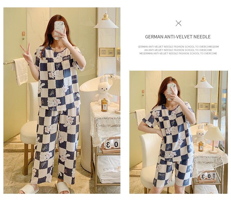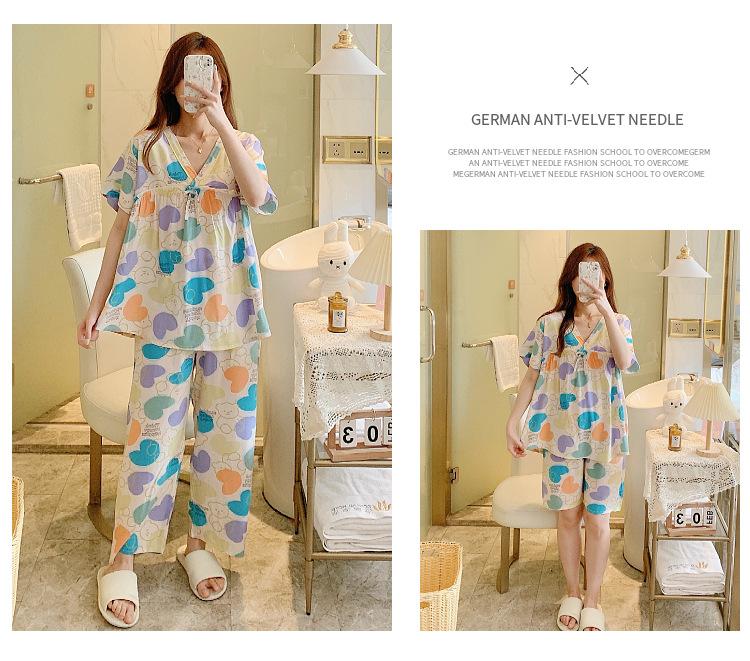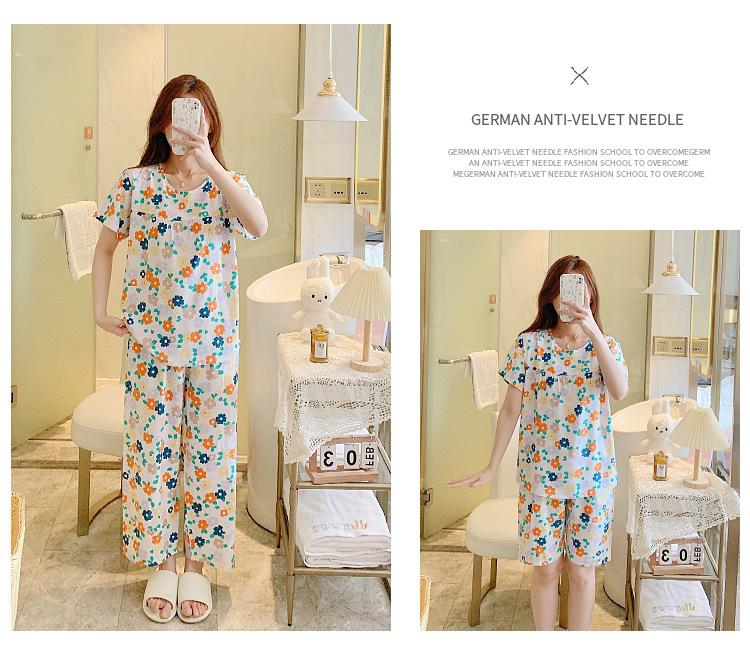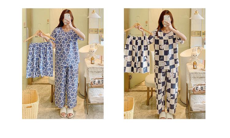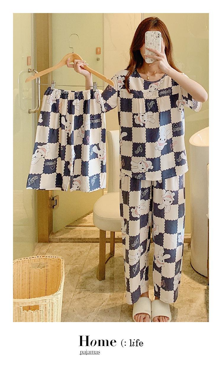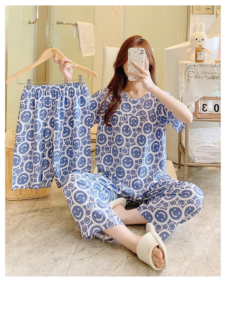 Pijama de Algodón Seda Traje de Verano para Mujer Manga Corta Pantalones Lindo Delgado Verano Algodón Seda Primavera y Otoño Ropa para el Hogar Conjunto de Tres Piezas