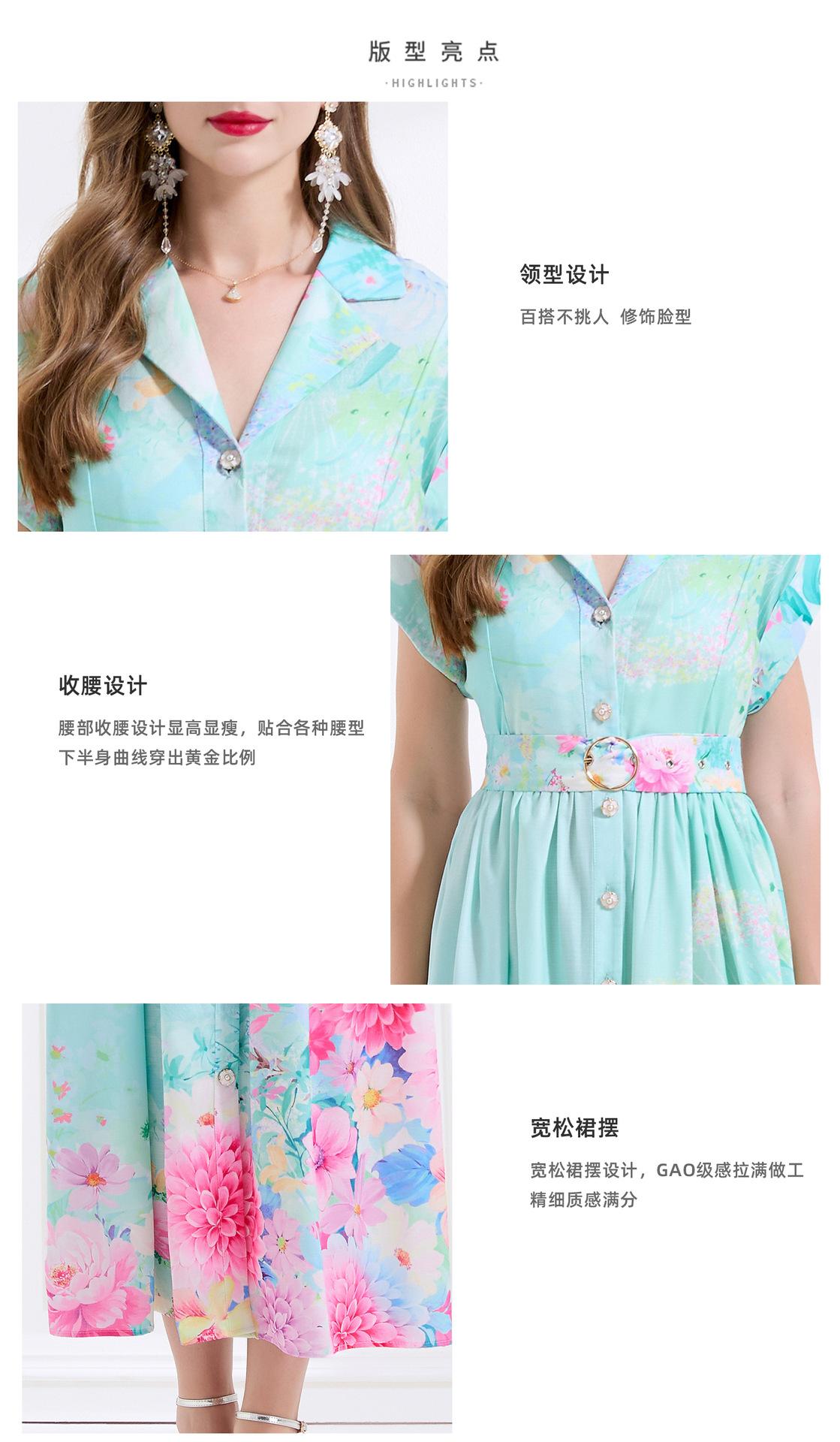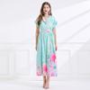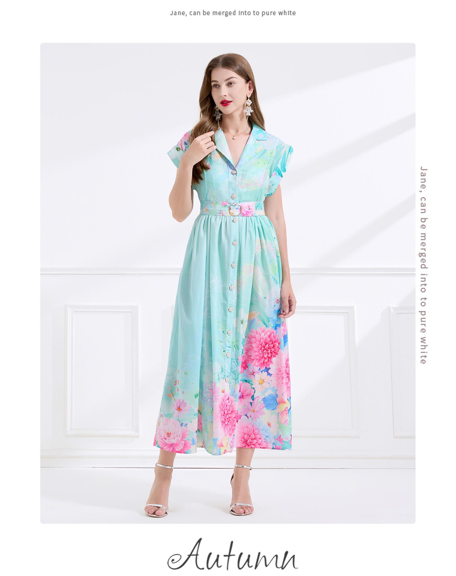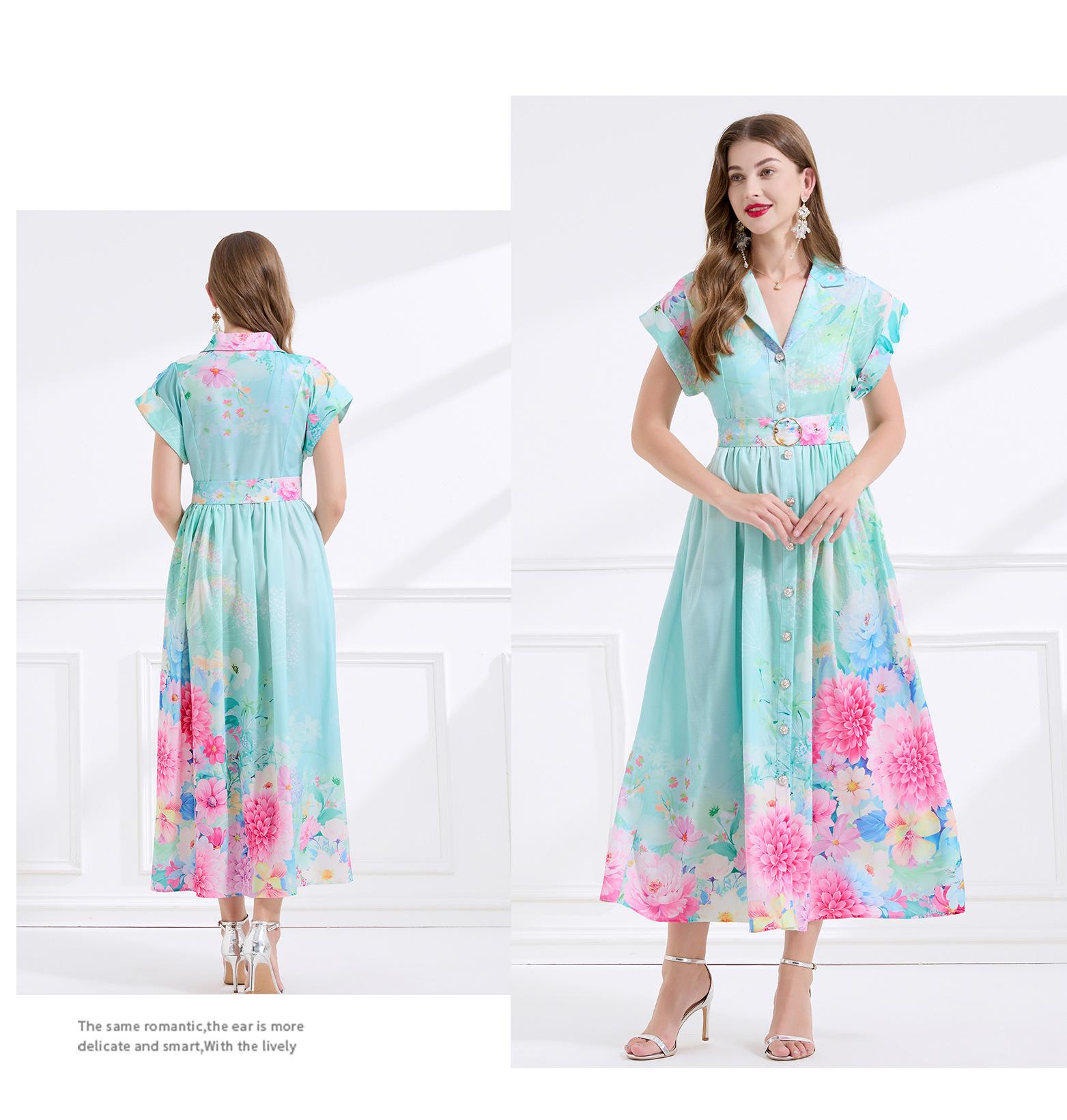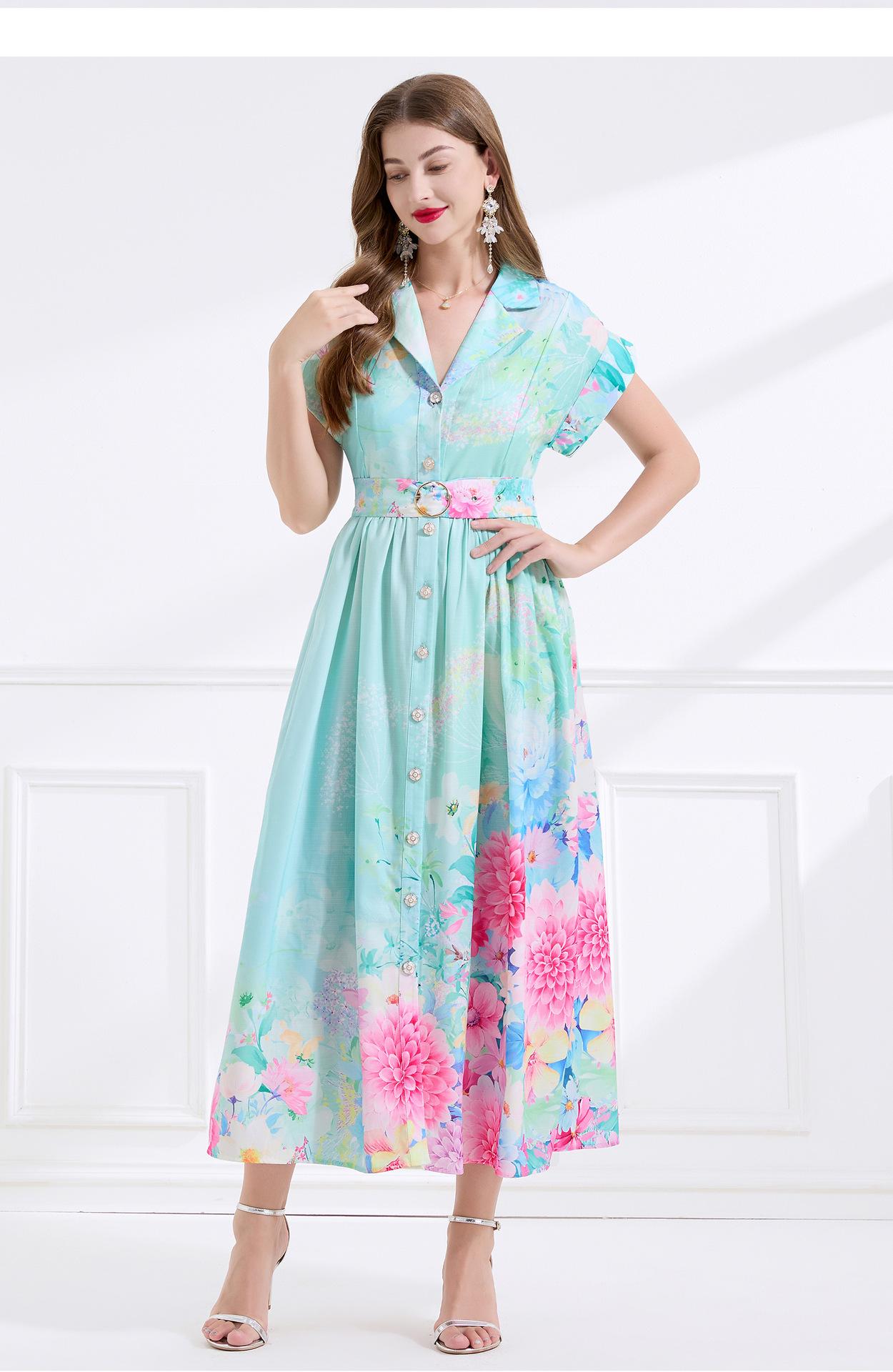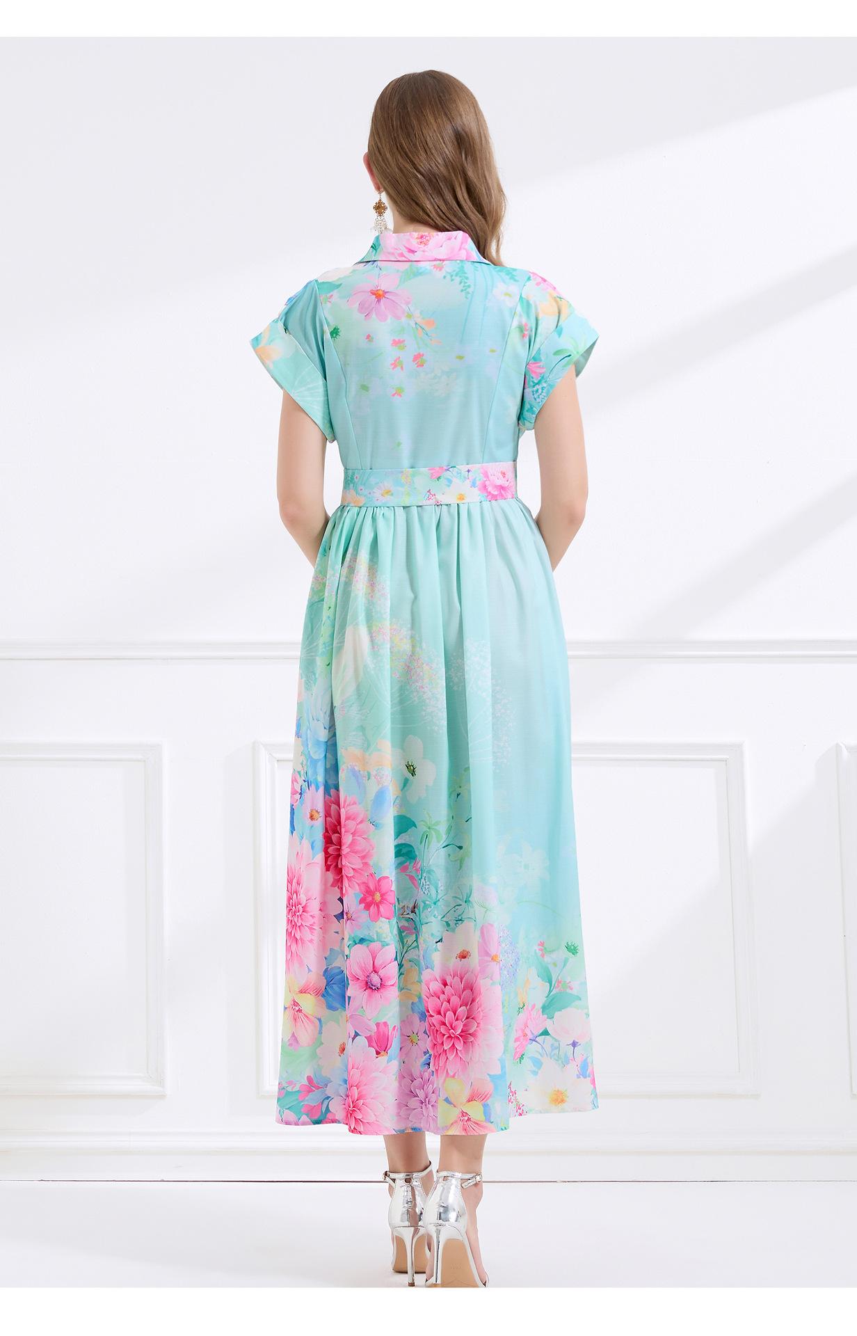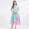 Traje 2025 Cuello de Solapa Manga Corta Cintura Estampado Floral Estilo Resort de Playa Falda con Volantes y Bajo Amplio