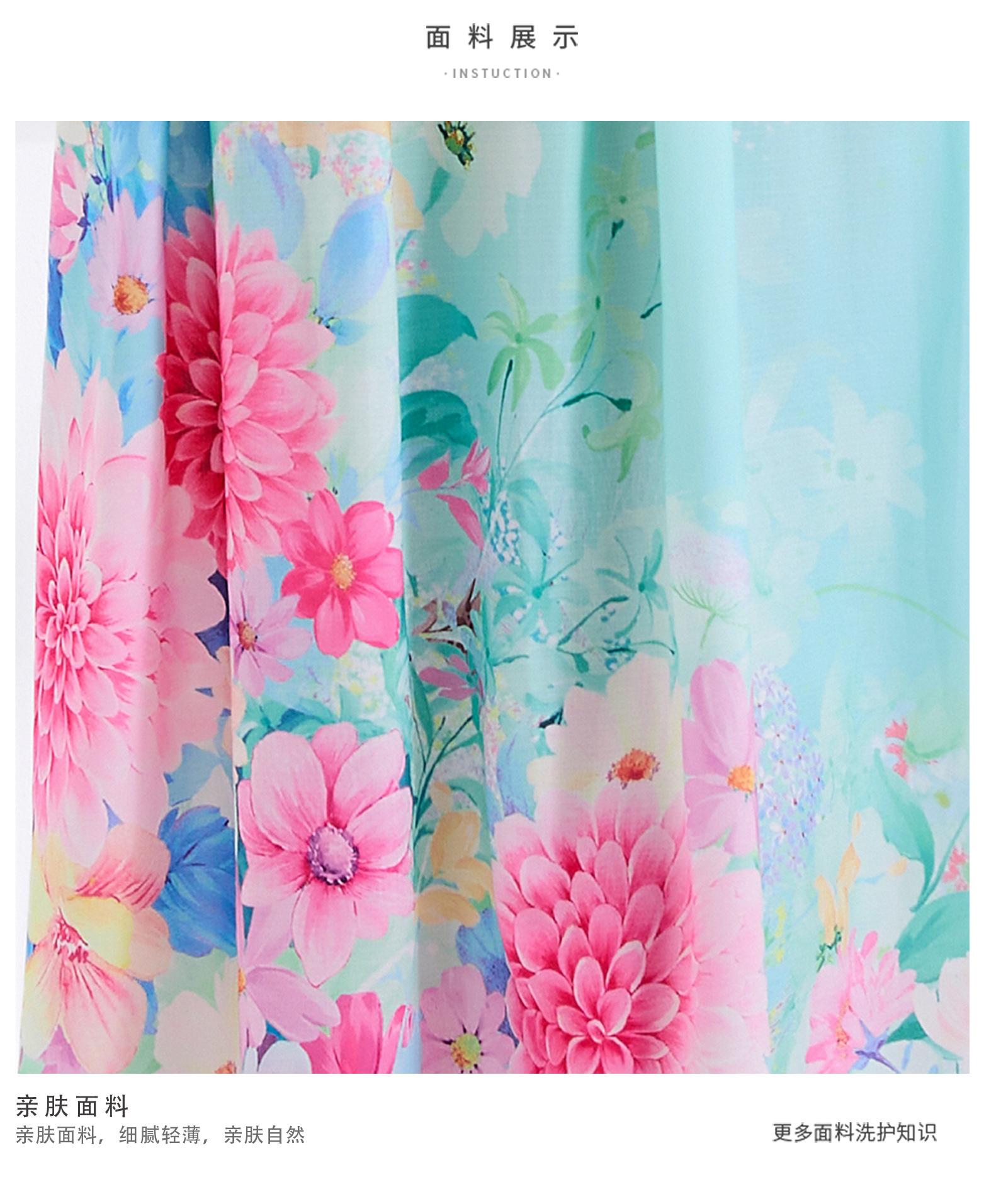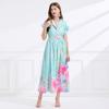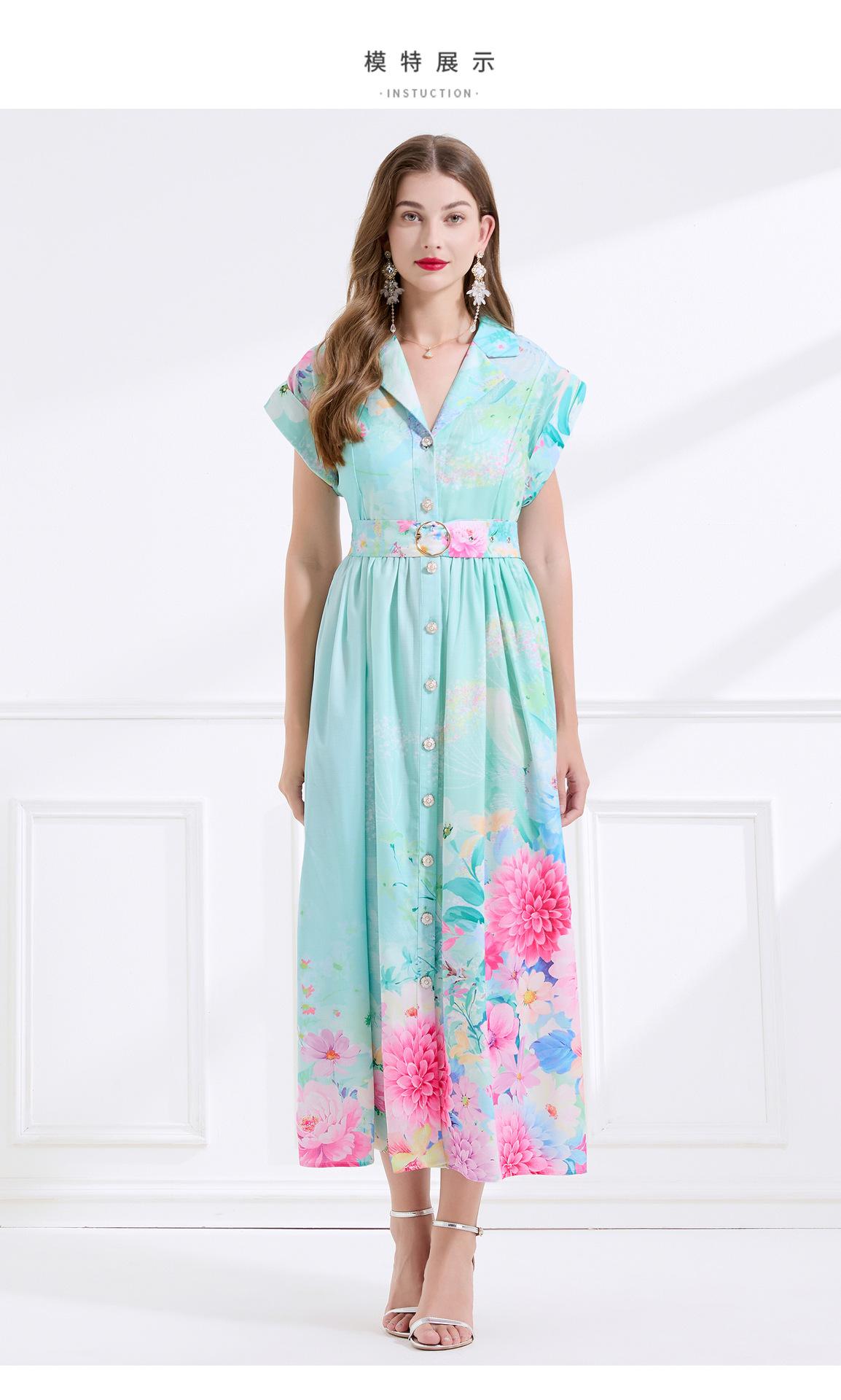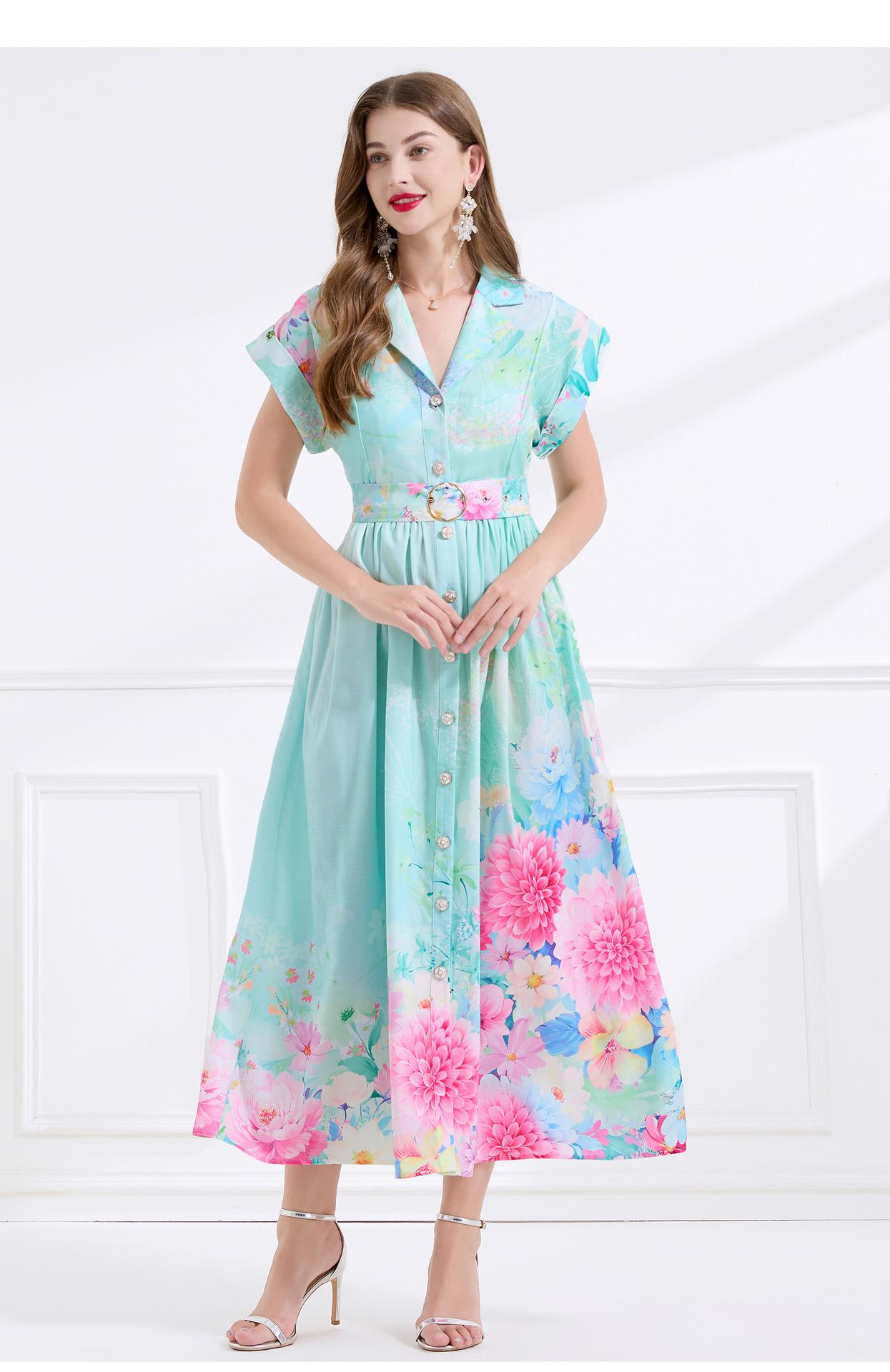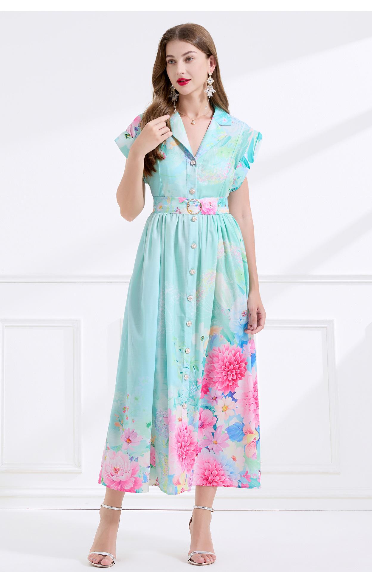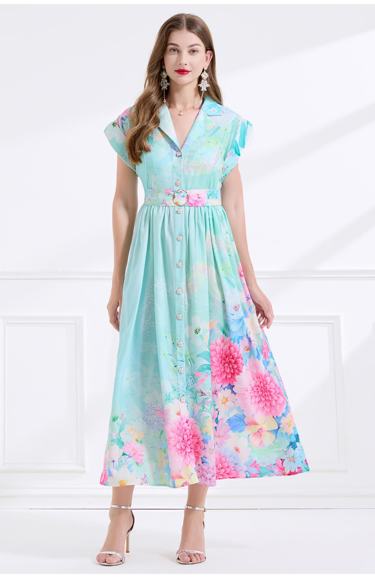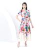 Traje 2025 Cuello de Solapa Manga Corta Cintura Estampado Floral Estilo Resort de Playa Falda con Volantes y Bajo Amplio