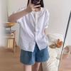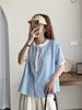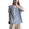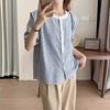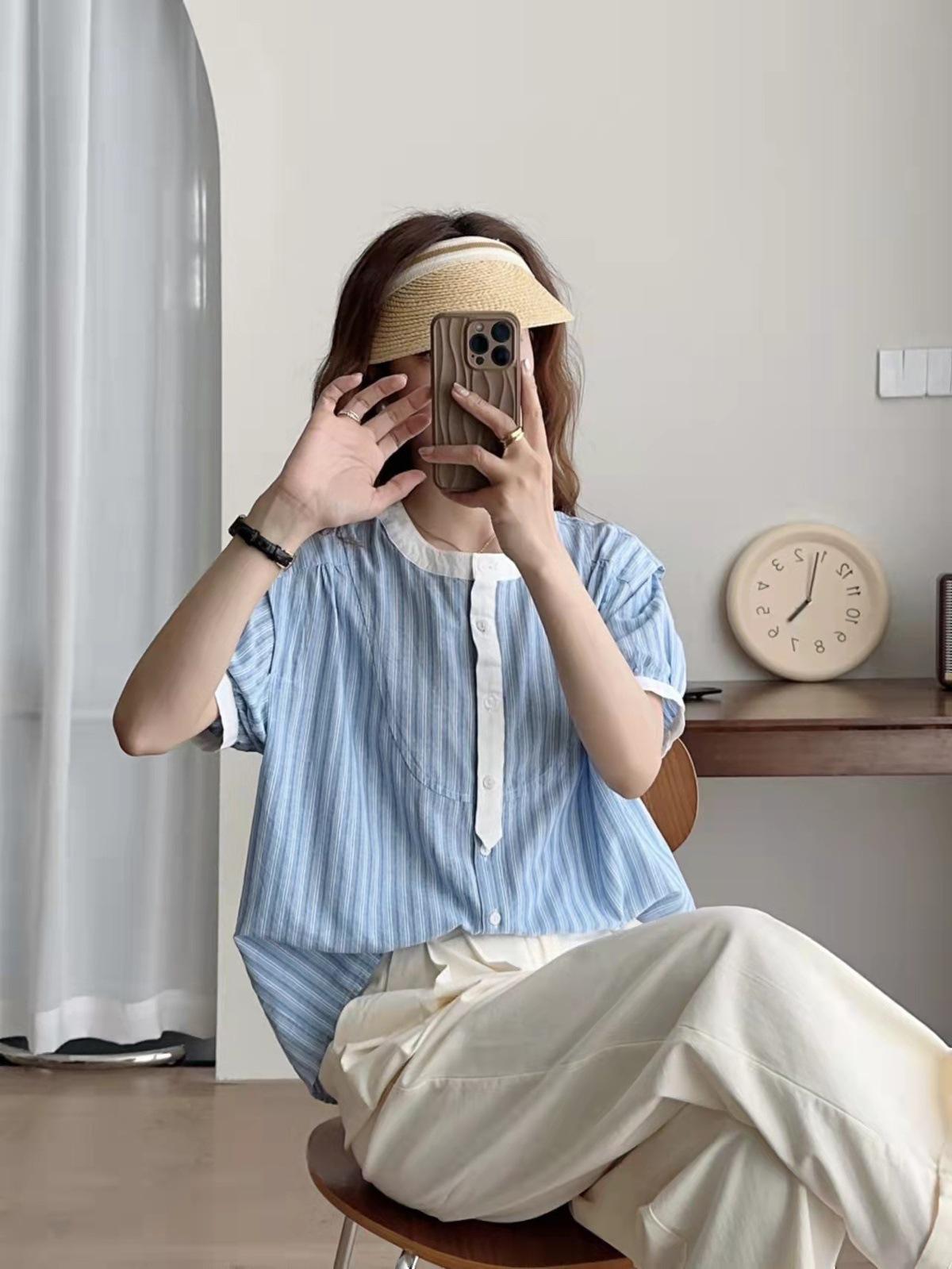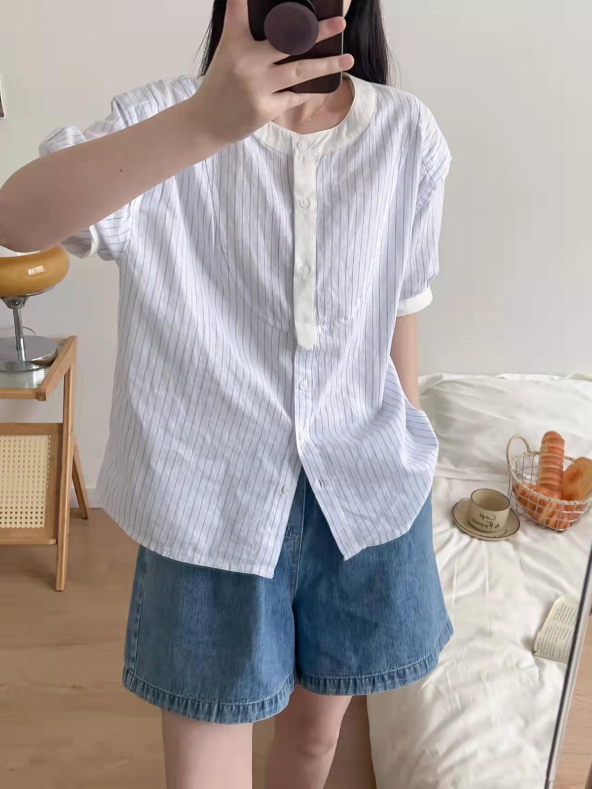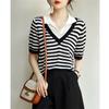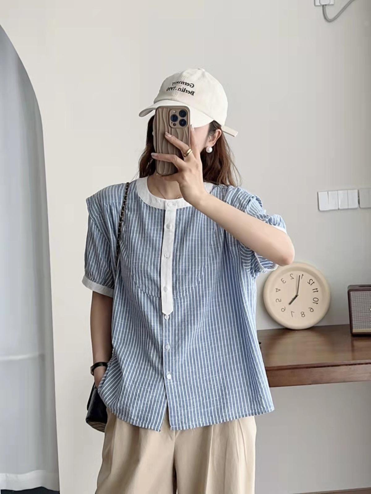 Camiseta sencilla y artística de cuello redondo con empalme de rayas verticales, verano, nuevo diseño, holgada, adelgazante, versátil, top de manga corta