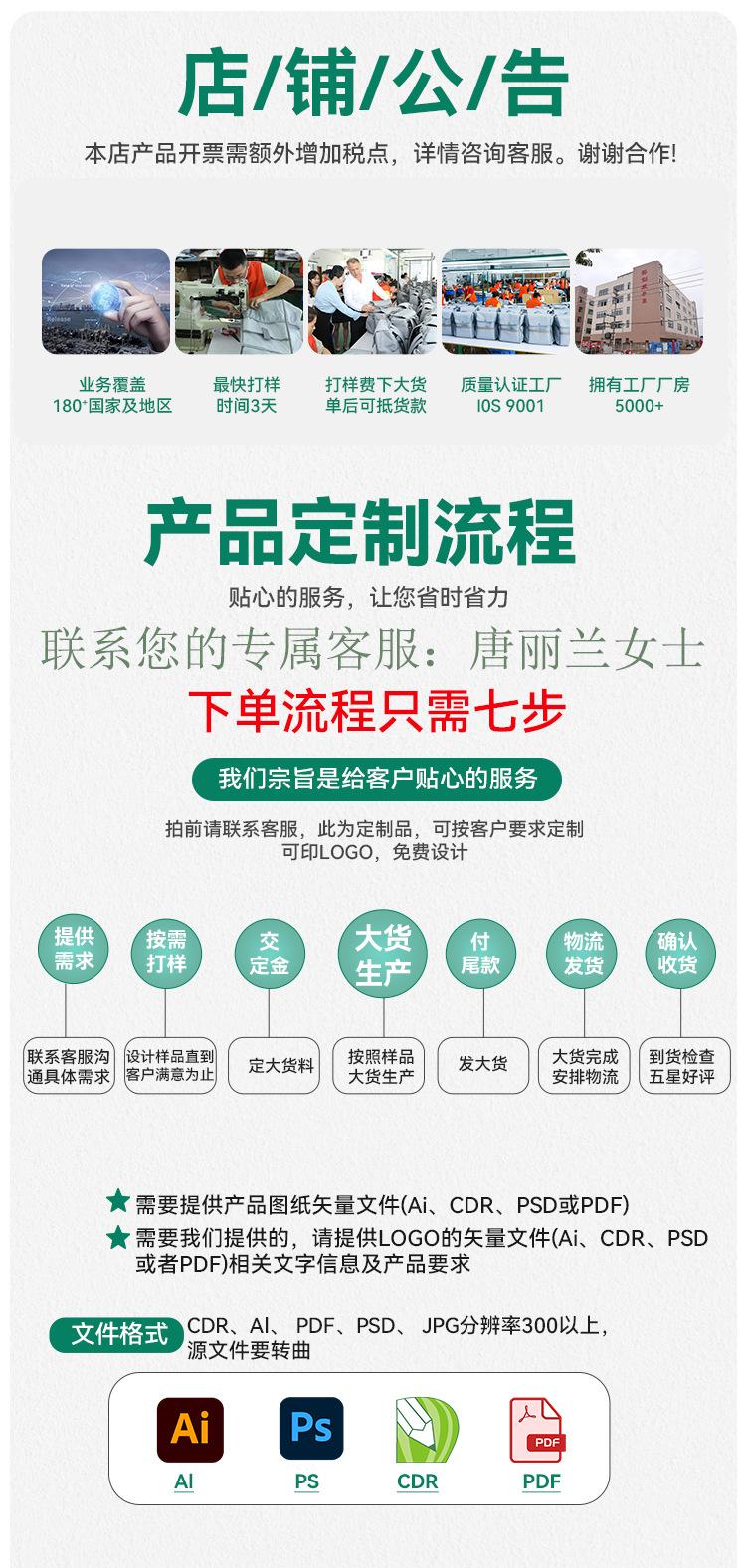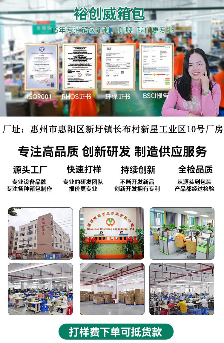 Huizhou Yu Chuang Wei Handbag Co., Ltd. está ubicada en el Edificio de Fábrica 10, Zona Industrial Xinxing, Aldea Changbu, Pueblo Xinwei, Distrito Huiyang, Ciudad de Huizhou, establecida el 1 de noviembre de 2022. Es una fábrica dependiente de Shenzhen Yu Chuang Wei Handbag Co., Ltd.,Tiene más de diez años de experiencia en la producción de bolsos y equipaje。El área de la fábrica es de 26000.00 metros cuadrados, y cuenta con certificado del sistema de gestión de calidad ISO9001 y auditoría de fábrica BSCI. Yuchuangwei fue calificada como una de las "Diez Mejores Marcas Chinas de Equipaje" en 2017. Nuestra empresa es contribuyente general,Se podrá emitir factura con IVA del 13%. Cuenta con una sala de corte, taller de producción, departamento de control de calidad, departamento de desarrollo y departamento de voltaje, proporcionando un servicio integral para la confección de patrones y la producción. El equipo incluye máquinas de coser planas computarizadas, máquinas DY, máquinas de alta velocidad, máquinas de coser computarizadas y remachadoras, etc. Hay alrededor de 500 trabajadores, con más de 10 líneas de producción y un taller de impresión independiente. Los productos profesionales fabricados incluyen bolsas para exteriores, bolsas para computadora, bolsas térmicas, bolsas para mascotas, bolsas de compras, mochilas, bolsos de mano, bolsas de herramientas, riñoneras, bolsas para documentos, bolsas de cosméticos, bolsas para mamás, bolsas para pizarras de dibujo para niños, bolsas para árboles de Navidad, etc.Los productos fabricados y operados pueden cumplir todos con las nuevas pruebas europeas de protección ambiental de la agencia de pruebas SGS, y cuentan con informes de prueba que cumplen con los estándares libres de plomo y estaño de los países europeos y americanos.Amigos de todos los ámbitos de la vida son bienvenidos a visitar la fábrica de bolsos Yuchuangwei para visitar, recibir orientación y negociar negocios.