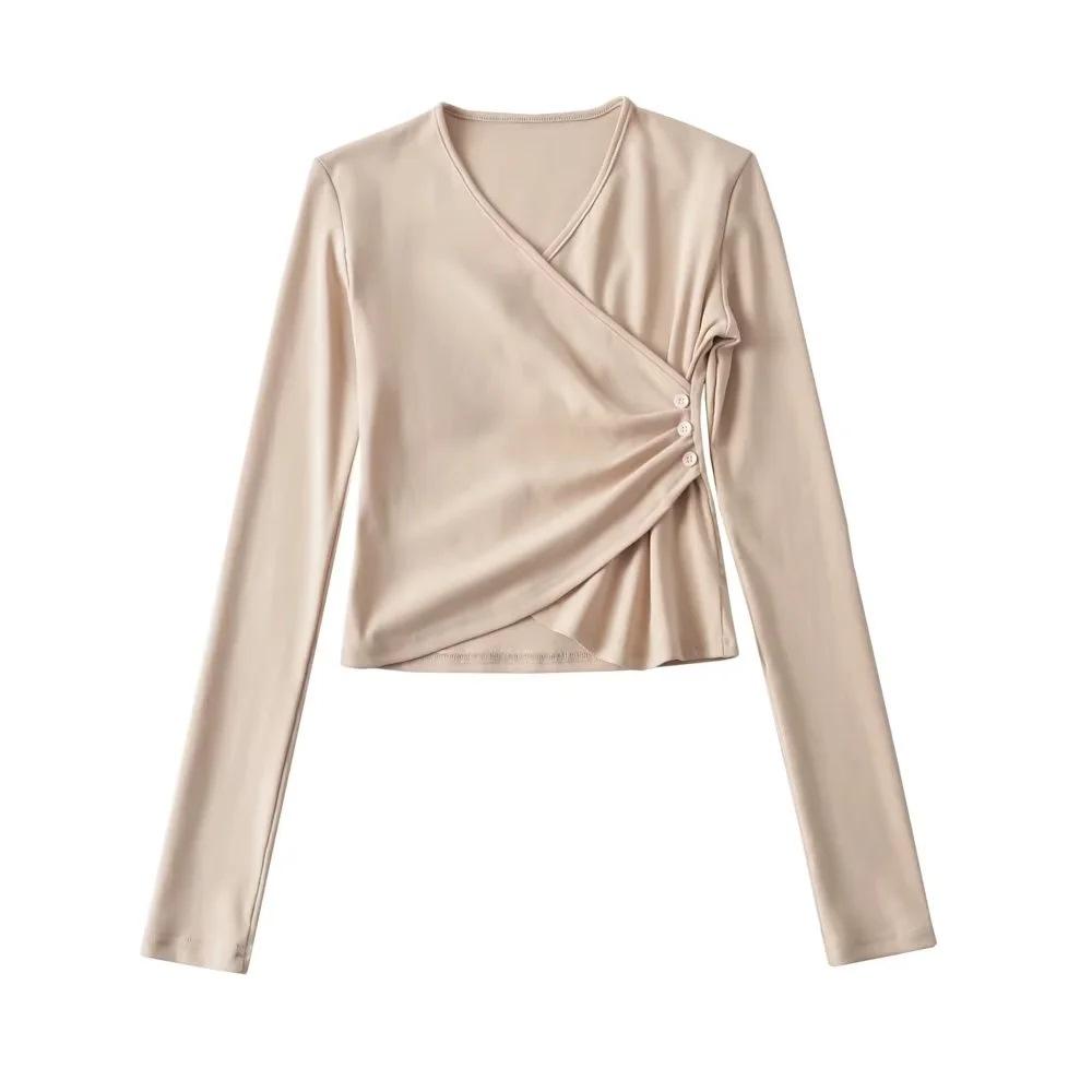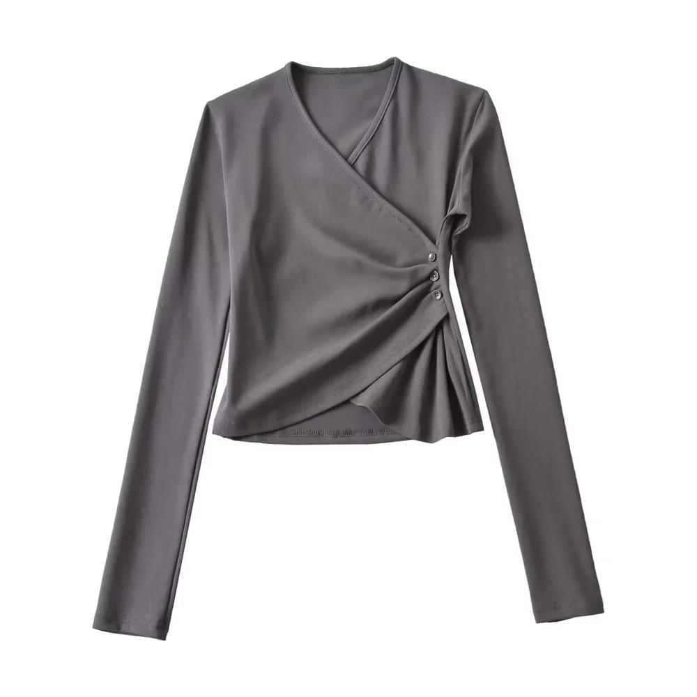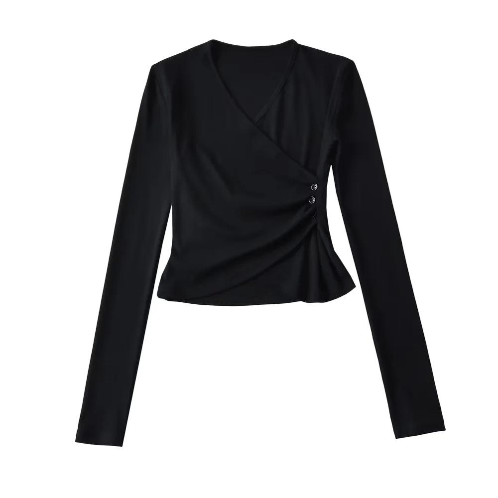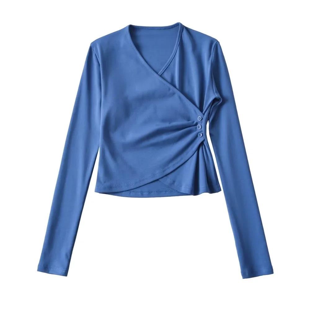 Camiseta de Manga Larga con Cuello en V Cruzado de Tres Hebillas y Pliegue Lateral Irregular de Estilo Europeo y Americano para Mujer