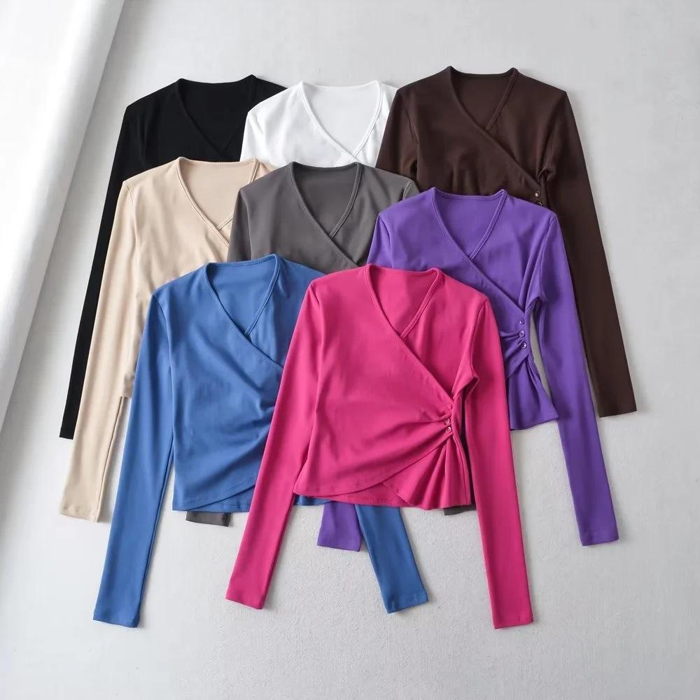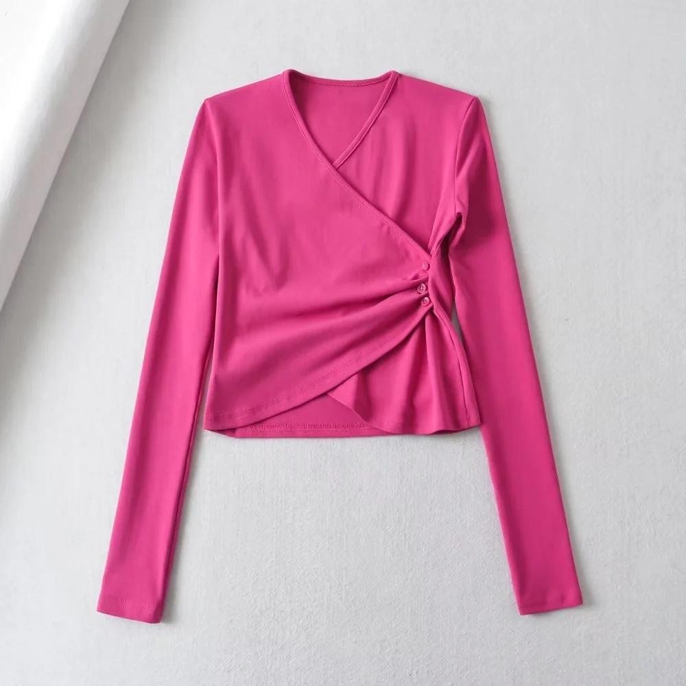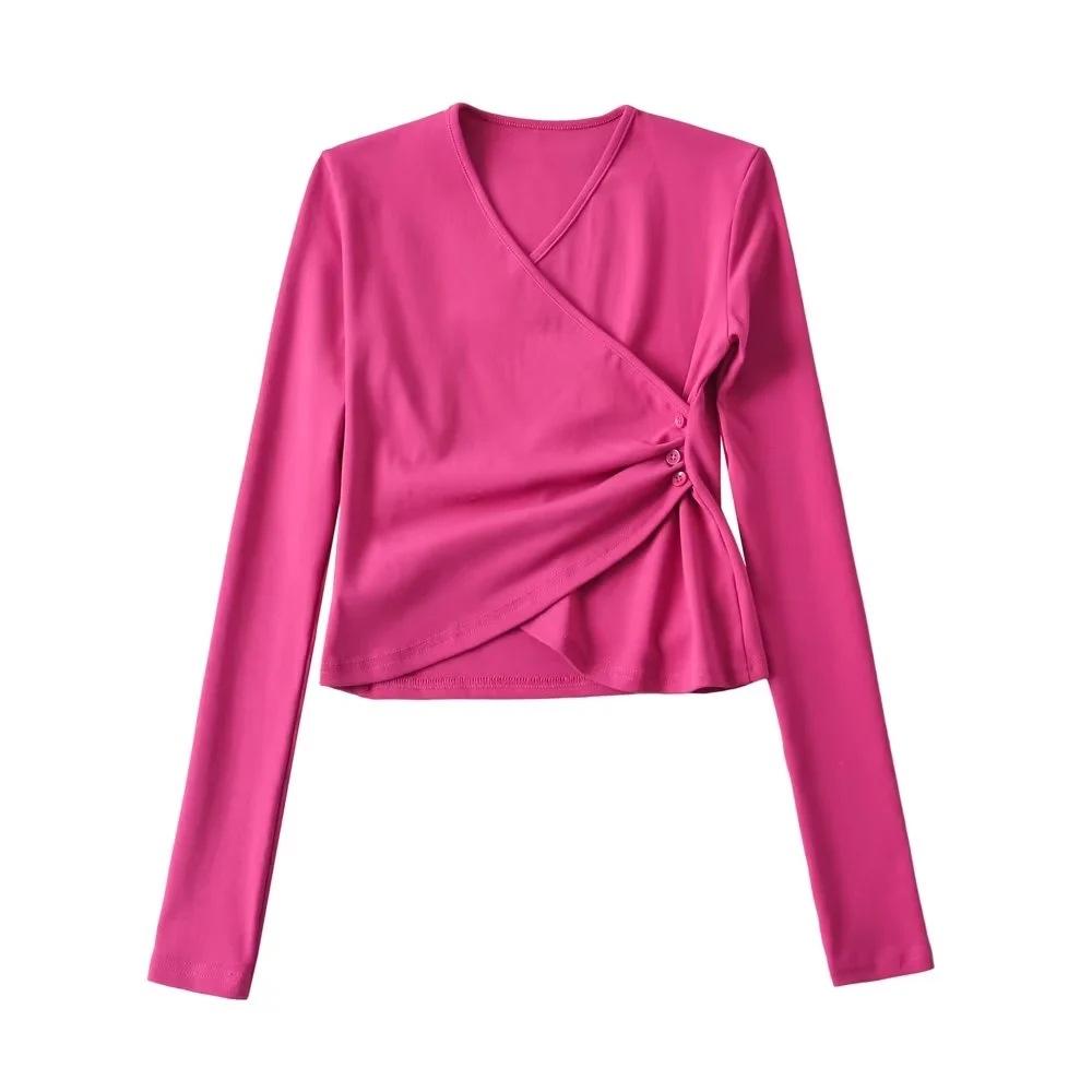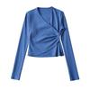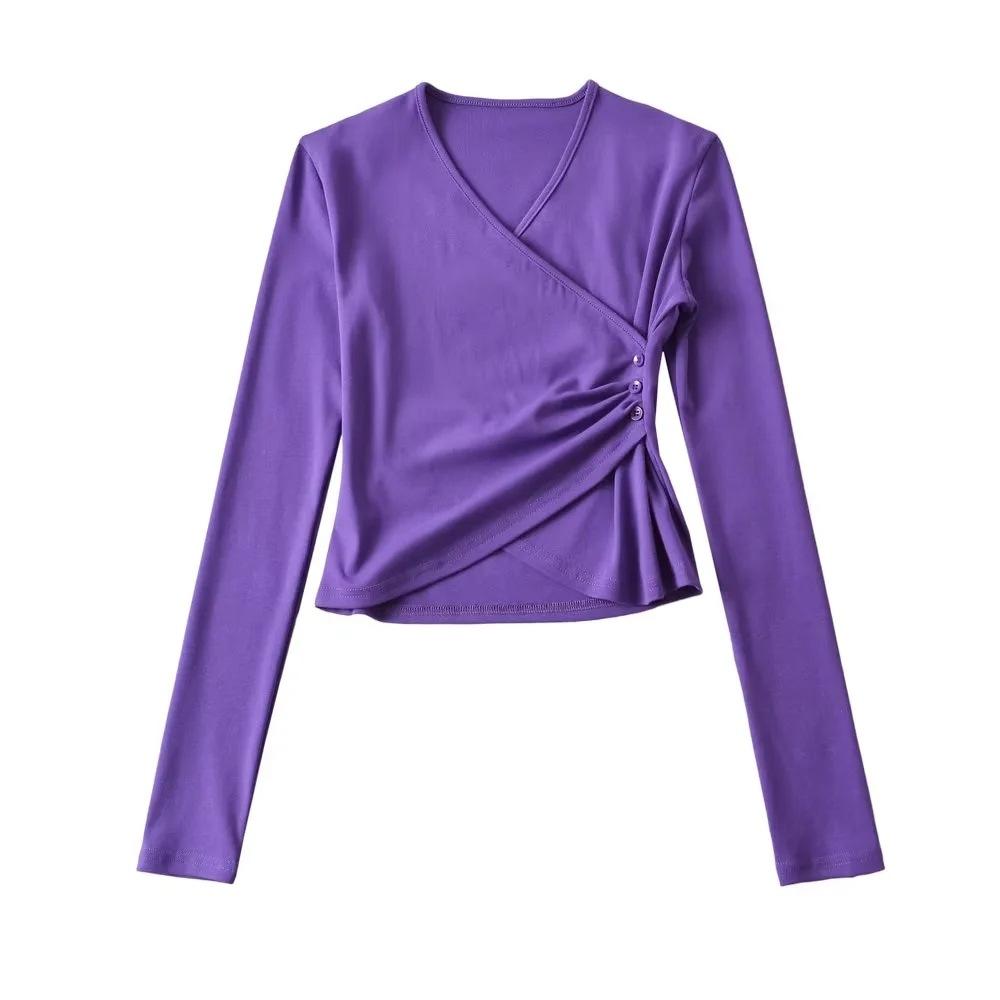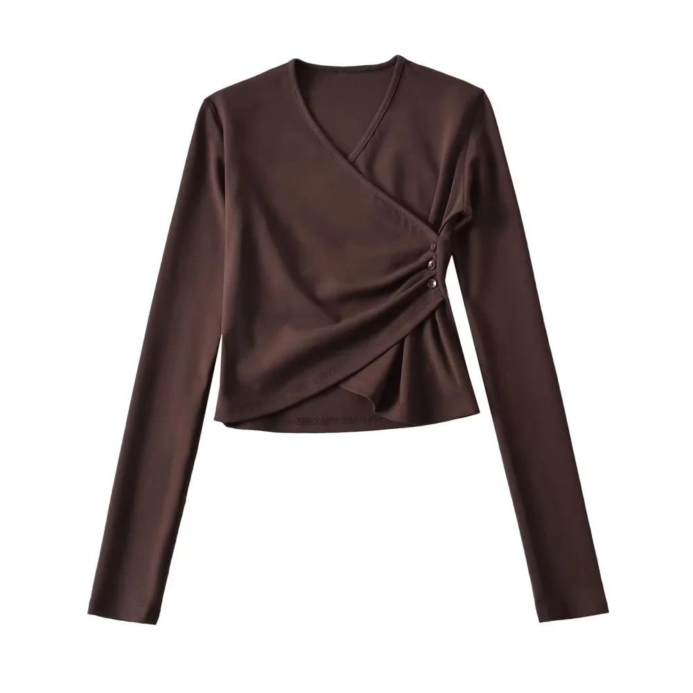 Camiseta de Manga Larga con Cuello en V Cruzado de Tres Hebillas y Pliegue Lateral Irregular de Estilo Europeo y Americano para Mujer