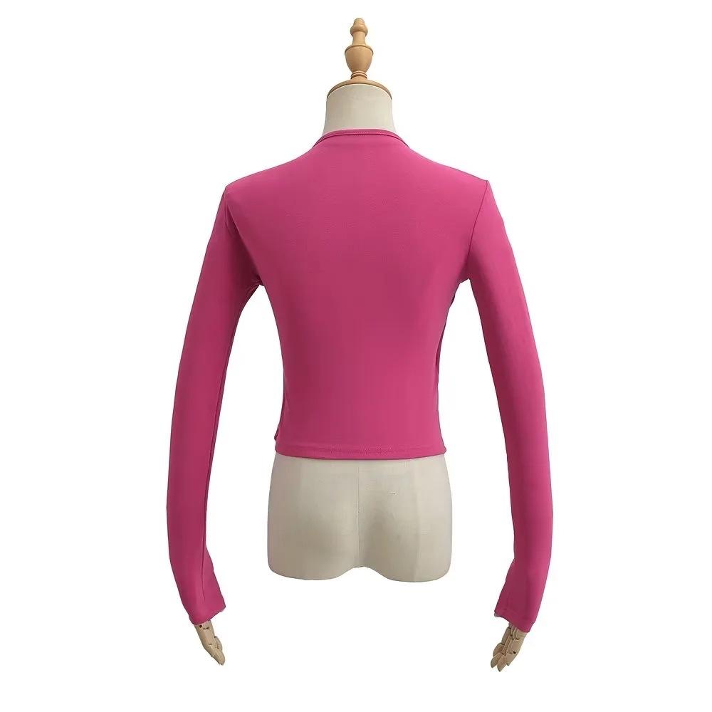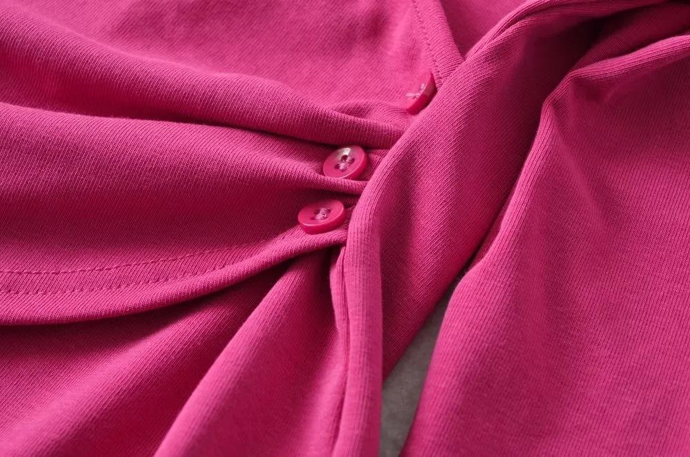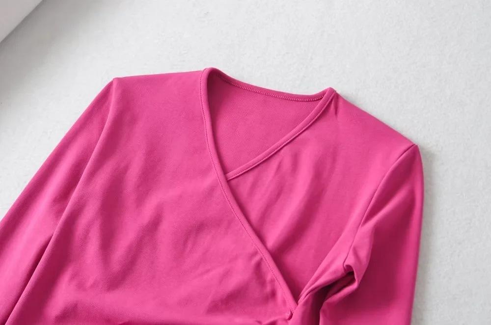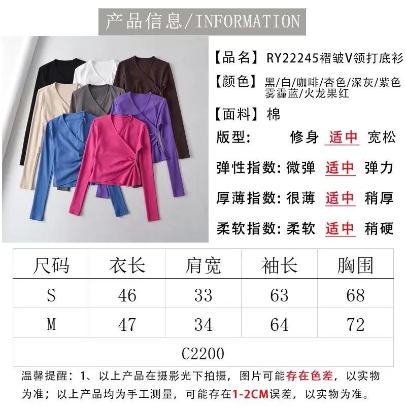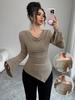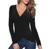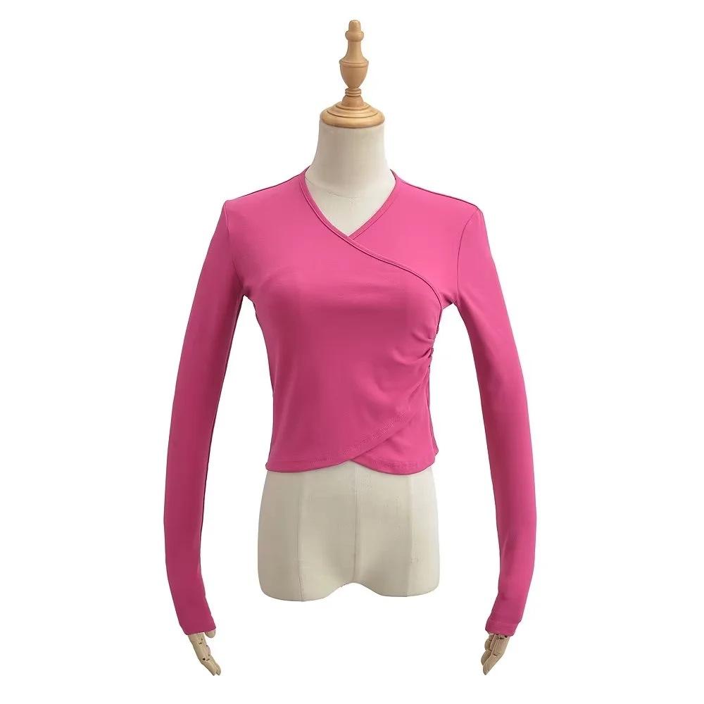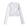 Camiseta de Manga Larga con Cuello en V Cruzado de Tres Hebillas y Pliegue Lateral Irregular de Estilo Europeo y Americano para Mujer