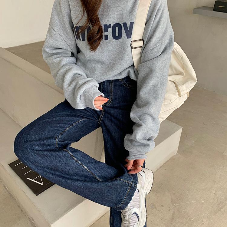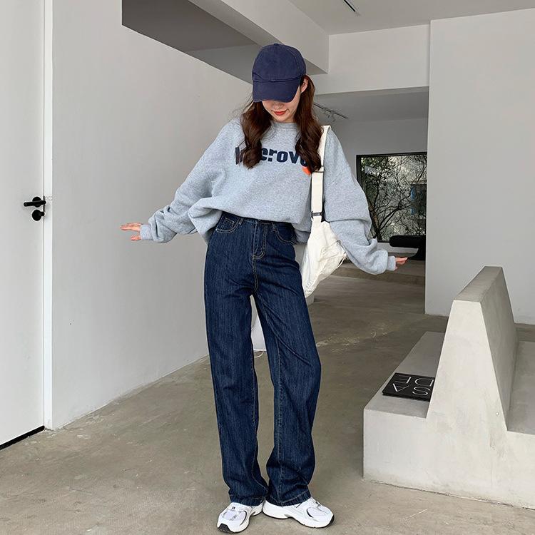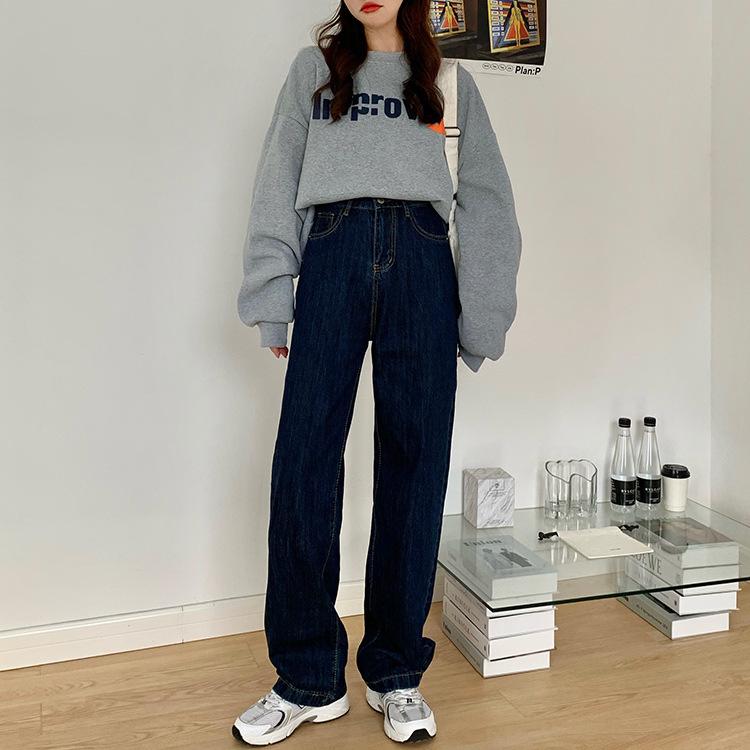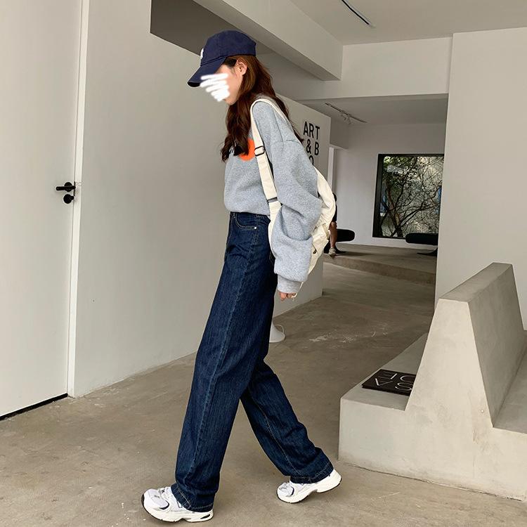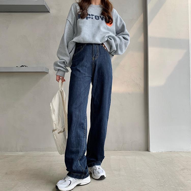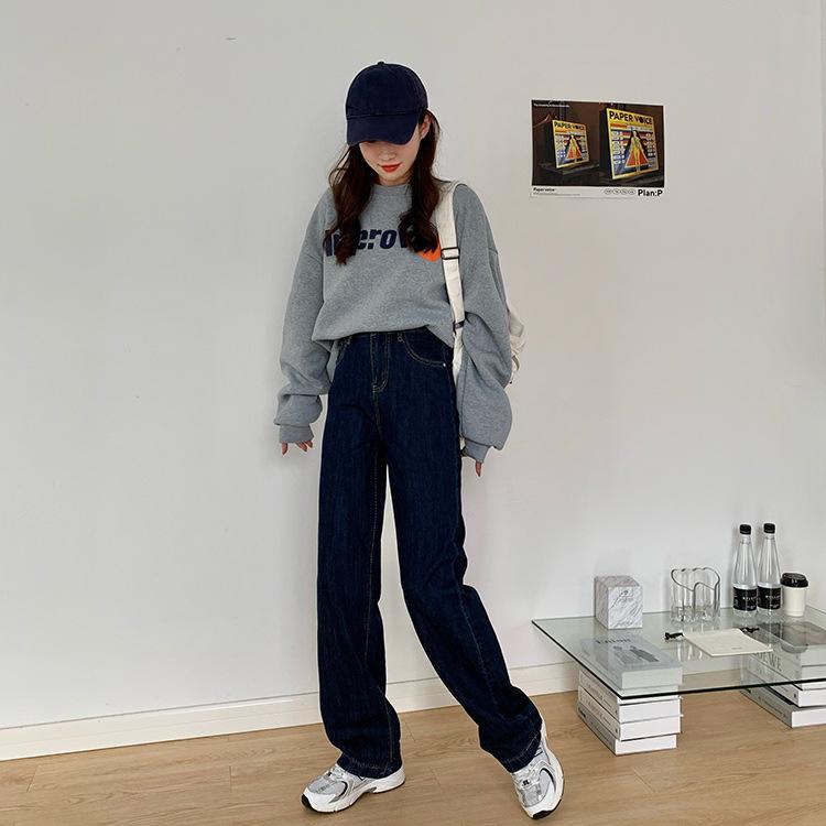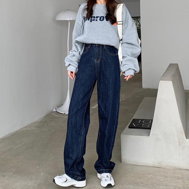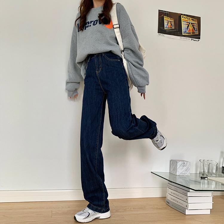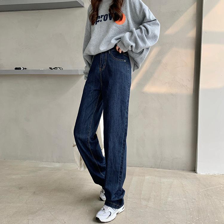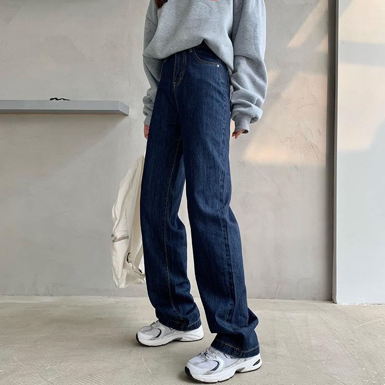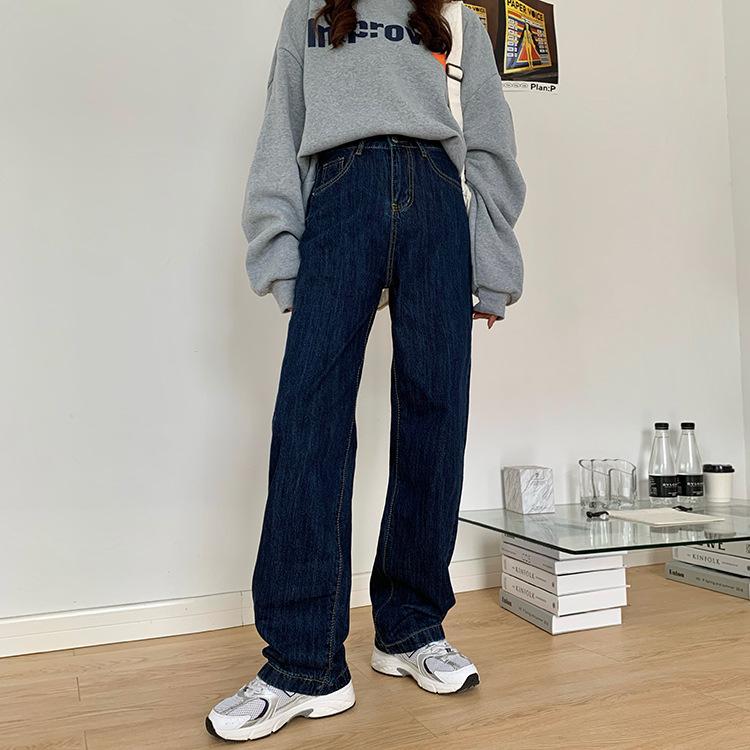 Otoño 2024 Nuevo jeans azul oscuro de pierna recta y corte holgado para mujer, pantalones de cintura alta, pantalones de pierna ancha, pantalones