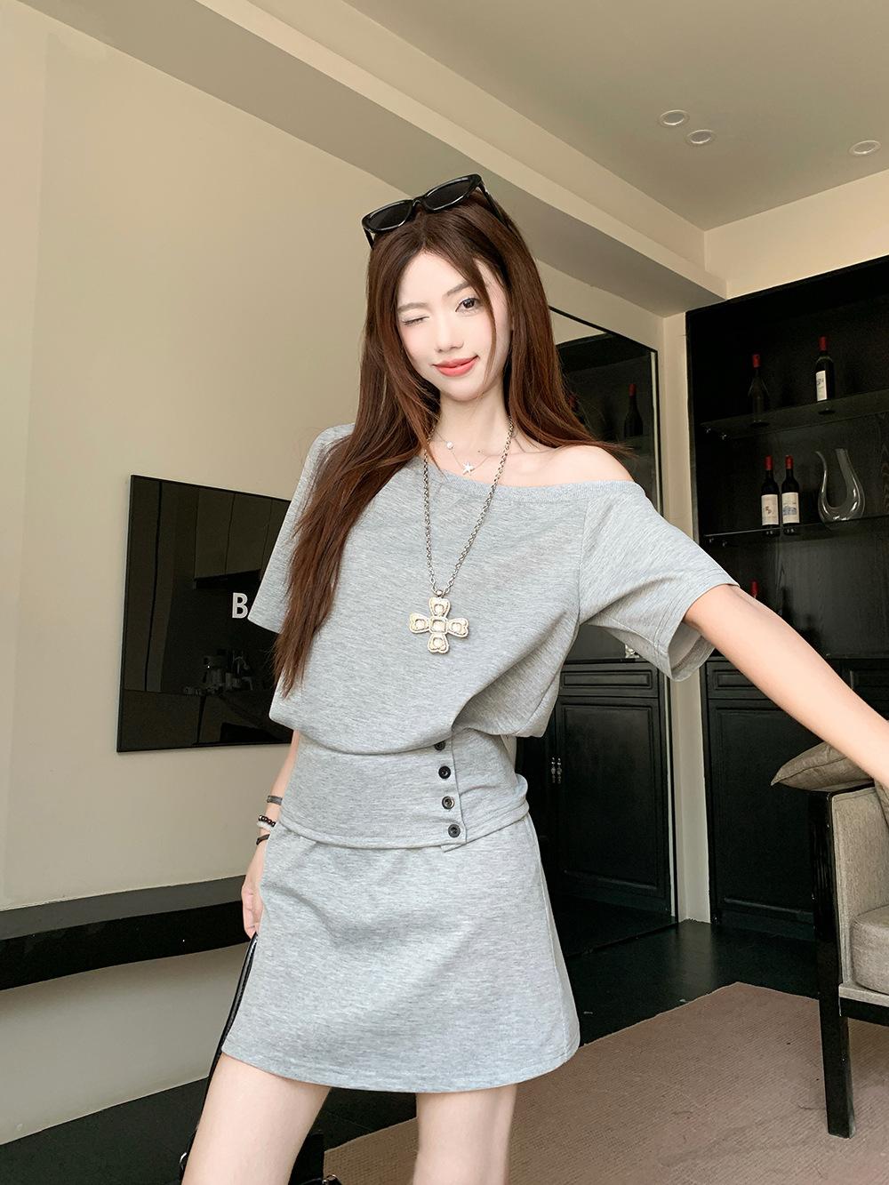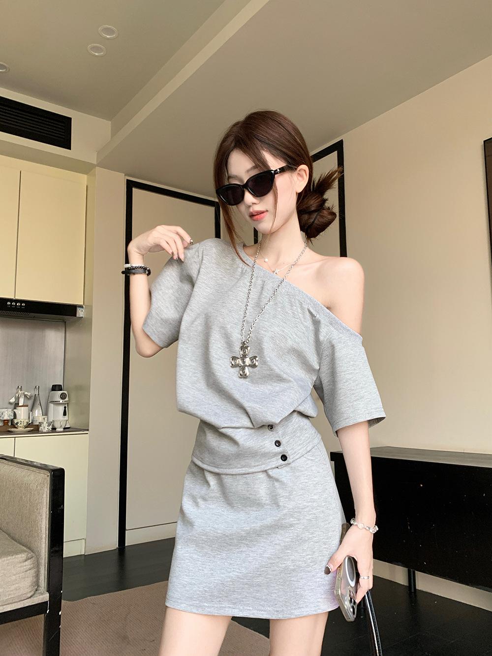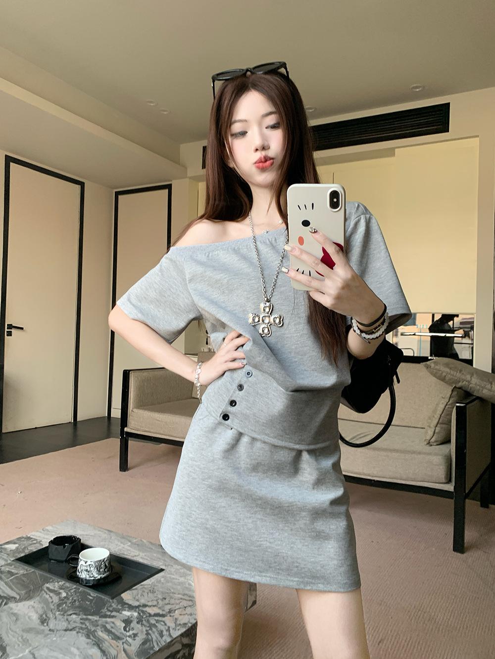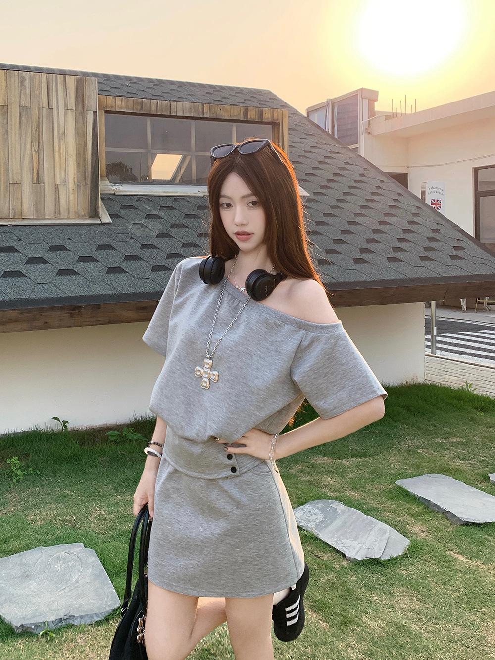 Traje de Mujer Estilo Coreano Verano Ins Nuevo Top de Manga Corta con Hombro Caído + Falda Elegante Adelgazante de Cintura Alta Conjunto de Dos Piezas