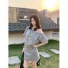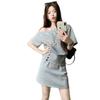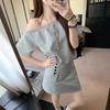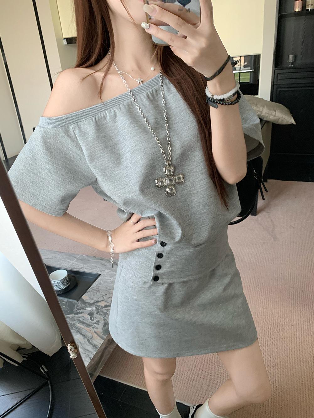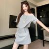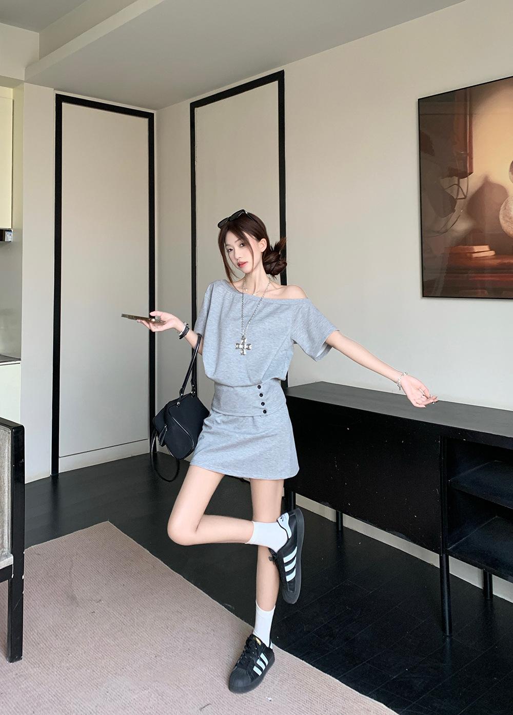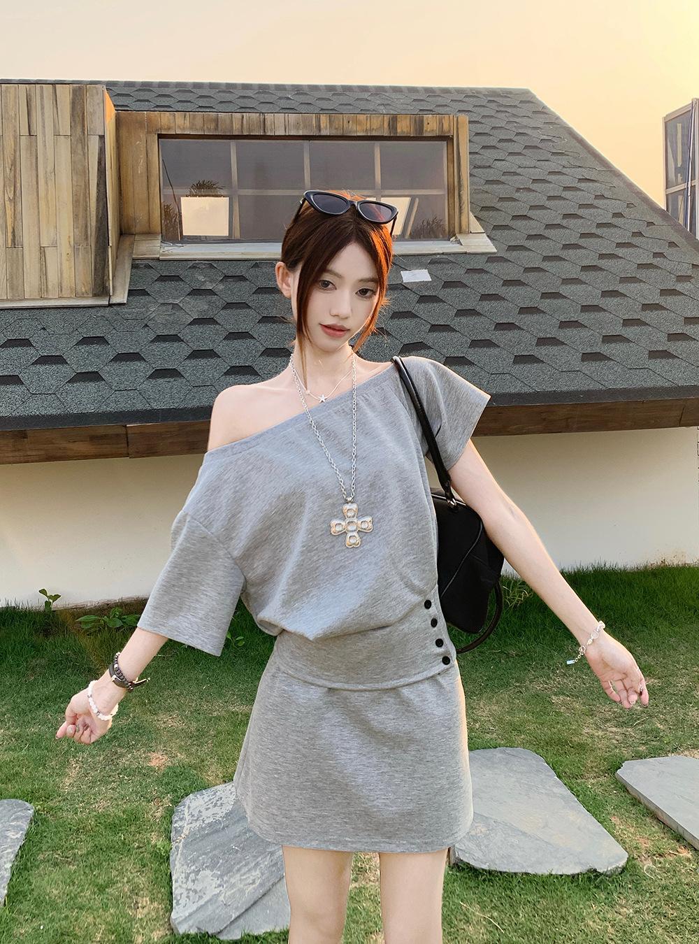 Traje de Mujer Estilo Coreano Verano Ins Nuevo Top de Manga Corta con Hombro Caído + Falda Elegante Adelgazante de Cintura Alta Conjunto de Dos Piezas