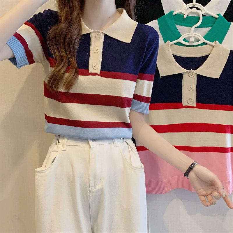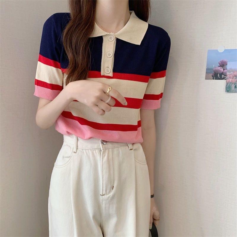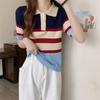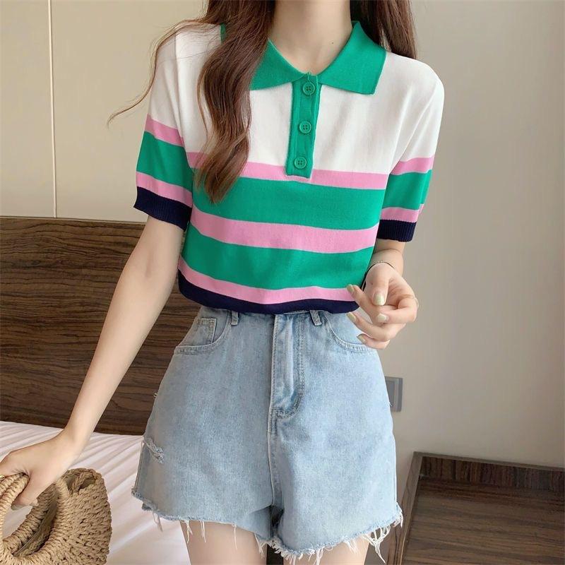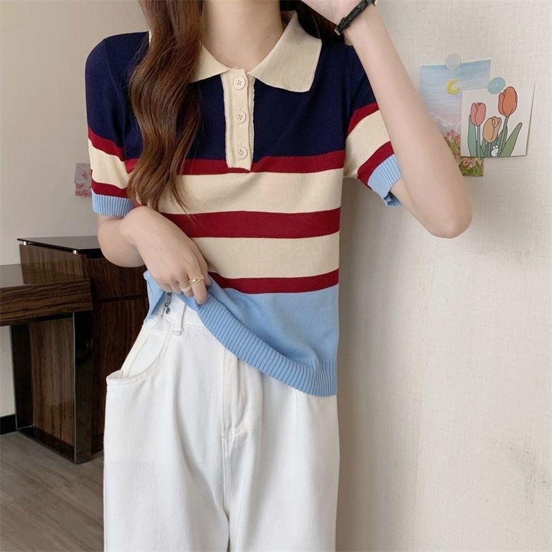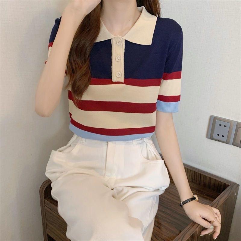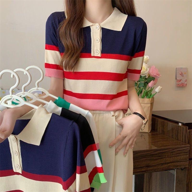 Verano 2024 Nuevo polo de punto de manga corta holgado y adelgazante con solapa a rayas para mujer, top estilo coreano ins