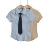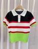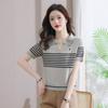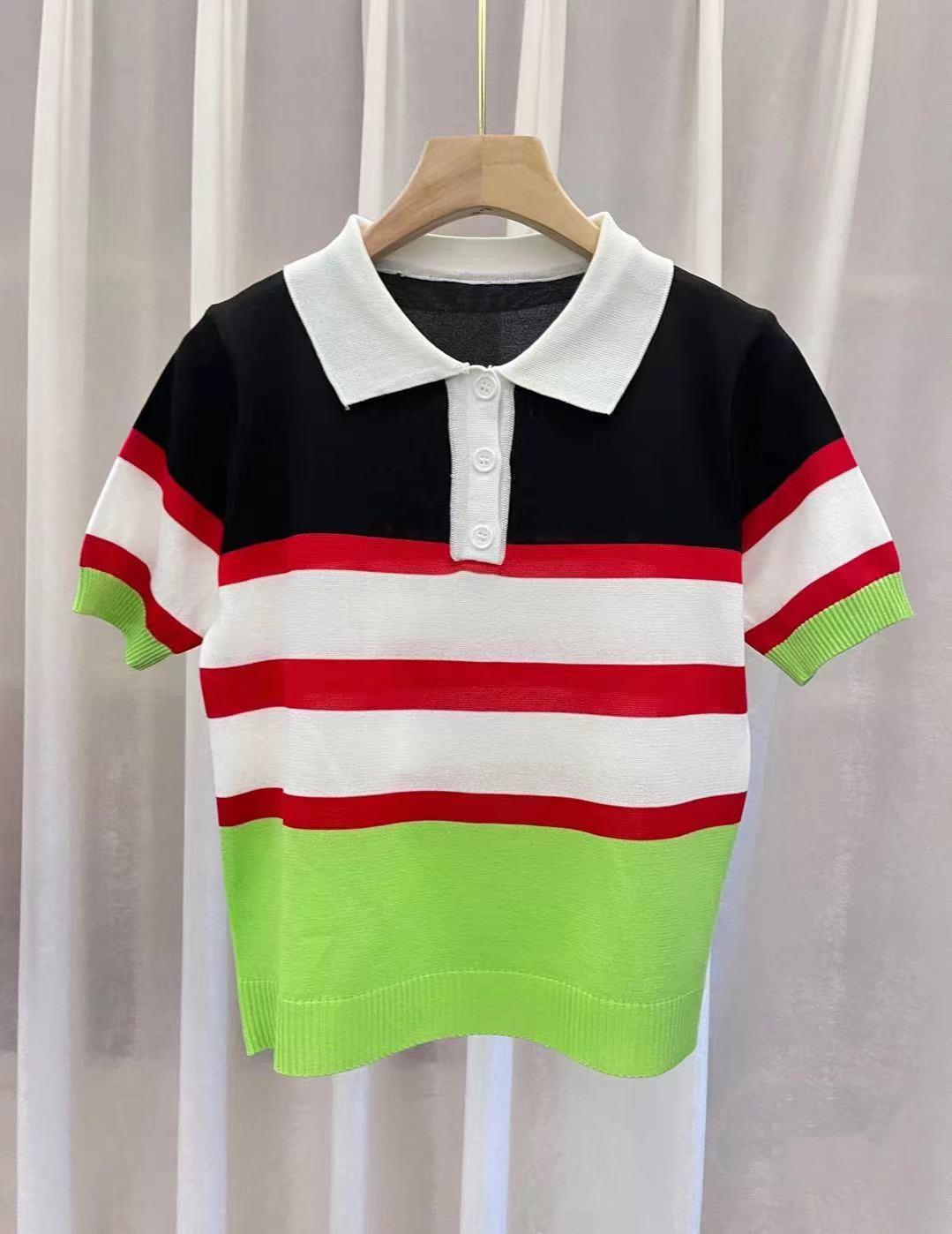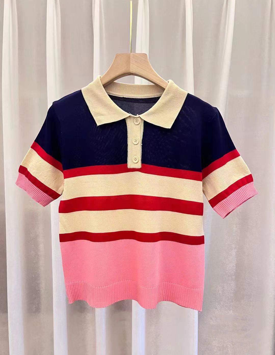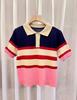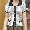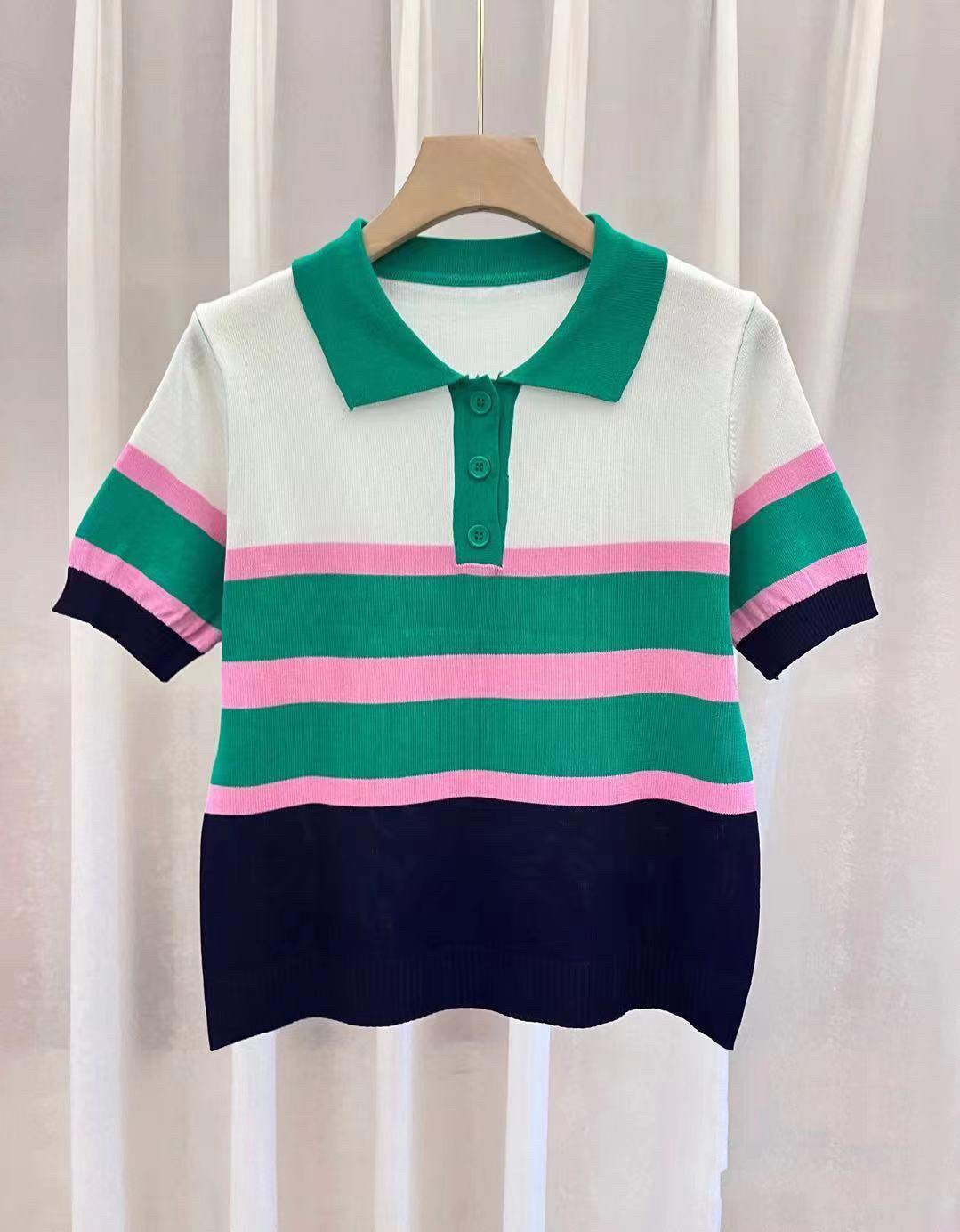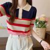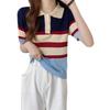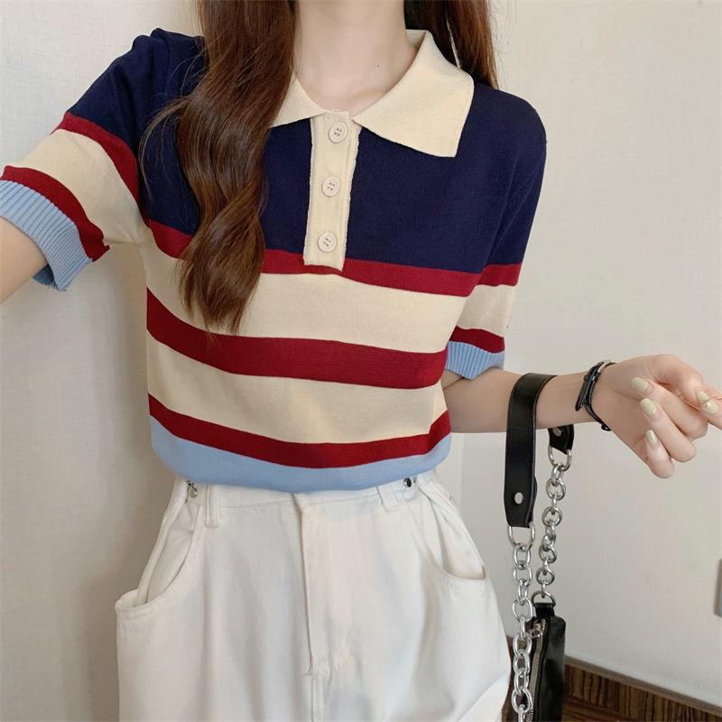 Verano 2024 Nuevo polo de punto de manga corta holgado y adelgazante con solapa a rayas para mujer, top estilo coreano ins