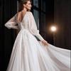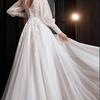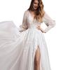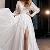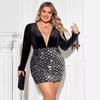 Vestido de manga larga de la serie de malla pequeña de talla grande europea y americana, sexy encaje, cuello en V, espalda en V, vestido con abertura alta