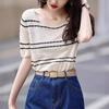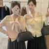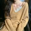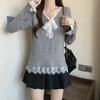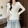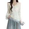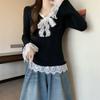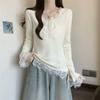 Dulce Punto de Encaje con Cuello en V y Manga Acampanada de Manga Larga para Mujer Otoño e Invierno Moda Chic Adelgazante que Reduce la Edad Punto Base