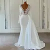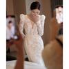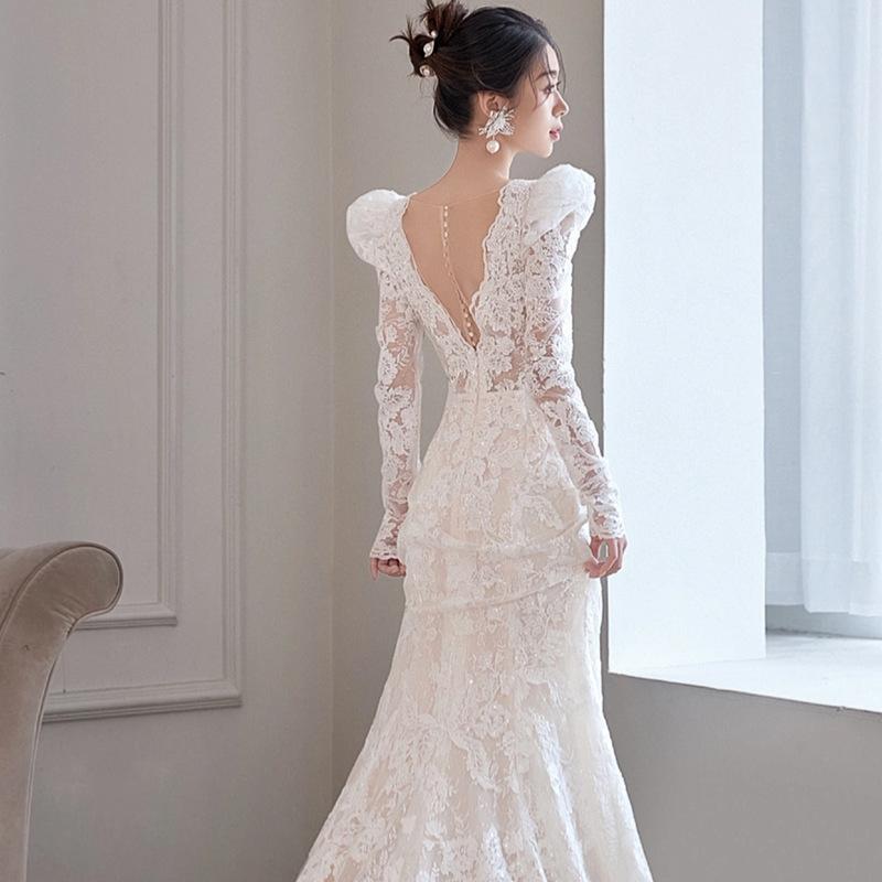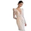 Vestido de encaje cola de pez de alta calidad cuello en V espalda en V manga larga con pequeña cola vestido de novia blanco para novia para exteriores de hilo vestido de novia