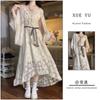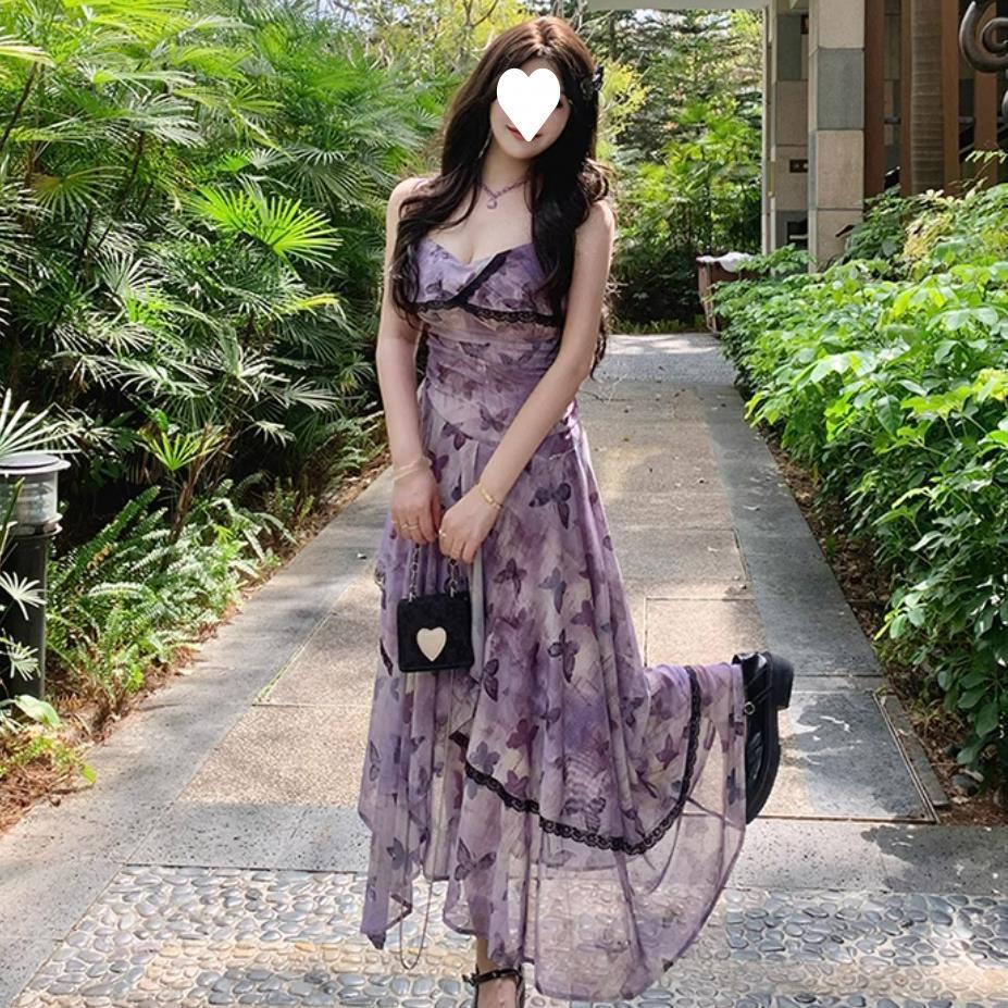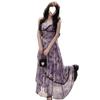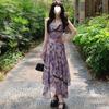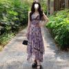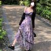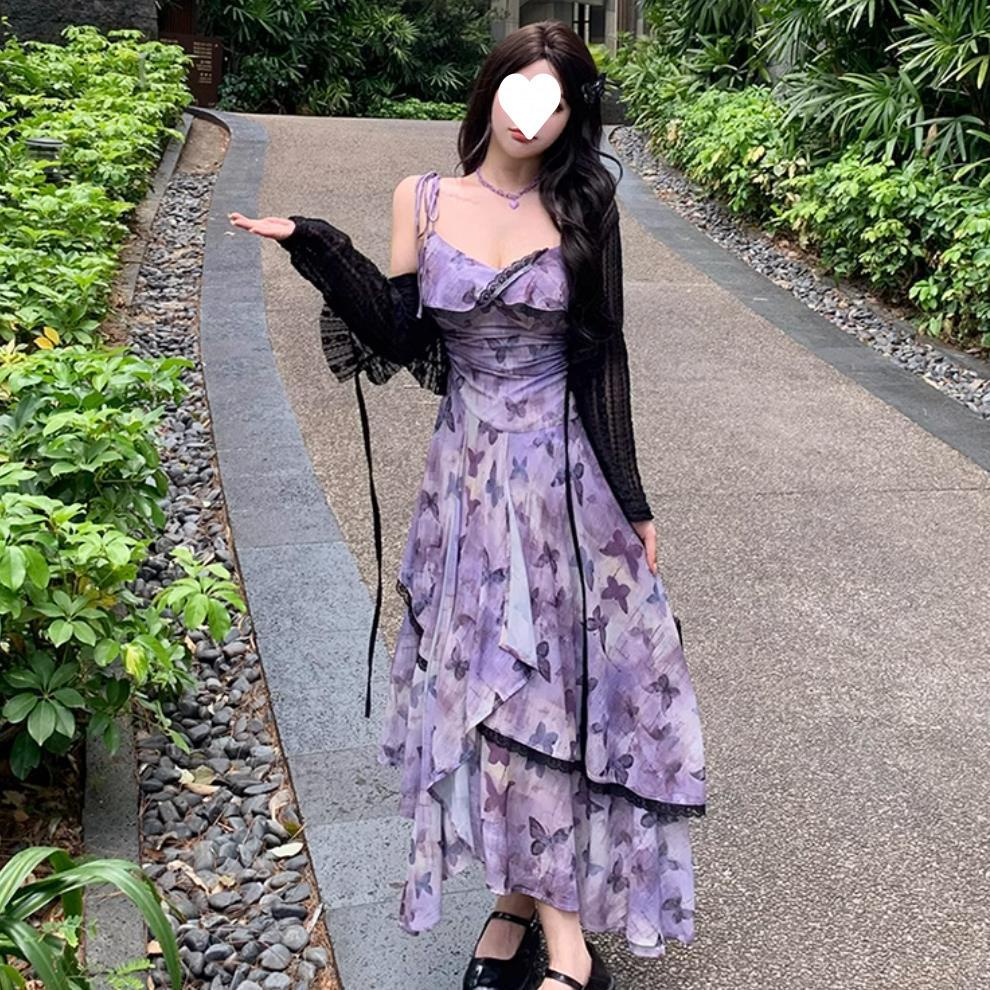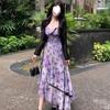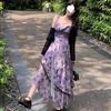 Traje Pequeño de Primavera Flor al Óleo Floral Asimétrico Malla Vestido de Tirantes Corte para Mujer Cárdigan Calado Falda Larga