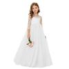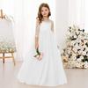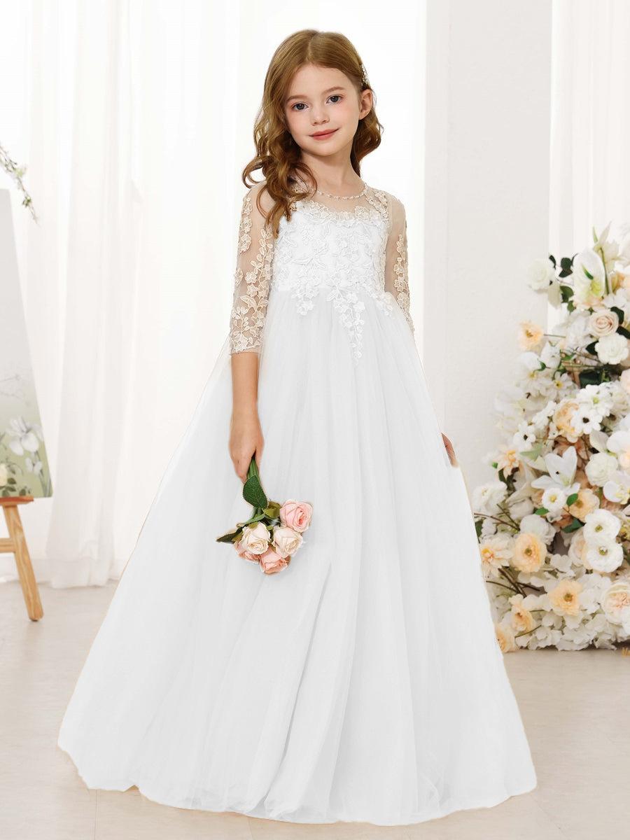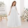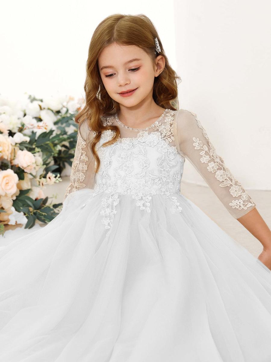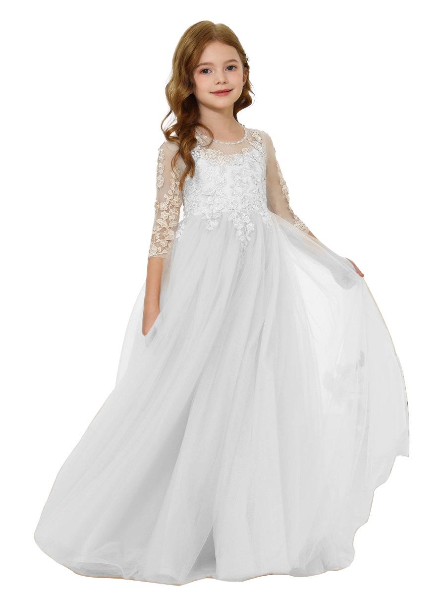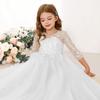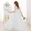 Ropa Infantil Transfronteriza de Amazon Vestido de Niña Vestido de Dama de Honor Vestido de Boda Encaje Cuello Redondo Manga Larga Vestido de Tul Blanco