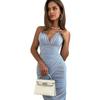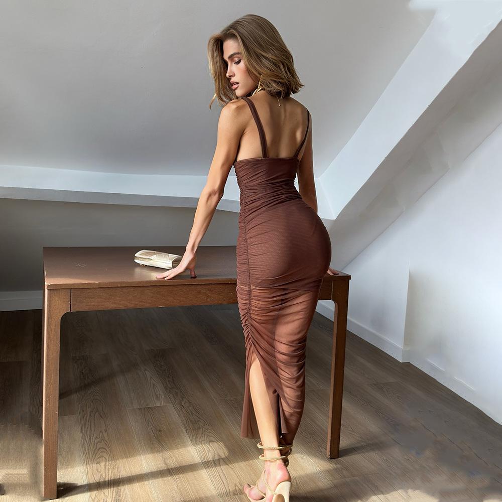 Europeo y Americano 2025 Nuevo Estilo Tirantes Profundo V Sexy Plisado Cintura Eslbelta Malla Vestido Mujer Venta al por Mayor