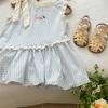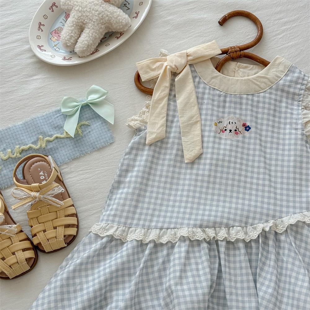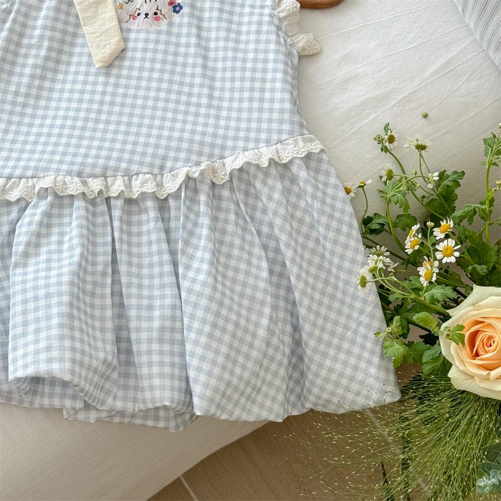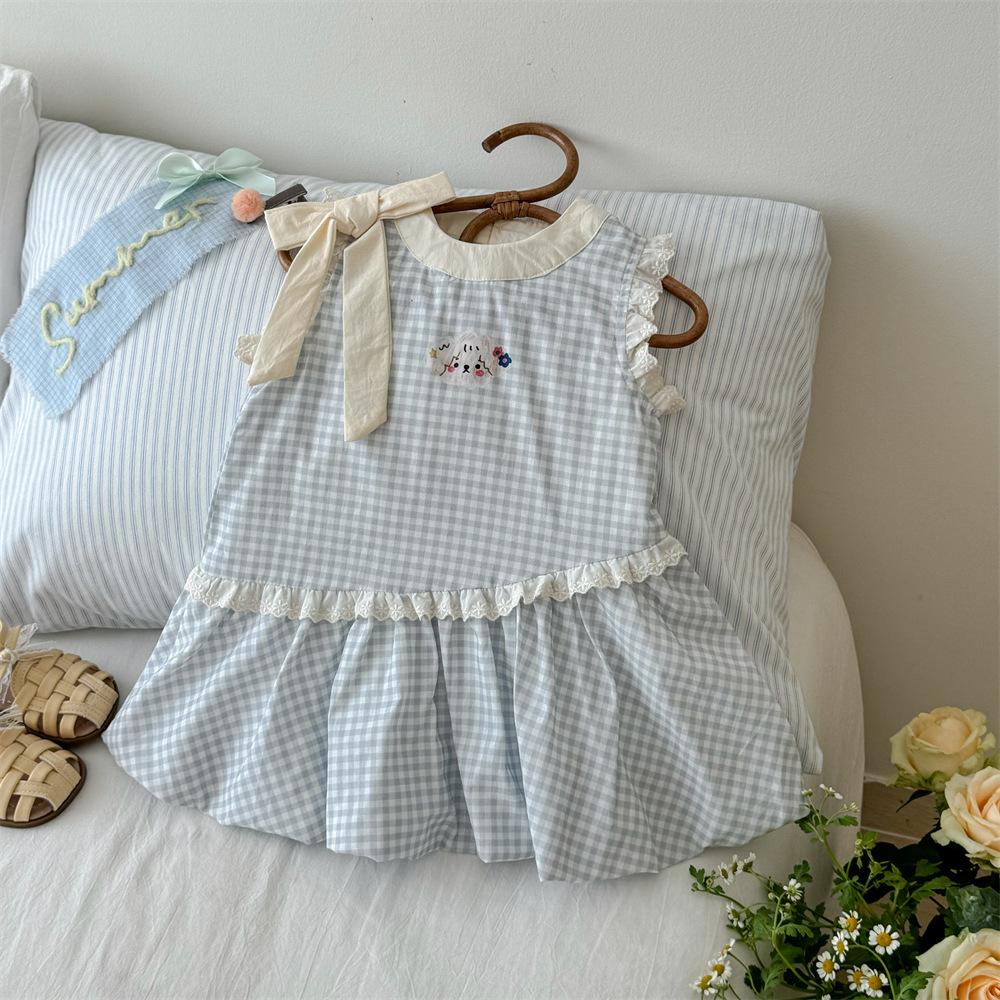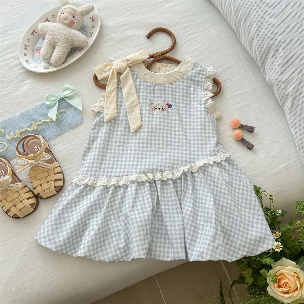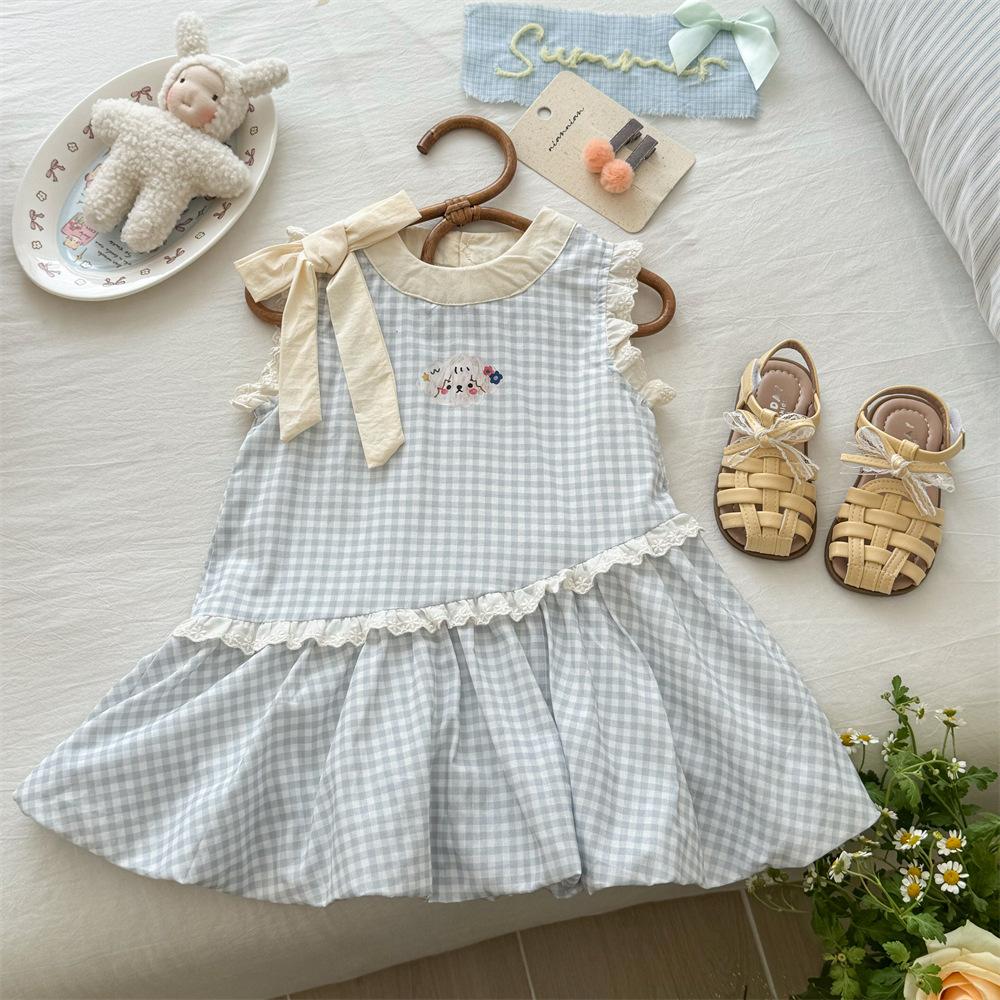 Vestido de niña 2025 Verano Estilo Coreano Dulce Lazo Cuadros Azules Bebé Lindo Capullo de Flor Vestido Chaleco Moderno