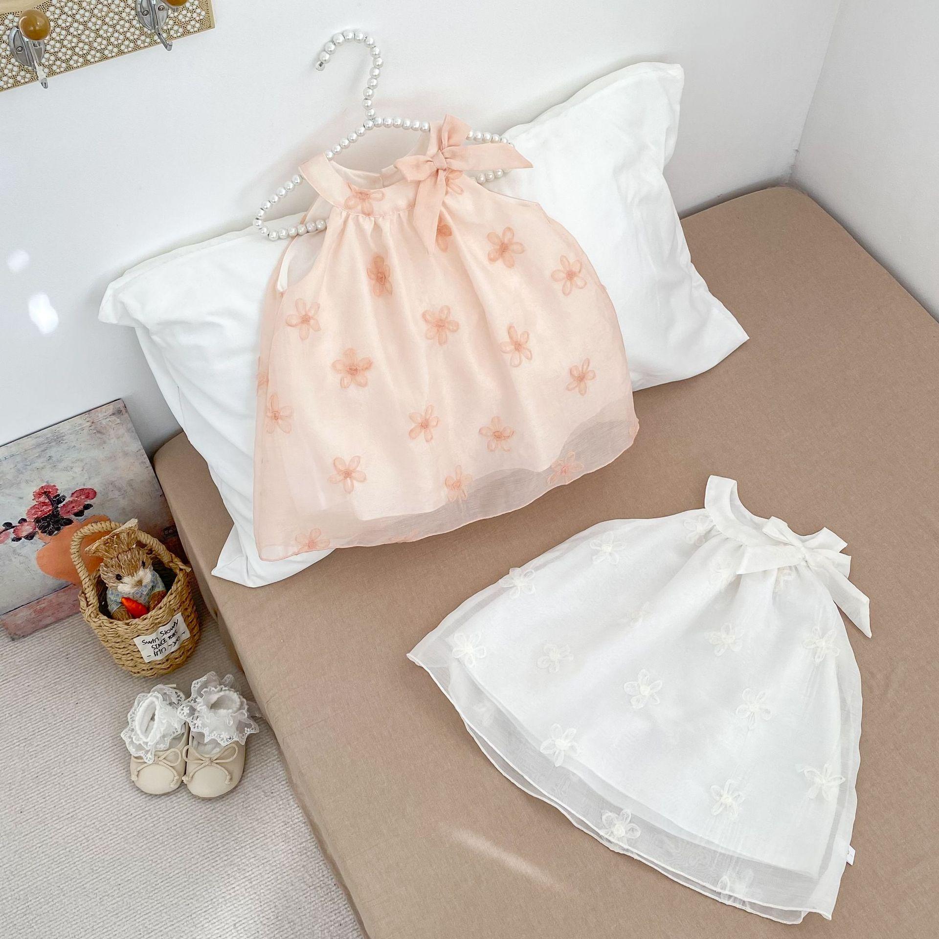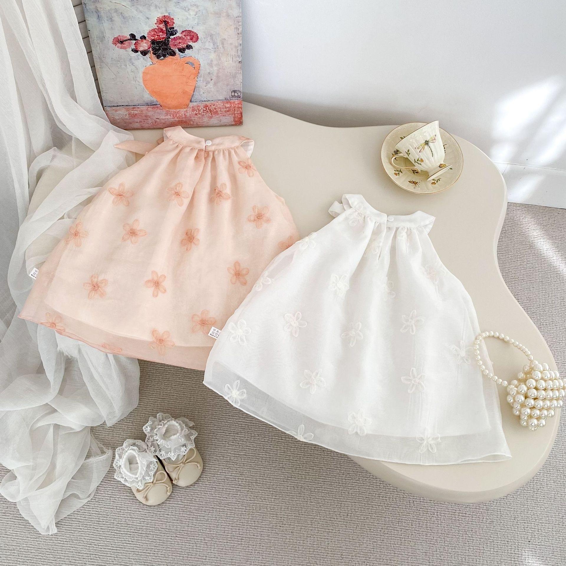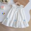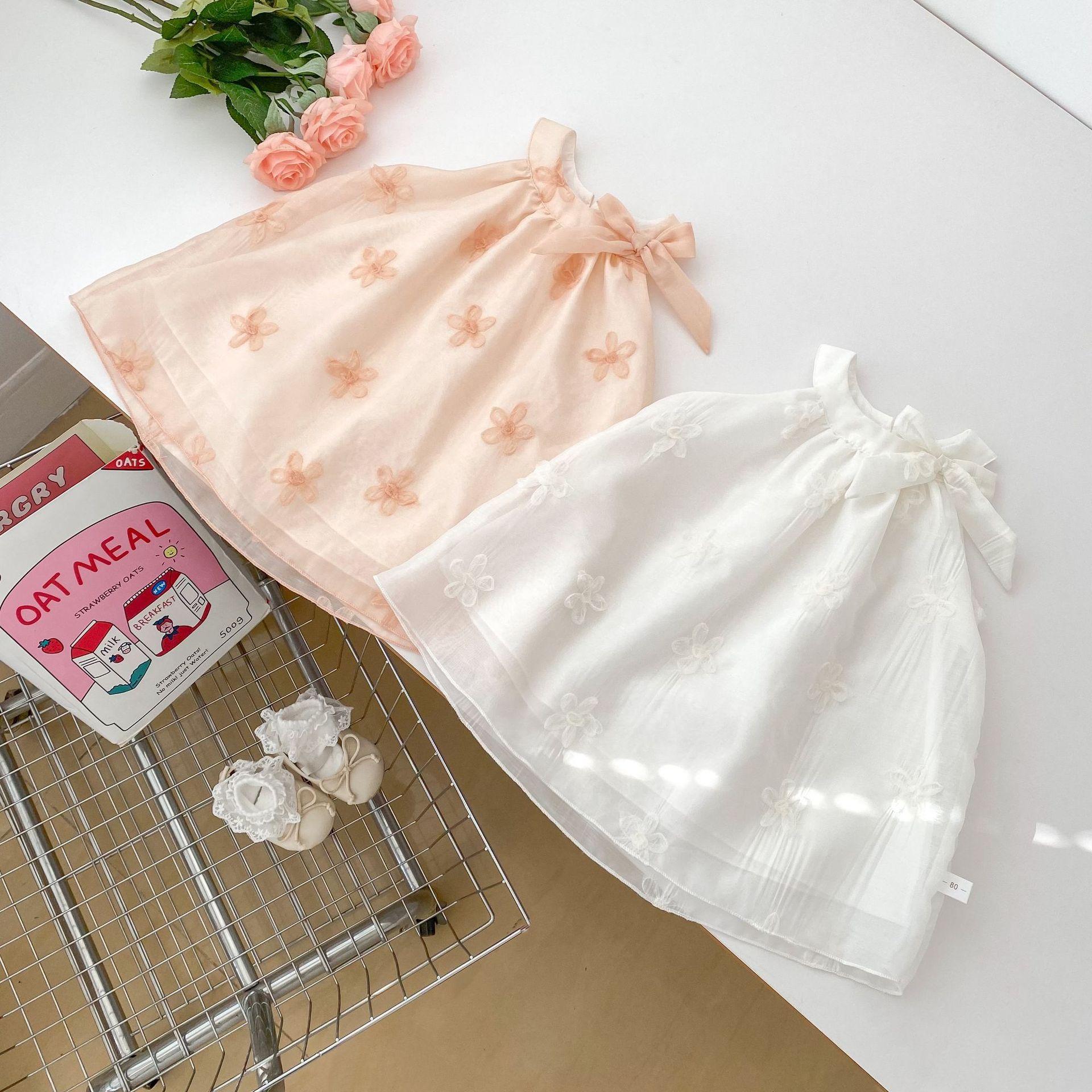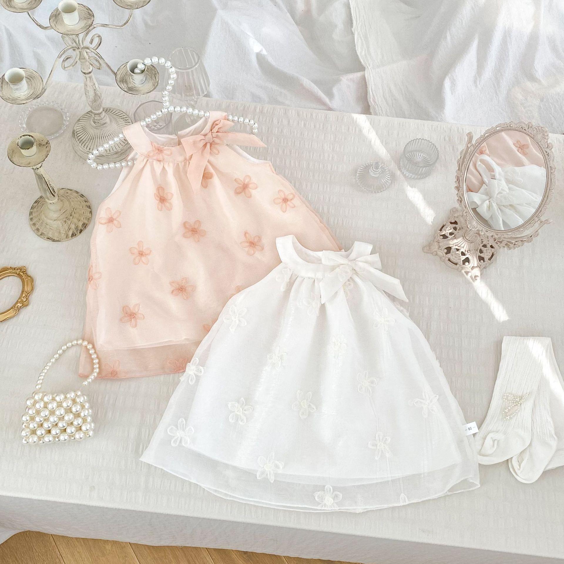 Vestido elegante sin mangas para niñas, nuevo vestido de verano a la moda para bebés, falda de malla bordada con lazo, vestido de princesa