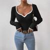 Suéter de cuello en V de alta calidad ajustado de manga larga para mujer, diseño de otoño, nicho, color sólido, corte ajustado, top camisa básica
