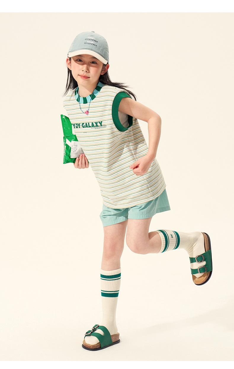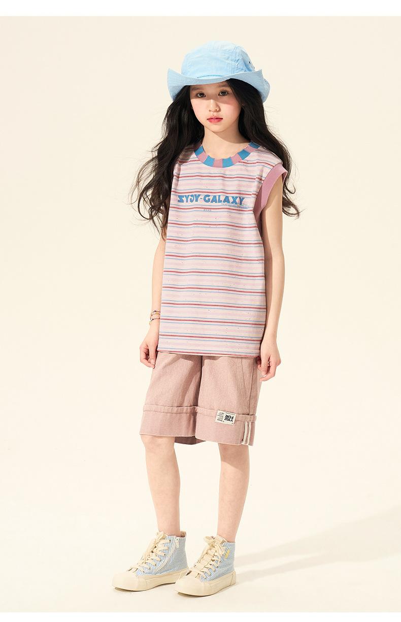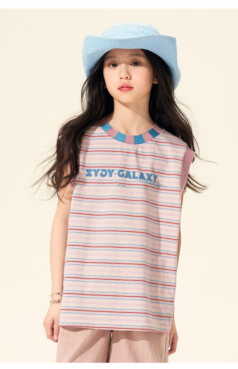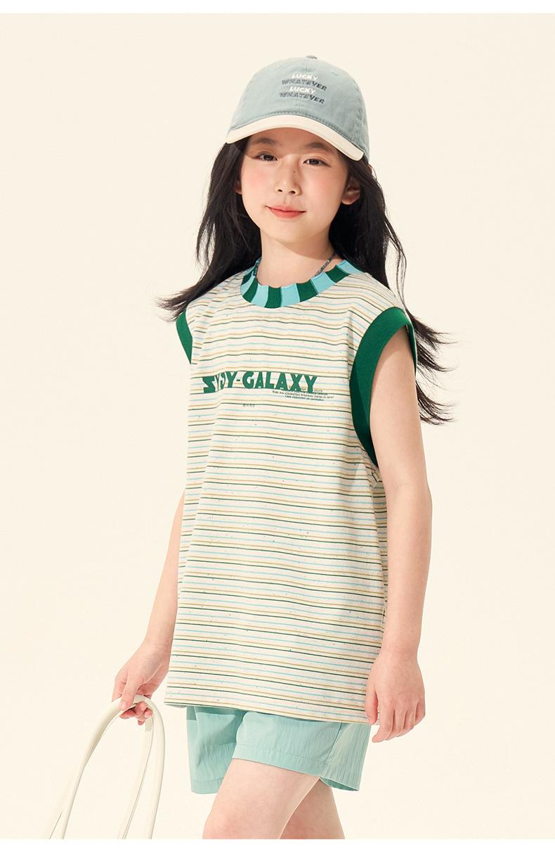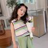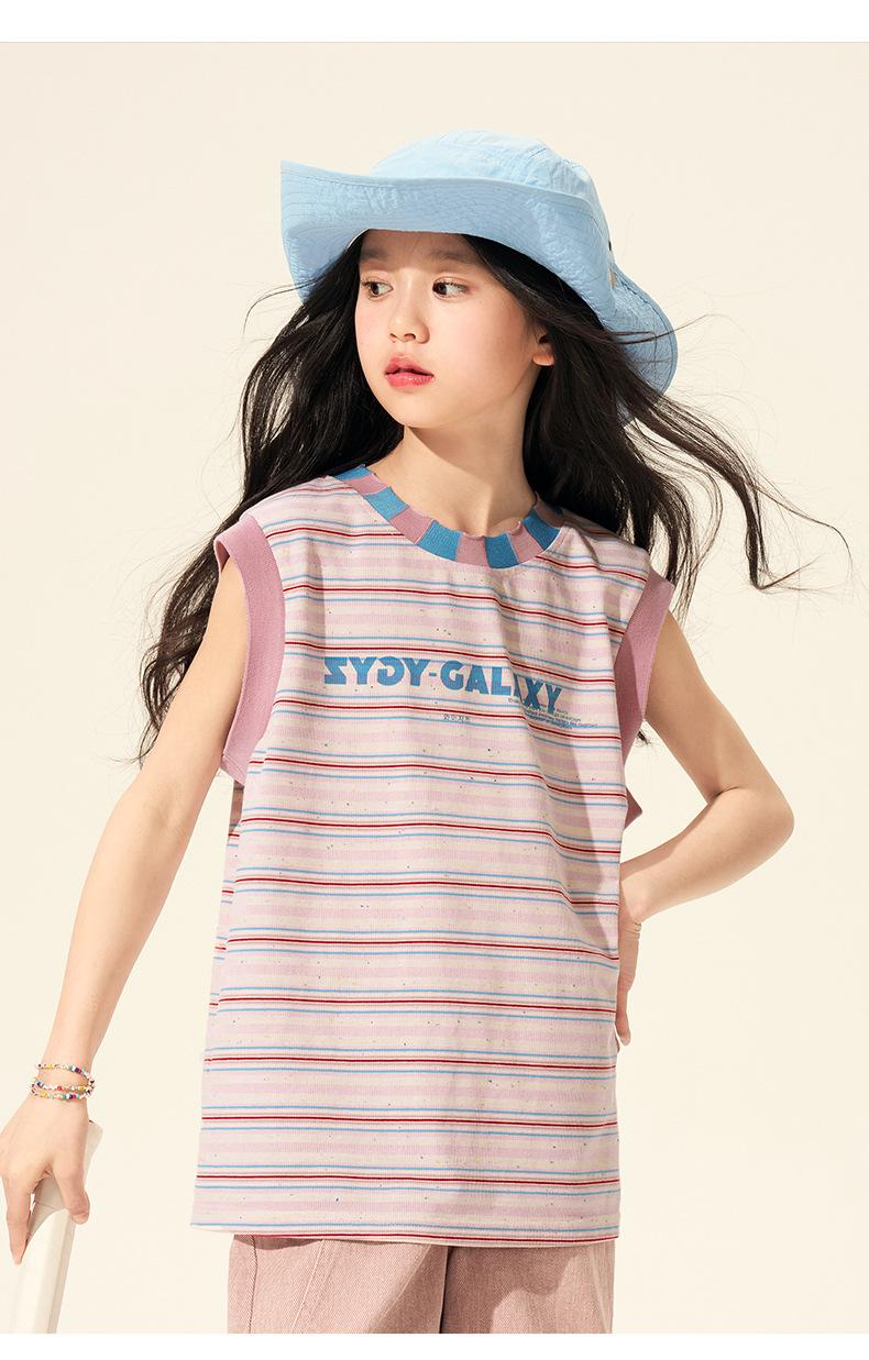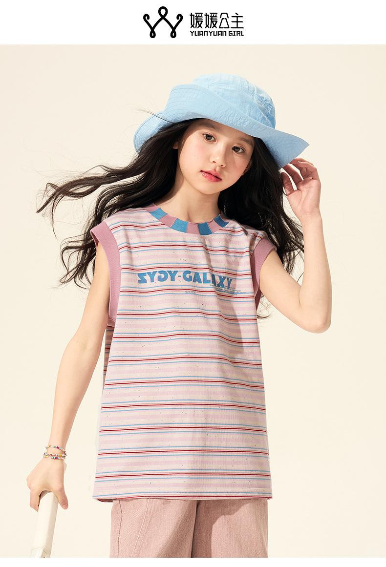 Playera para Niñas 2025 Verano Nuevo Estilo Coreano Niños Medianos-Grandes Elegante Niña Rayas Color de Contraste Sin Mangas Chaleco Casual