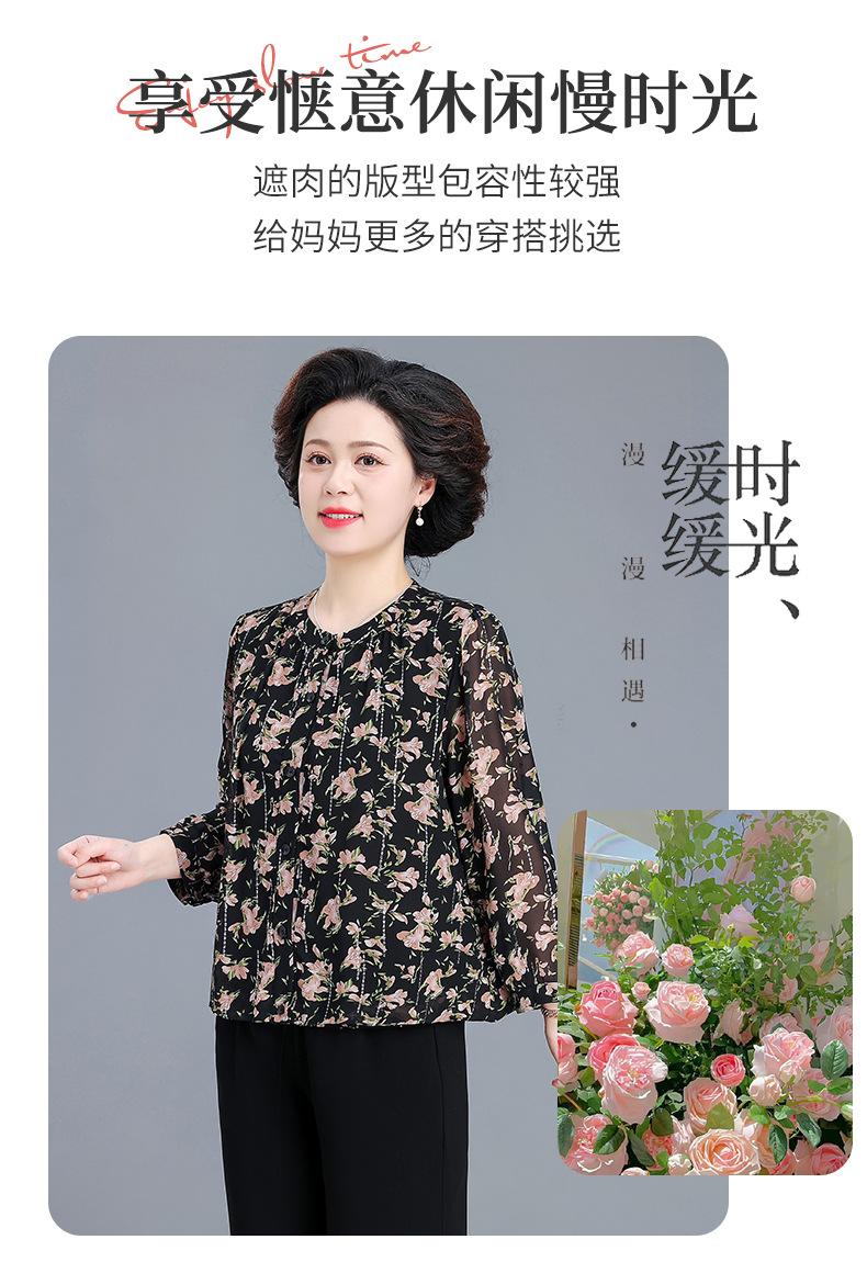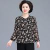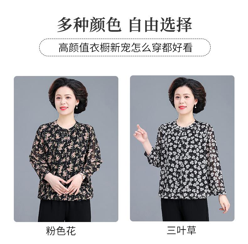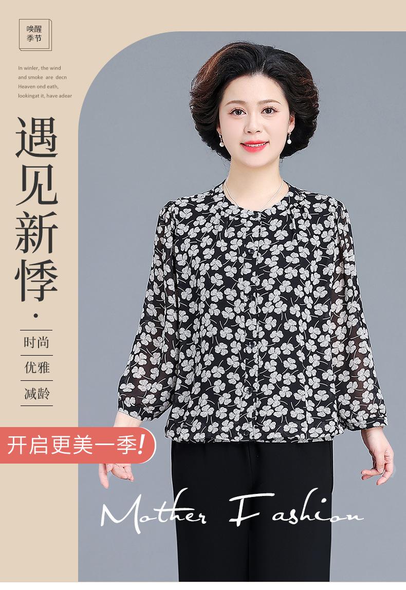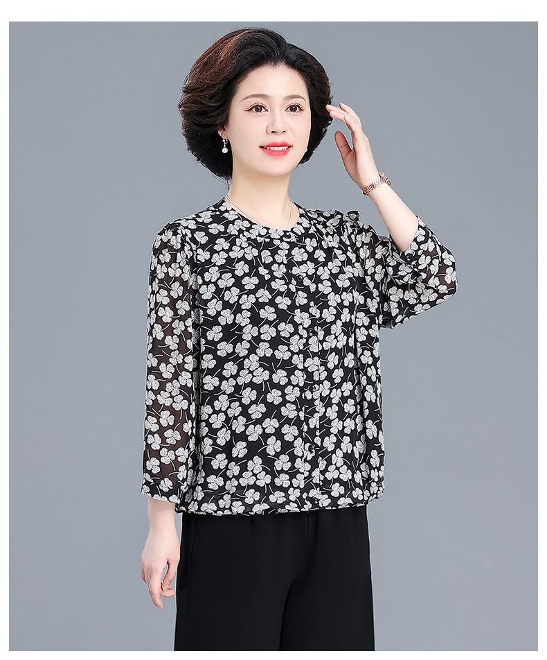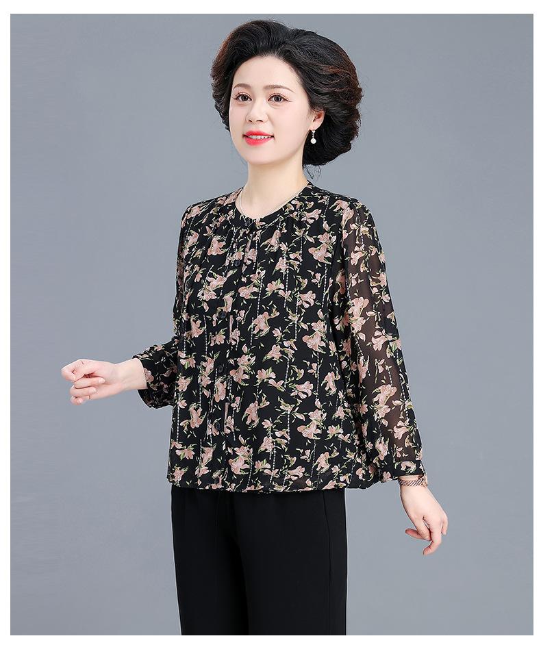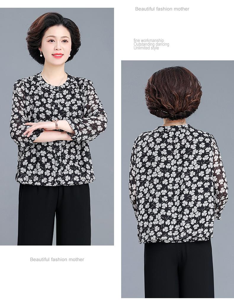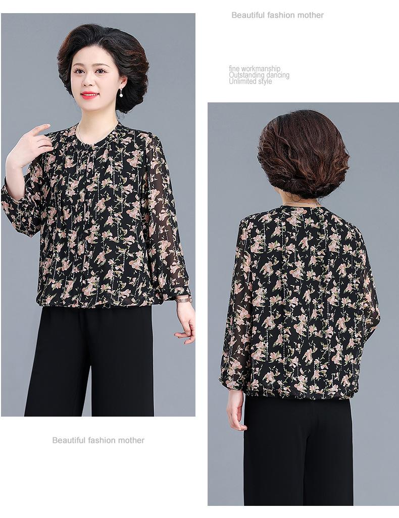 Camisa de gasa estilo primavera para mamá 2025 nueva para mujeres de mediana edad y mayores, top floral de manga larga para primavera y verano, conjunto de dos piezas