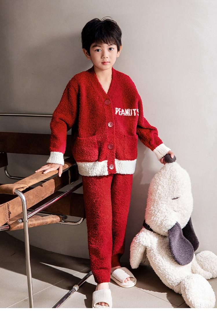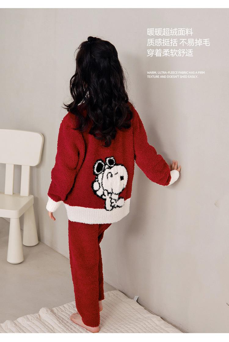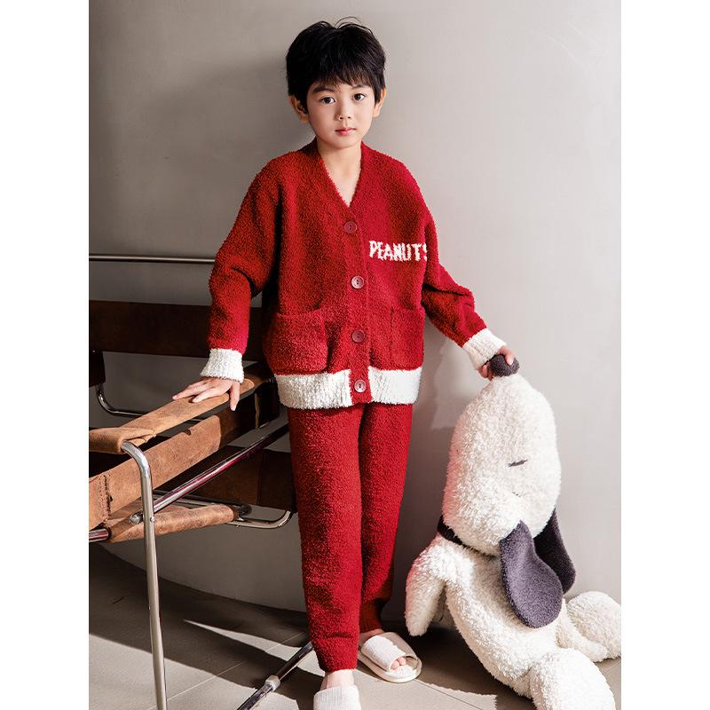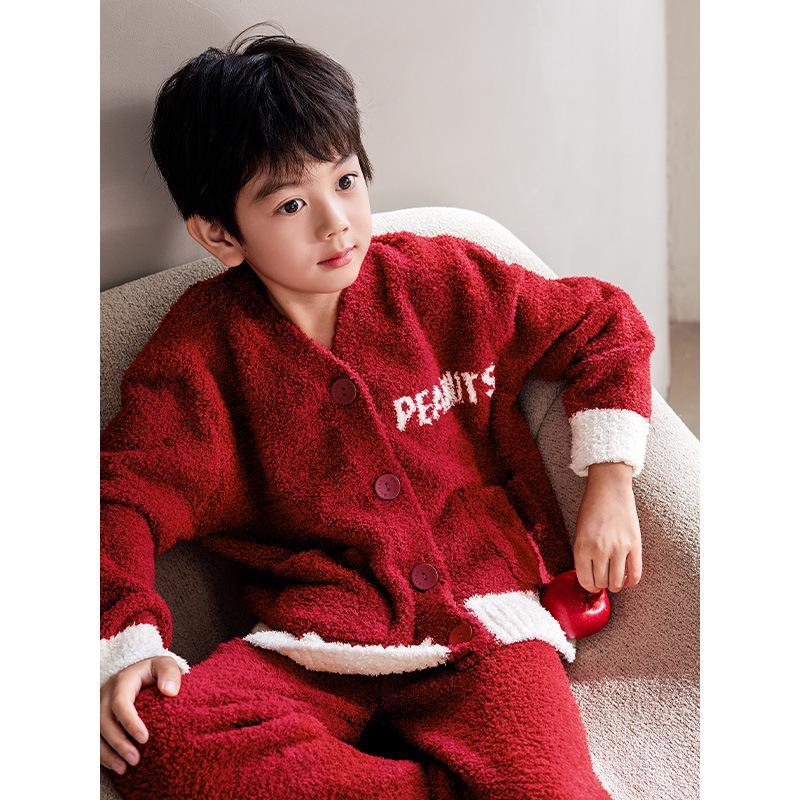 Pijama de Invierno de Terciopelo Rojo para Niños, Dibujos Animados Snoopy, Conjunto Cálido de Ropa para el Hogar para Niños y Niñas