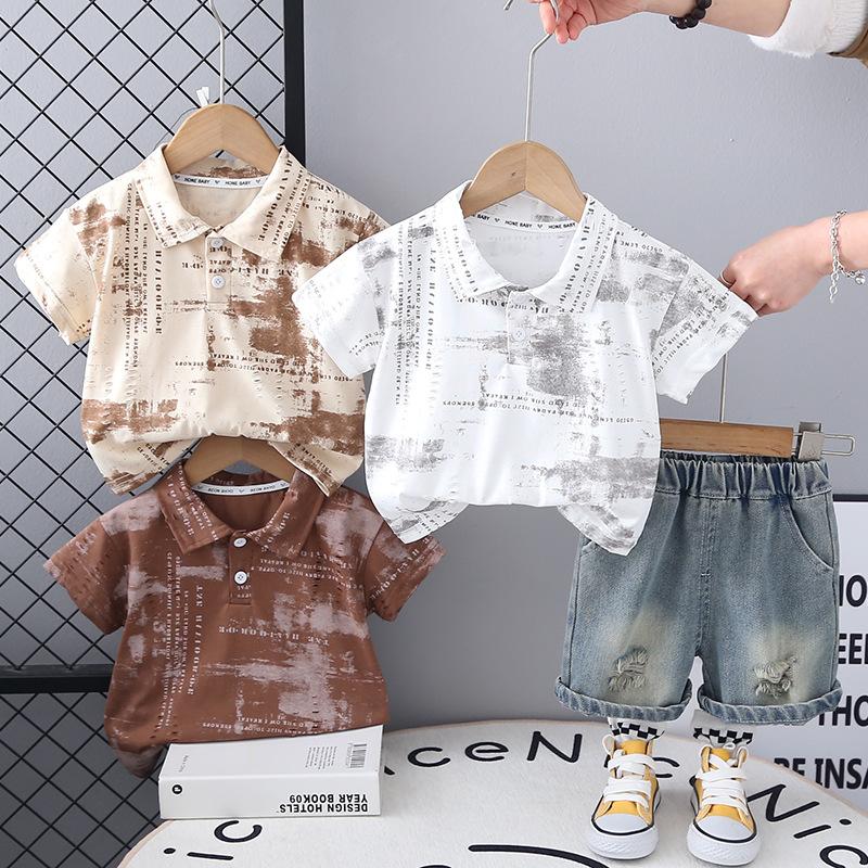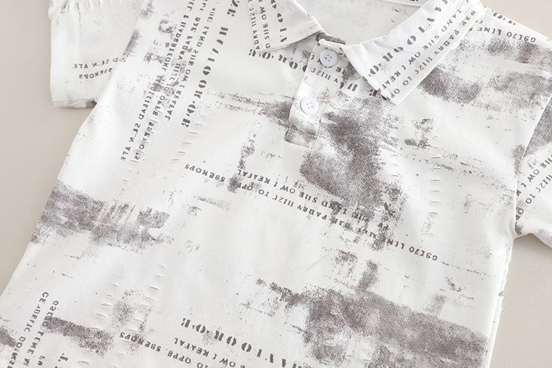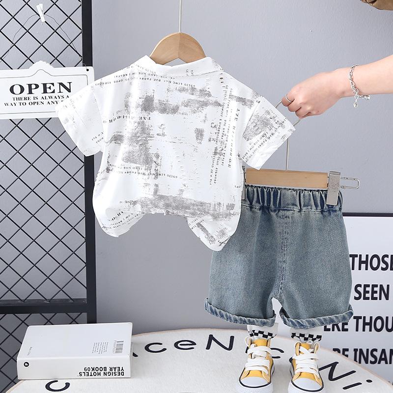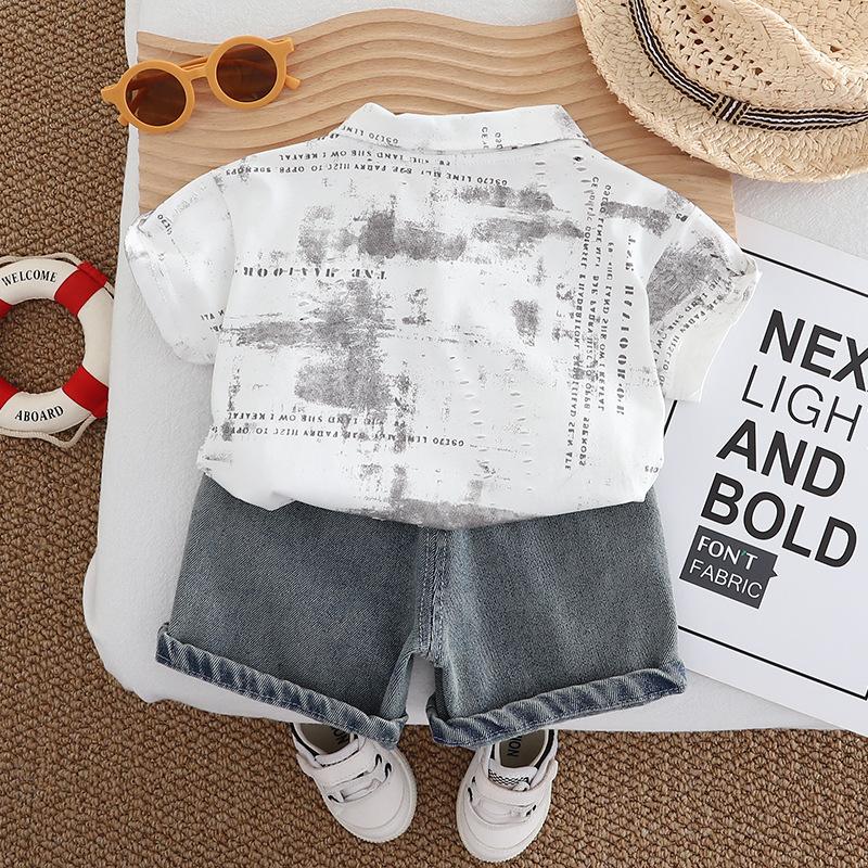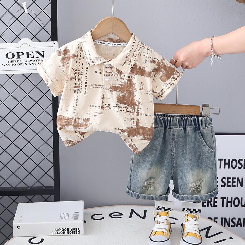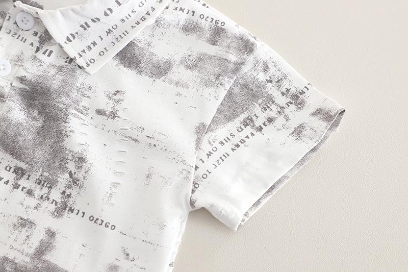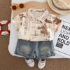Ropa Infantil de Comercio Exterior al Por Mayor 2025 Verano Nuevo Estilo Traje Guapo de Solapa con Estampado Completo para Niño Pantalones Cortos de Mezclilla Suave para Niños