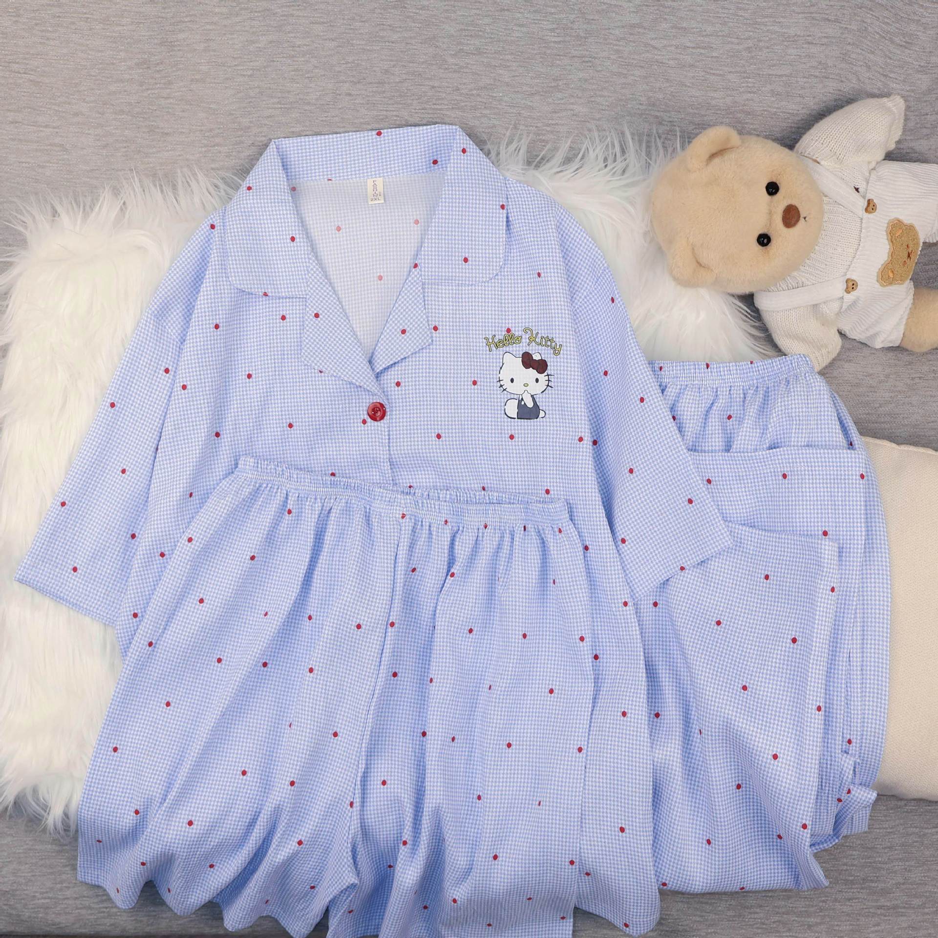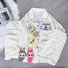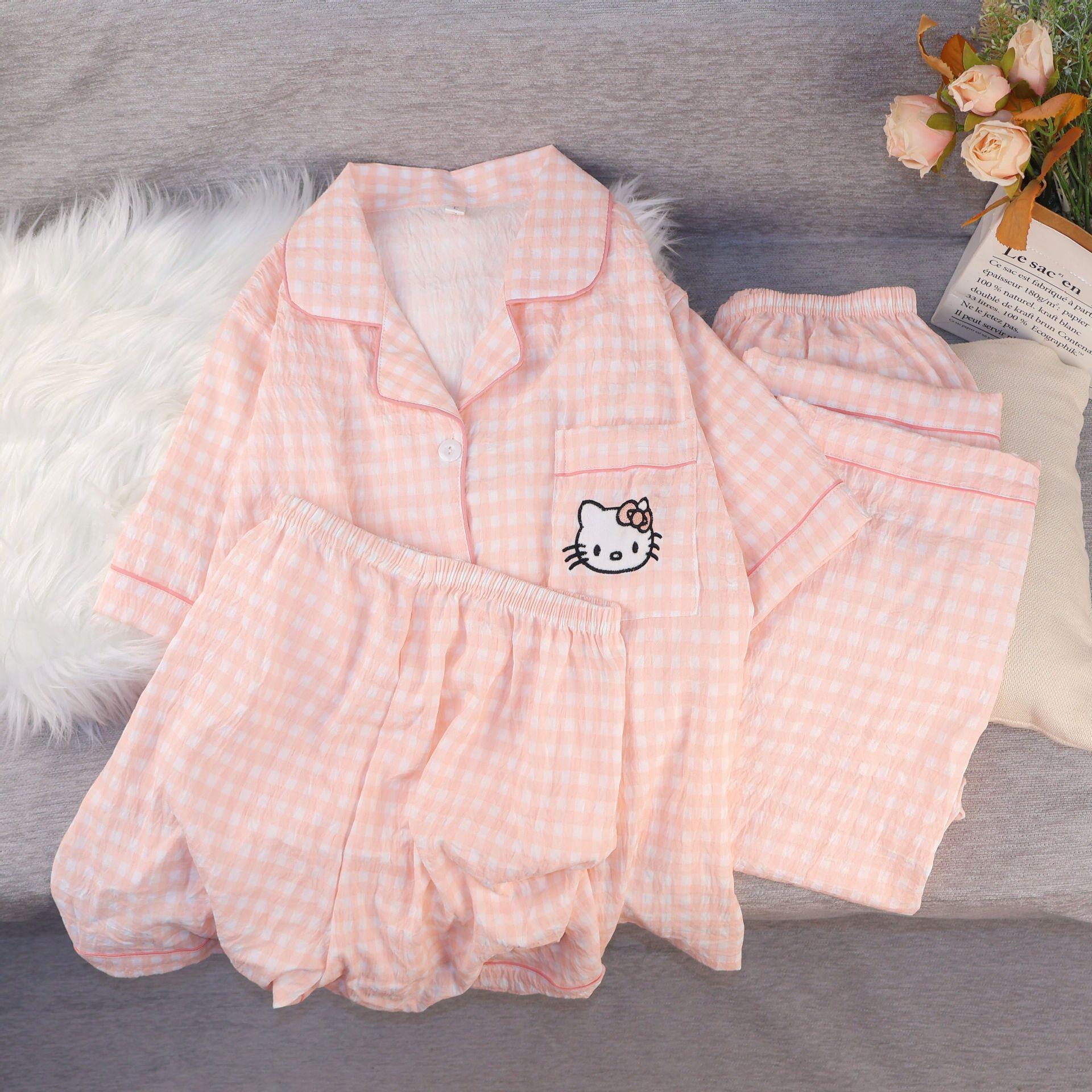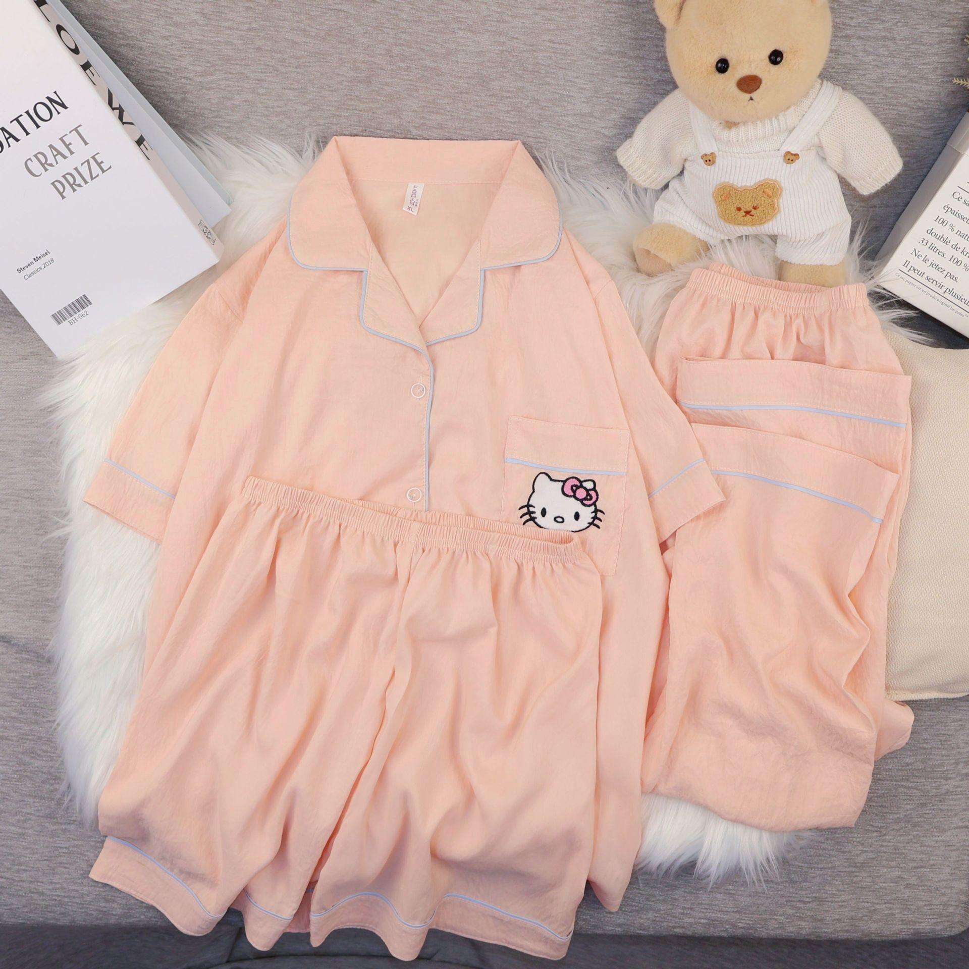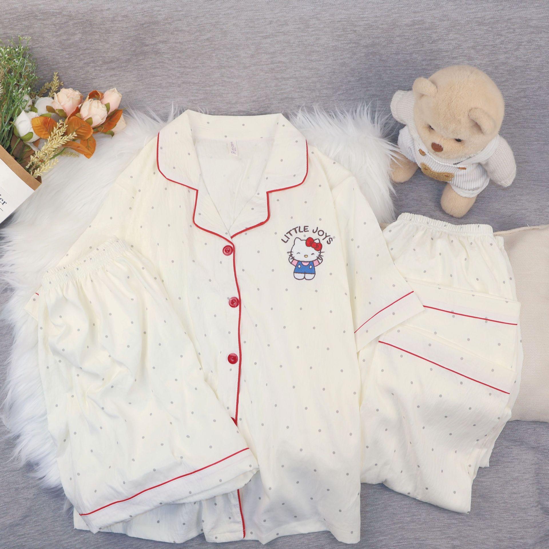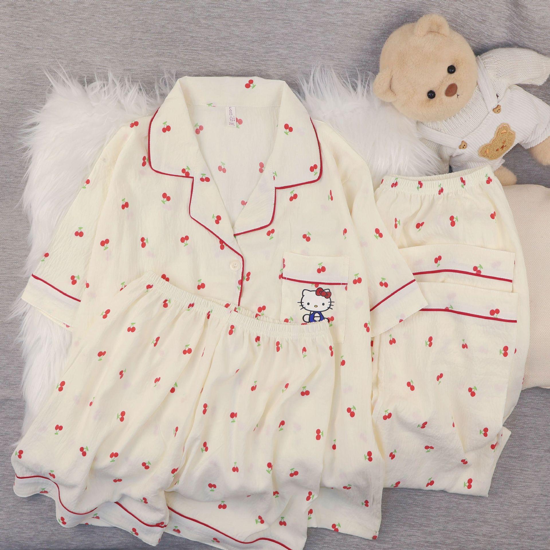 Algodón Nube Nuevo Dibujo Animado Pijama de Tres Piezas para Mujer Dulce Lindo Manga Corta Shorts Traje Ropa para el Hogar Cárdigan Solapa