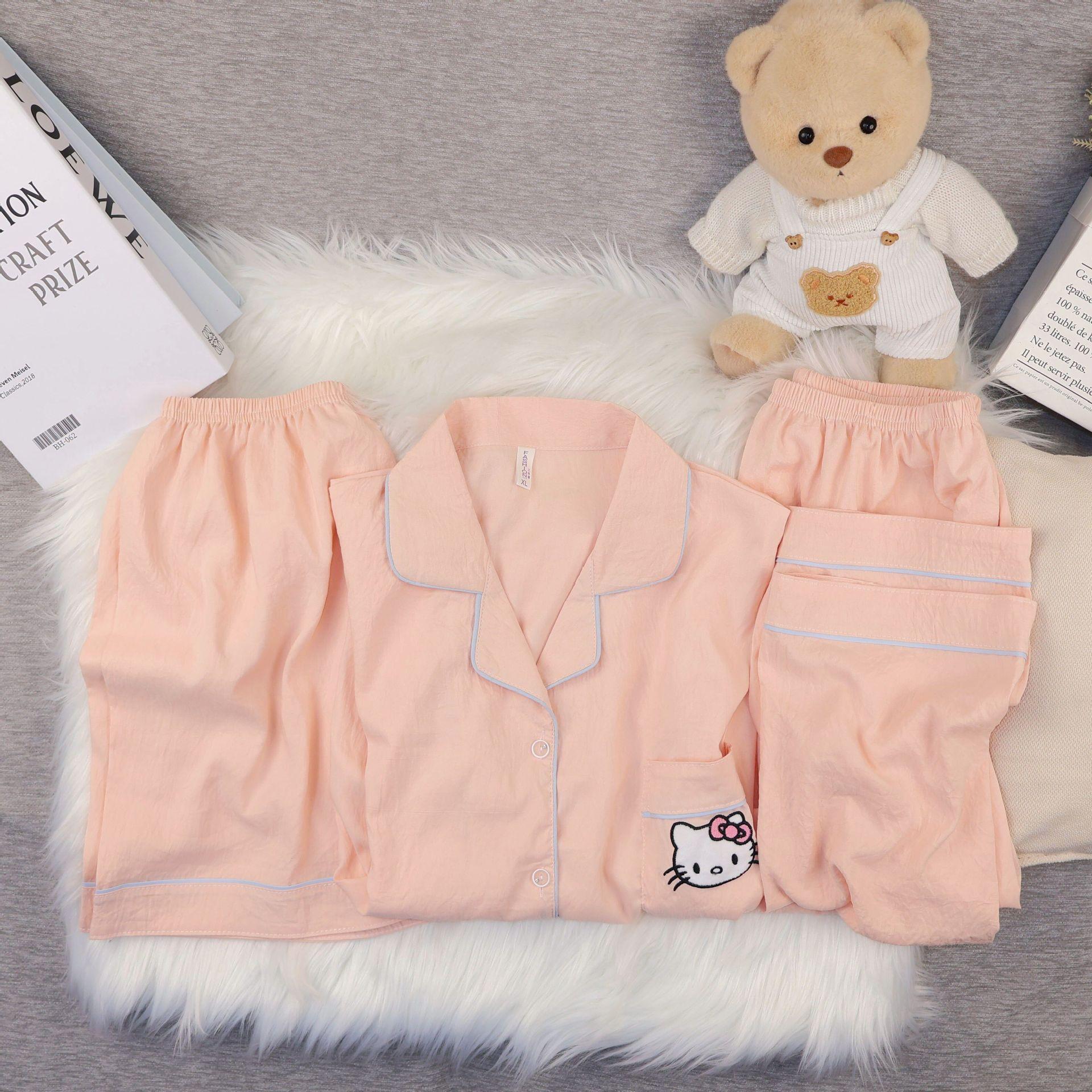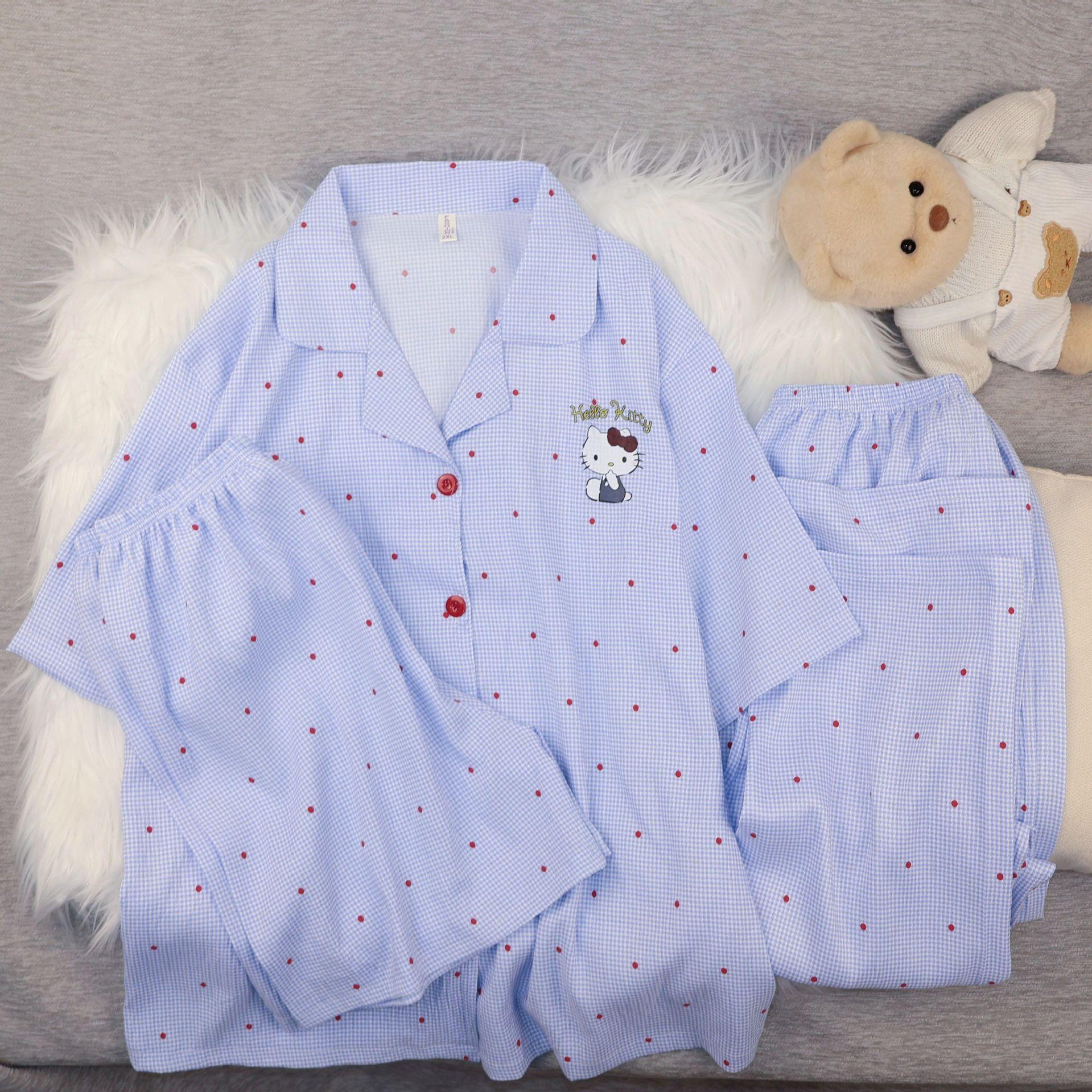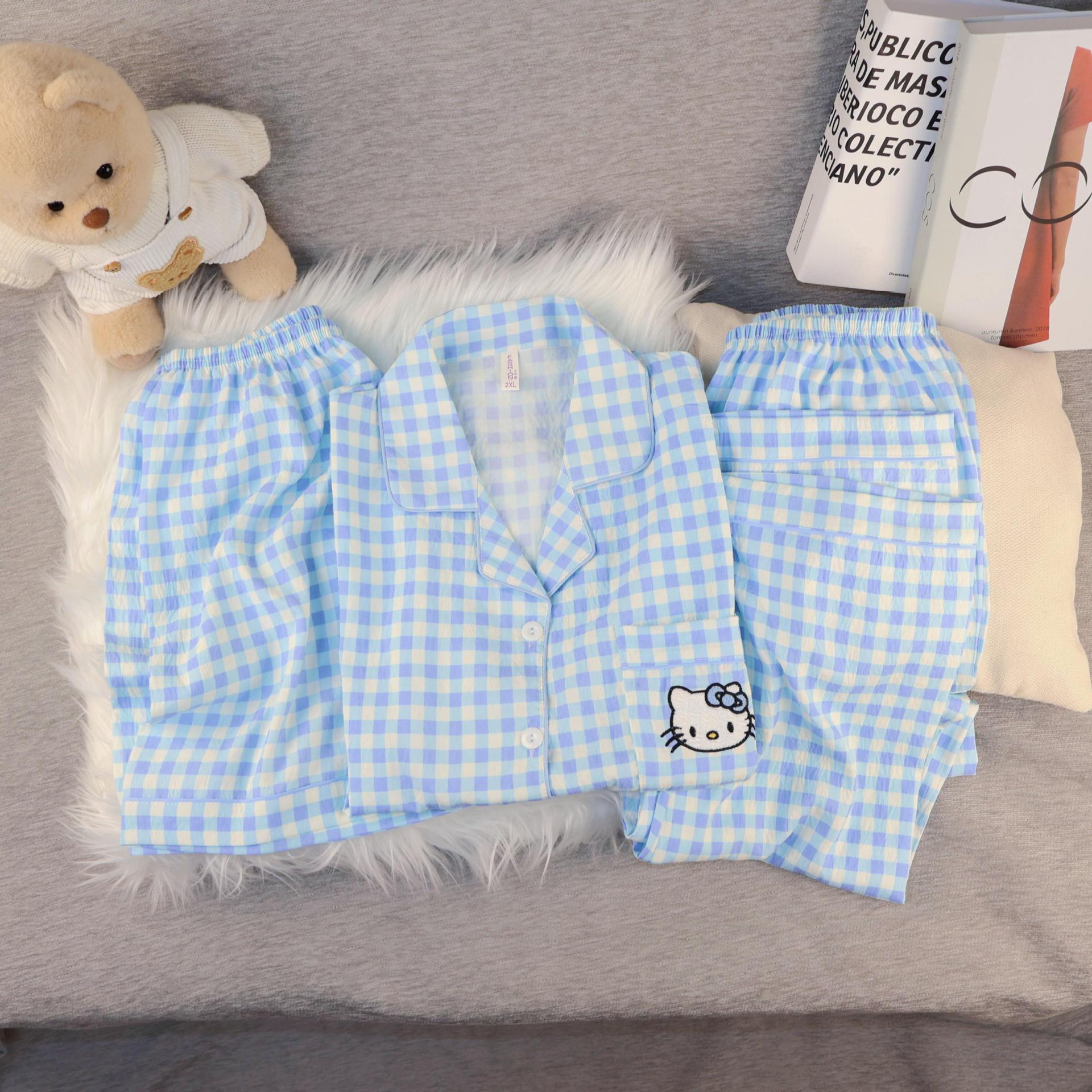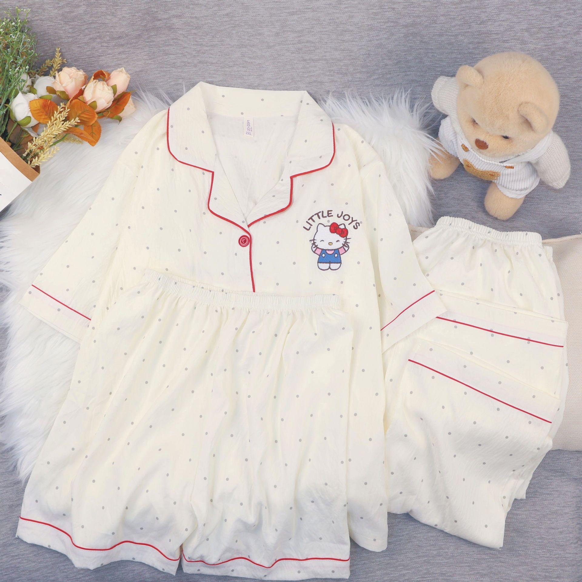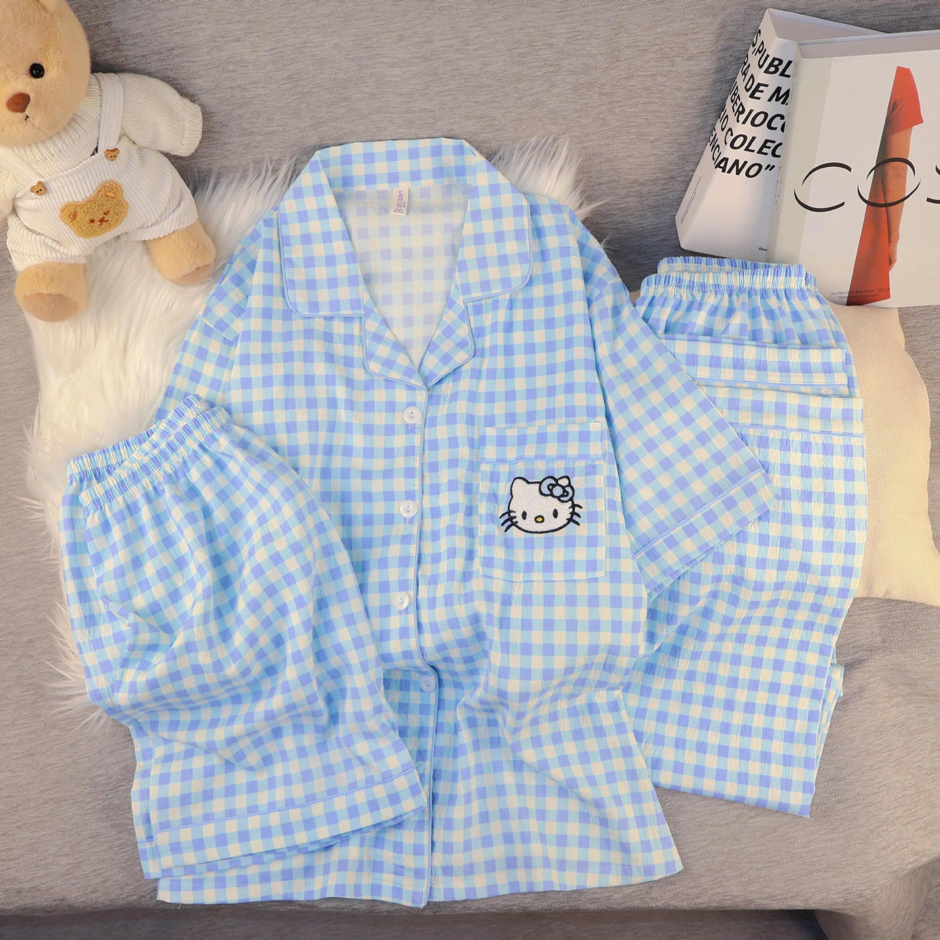 Algodón Nube Nuevo Dibujo Animado Pijama de Tres Piezas para Mujer Dulce Lindo Manga Corta Shorts Traje Ropa para el Hogar Cárdigan Solapa