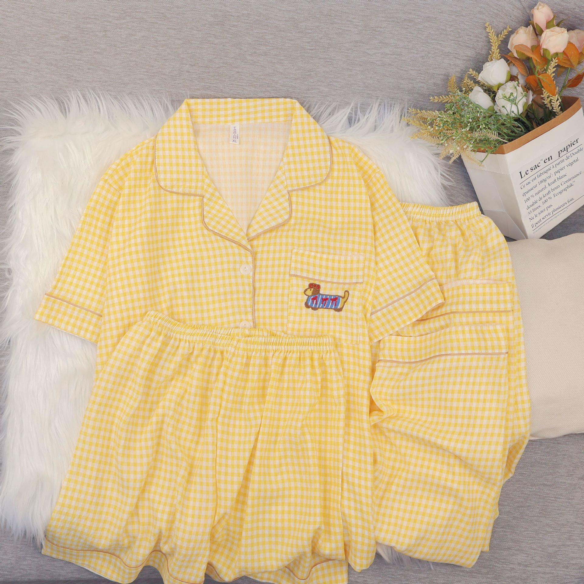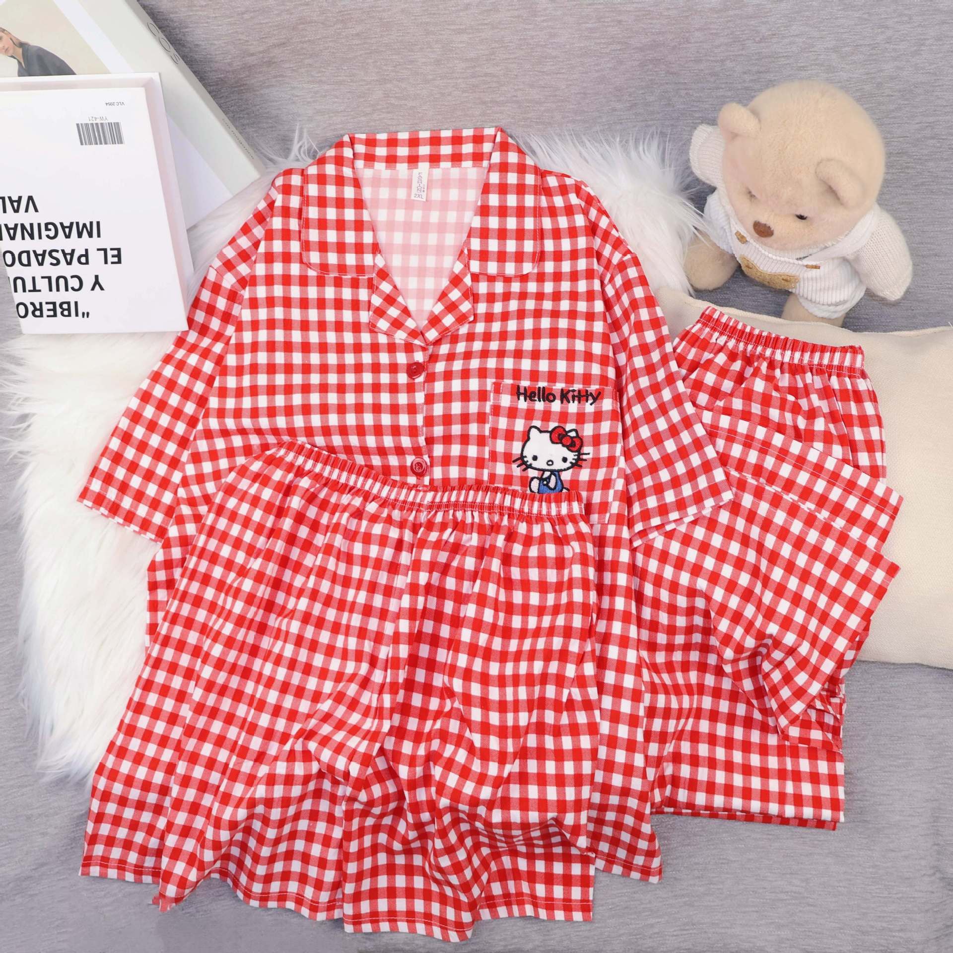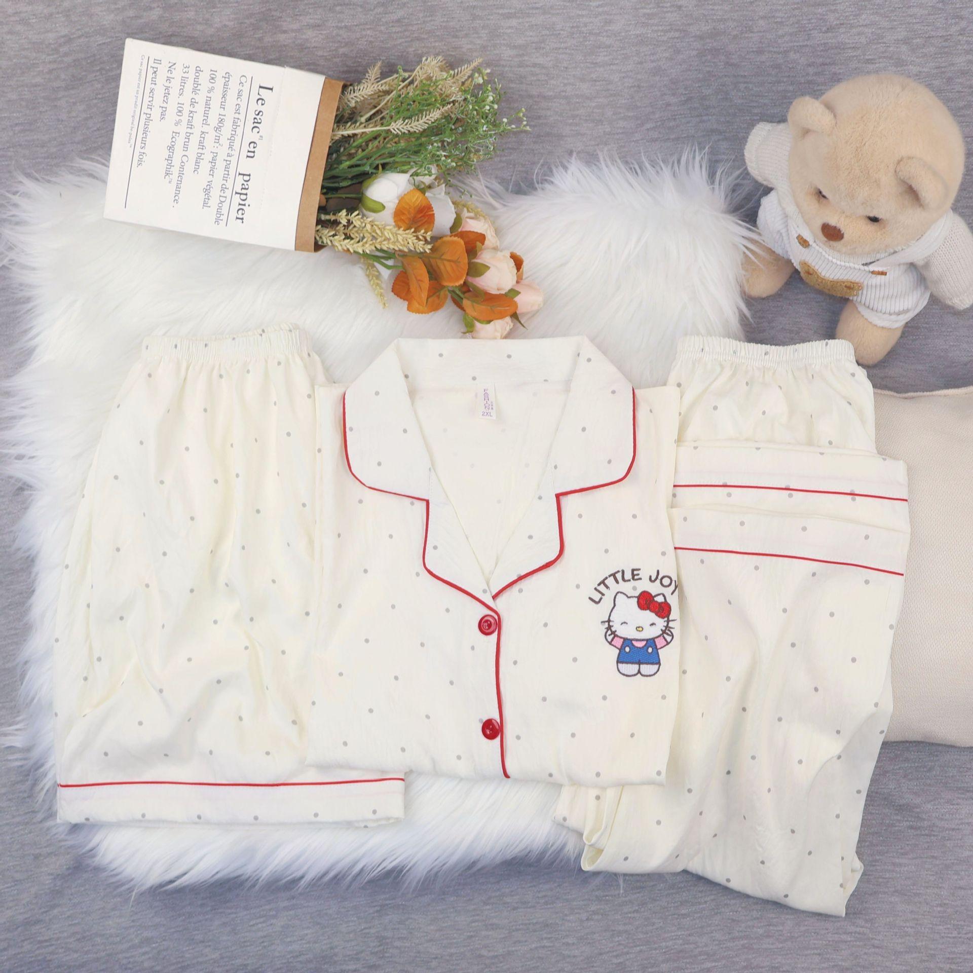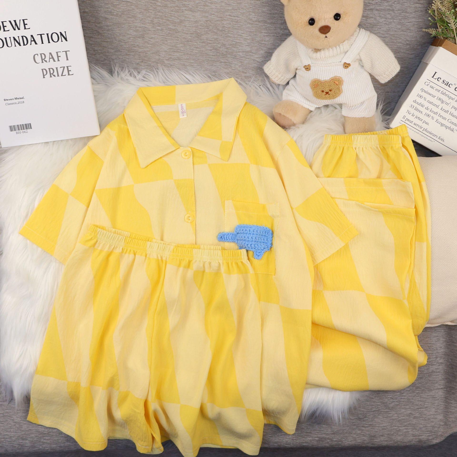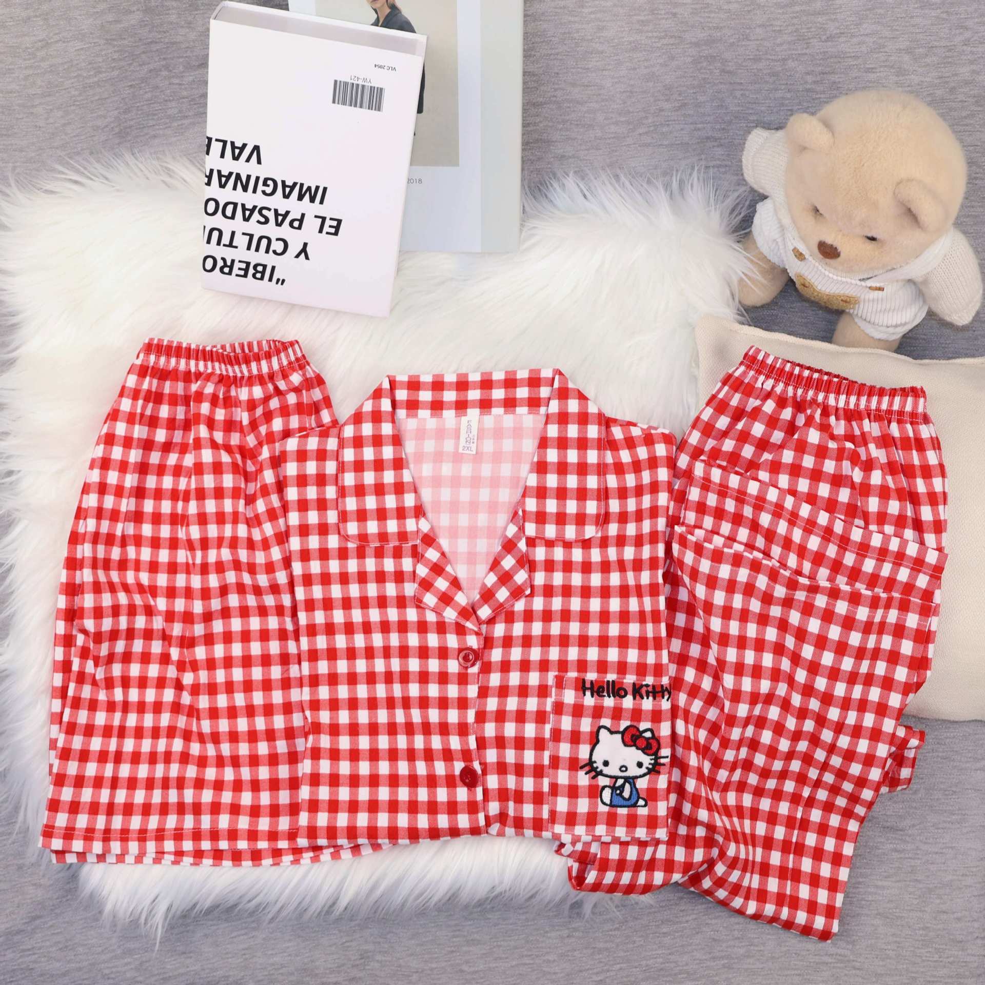 Algodón Nube Nuevo Dibujo Animado Pijama de Tres Piezas para Mujer Dulce Lindo Manga Corta Shorts Traje Ropa para el Hogar Cárdigan Solapa