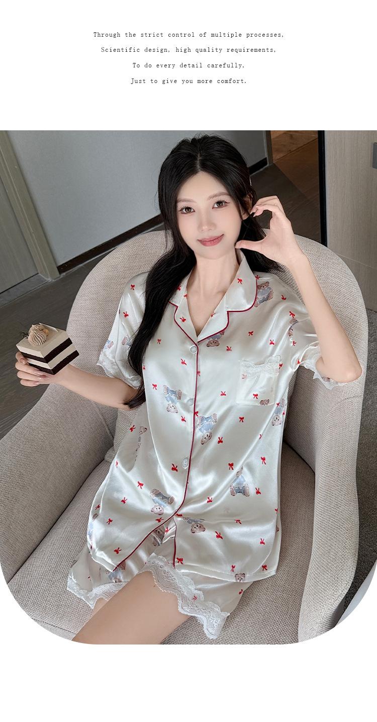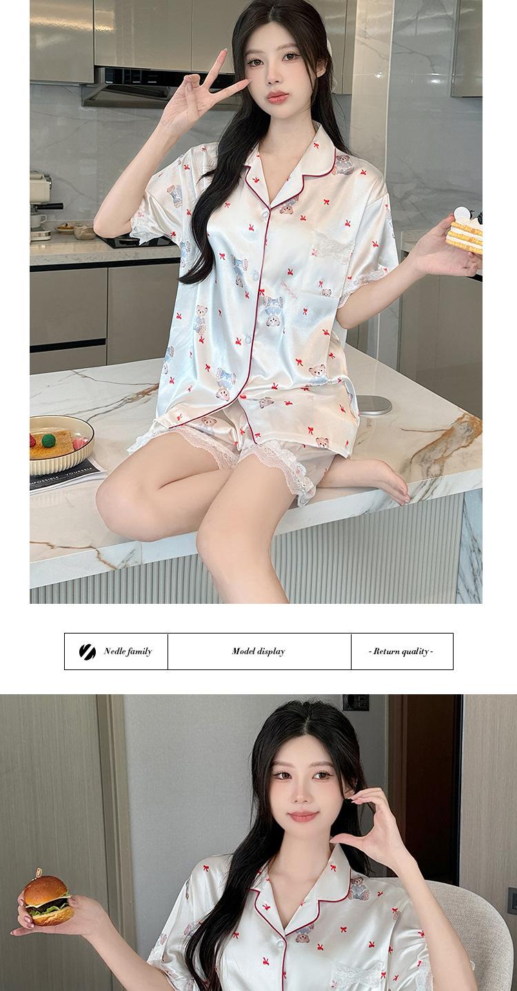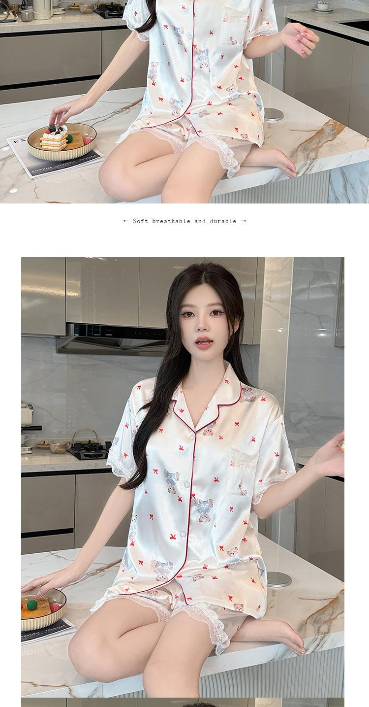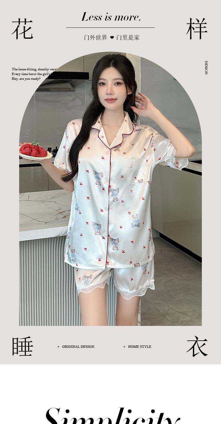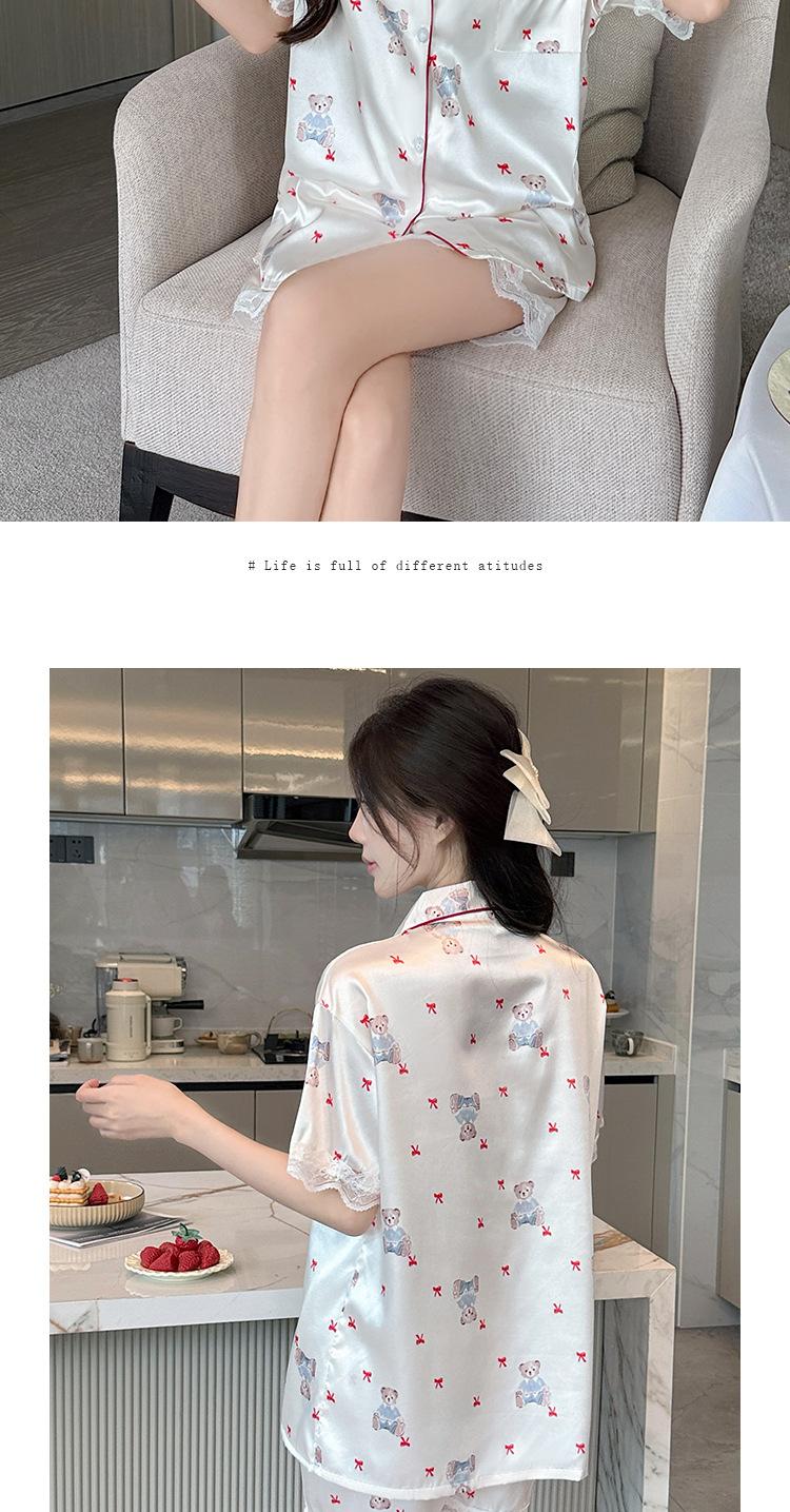 Pijama Estampado de Niña Coreana Mujer Verano Nuevo Dibujo Animado Casual Oso Satén Seda de Hielo Traje Ropa para el Hogar Venta al por Mayor